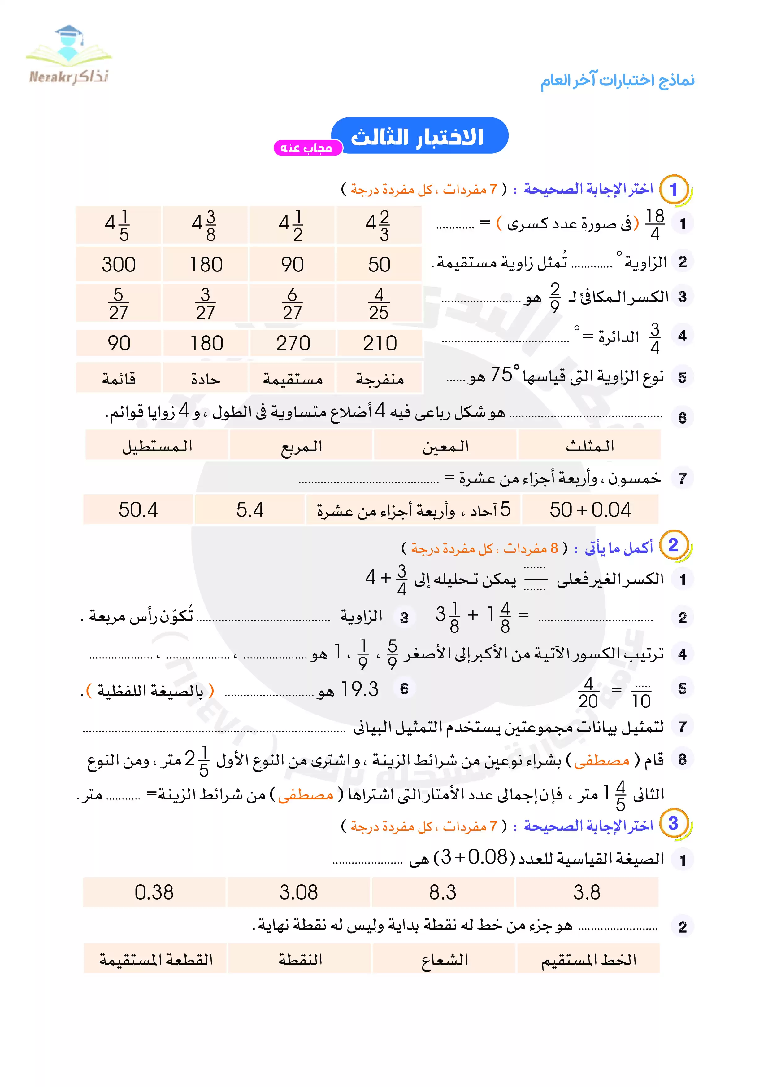 صفحة 3 من 12 صفحة من ملف: نماذج امتحانات الرياضيات للصف الرابع الابتدائي الترم الثاني من قطر الندى - Nezakr