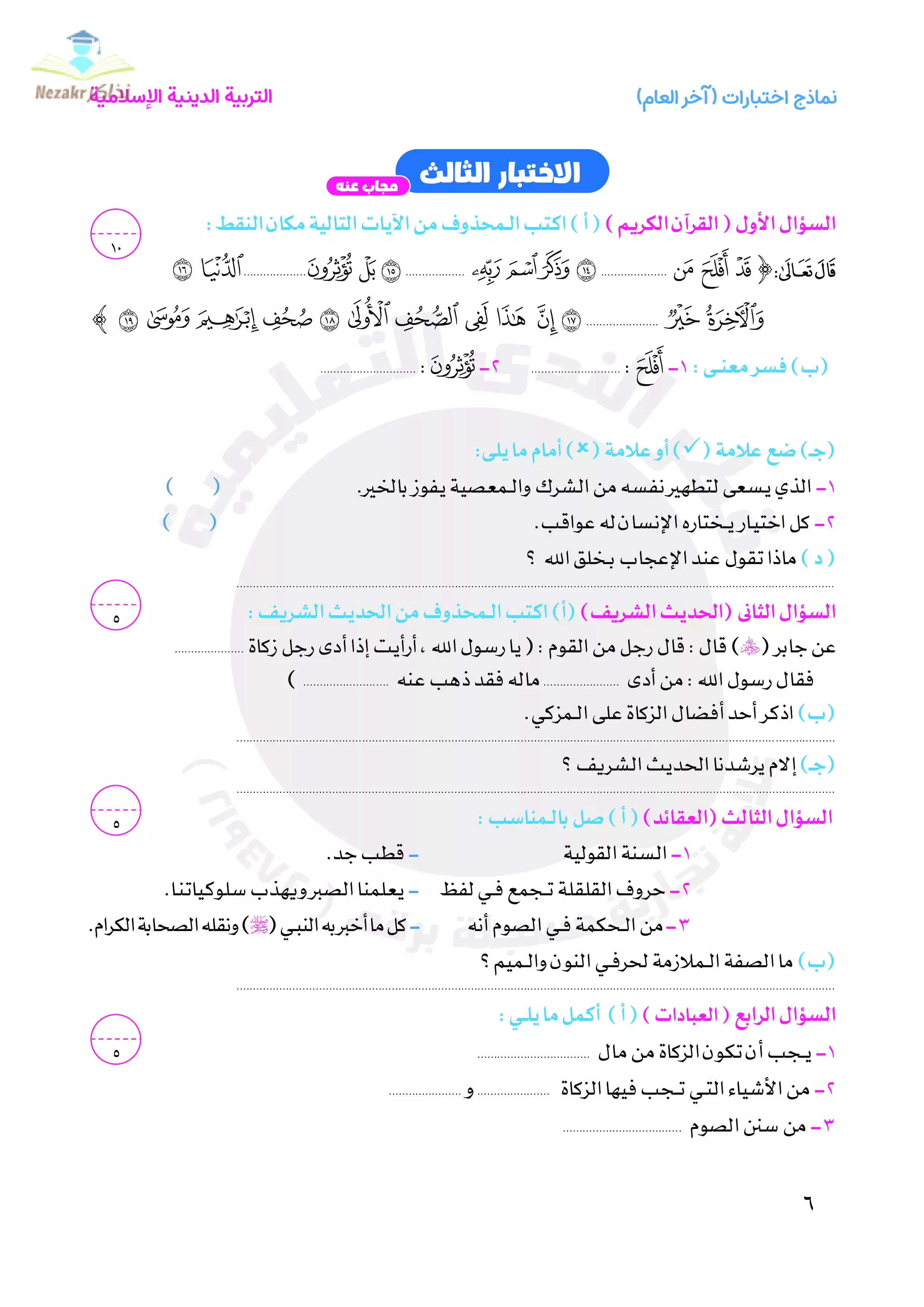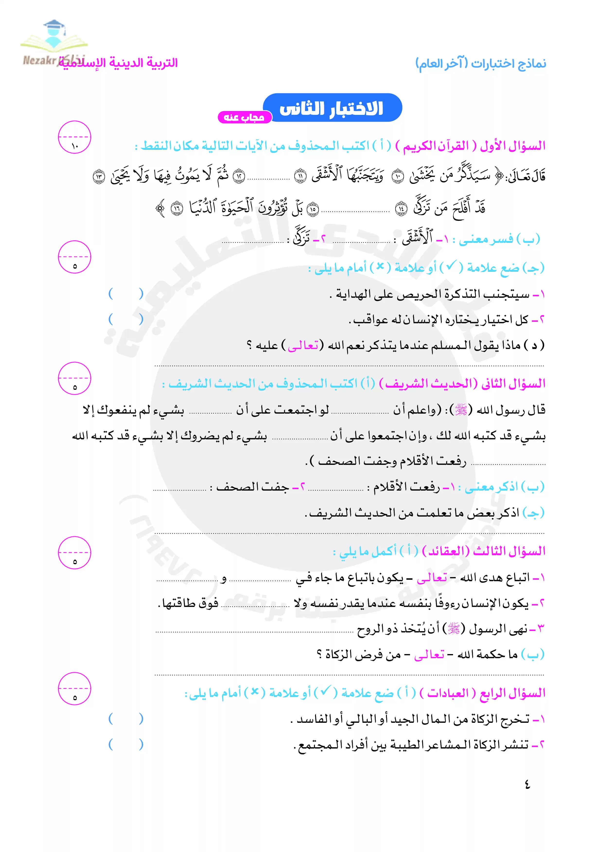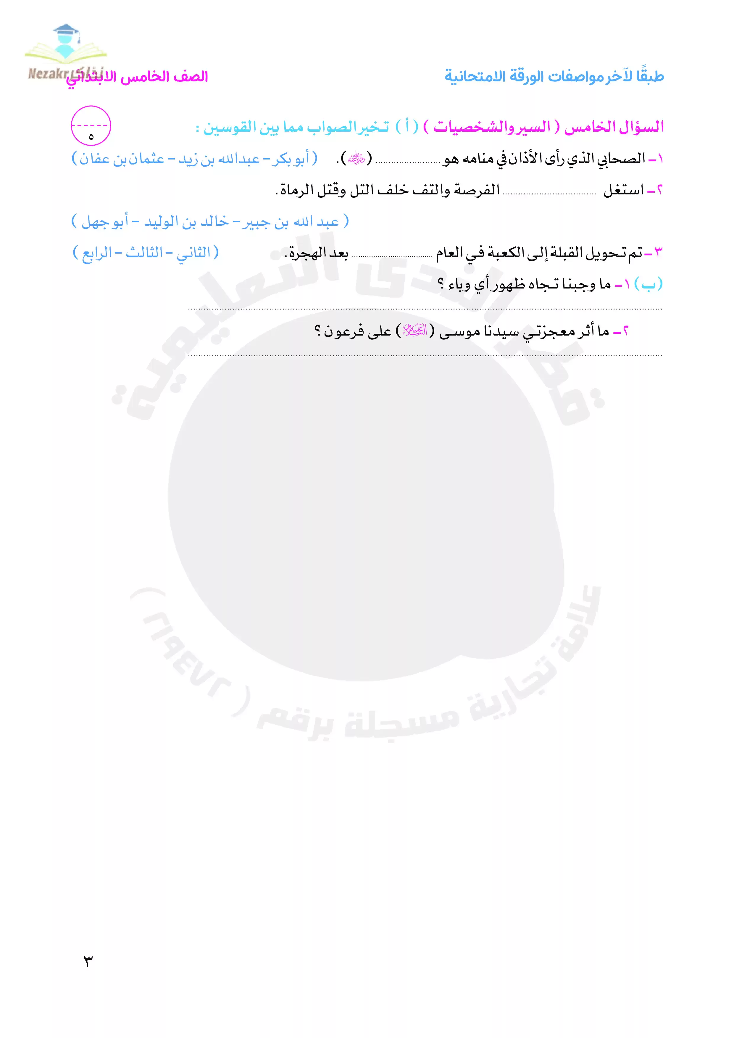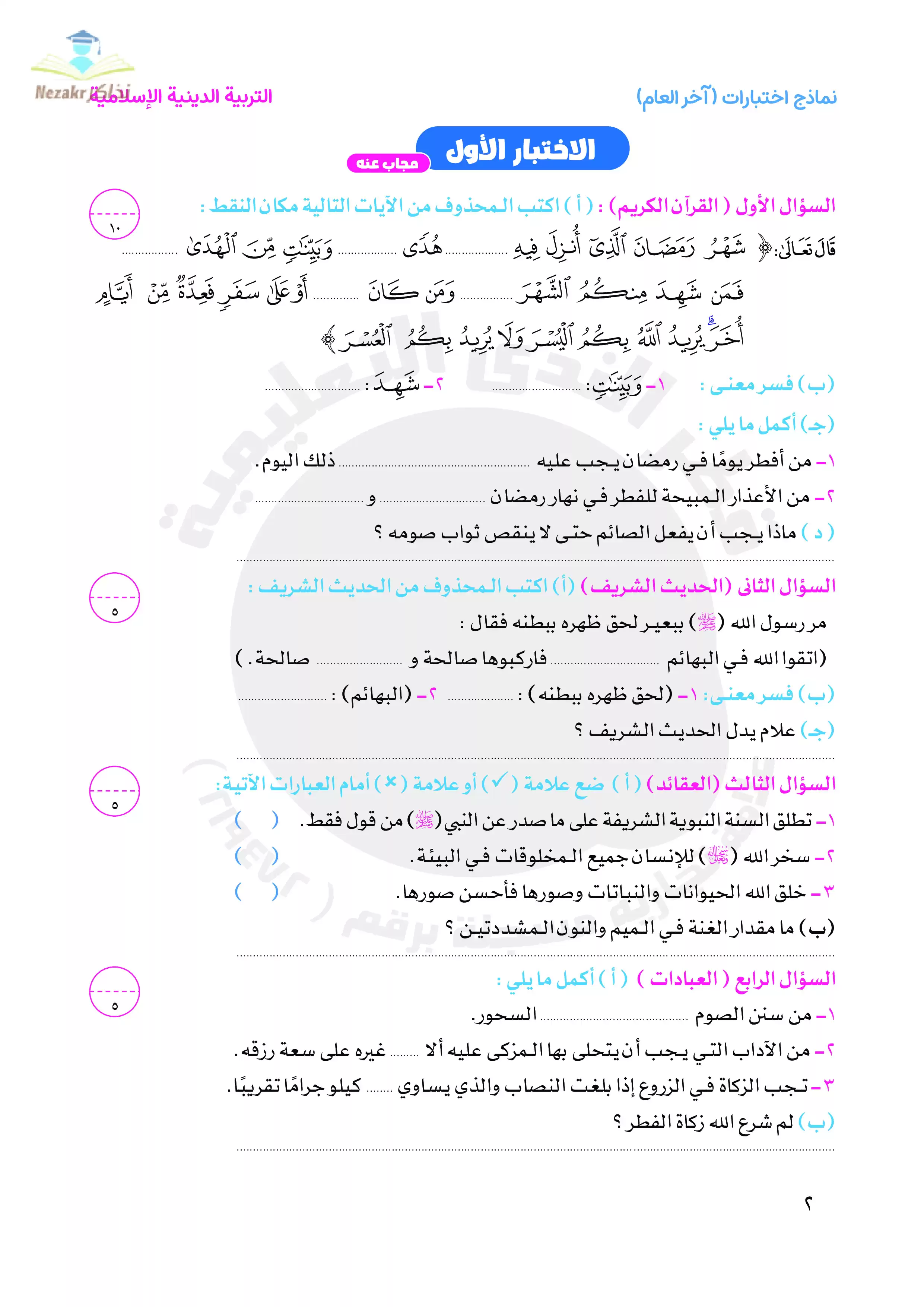 | بيانات الملف: (نماذج امتحانات التربية الدينية الإسلامية للصف الخامس الابتدائي الترم الثاني من قطر الندى - Nezakr) | |