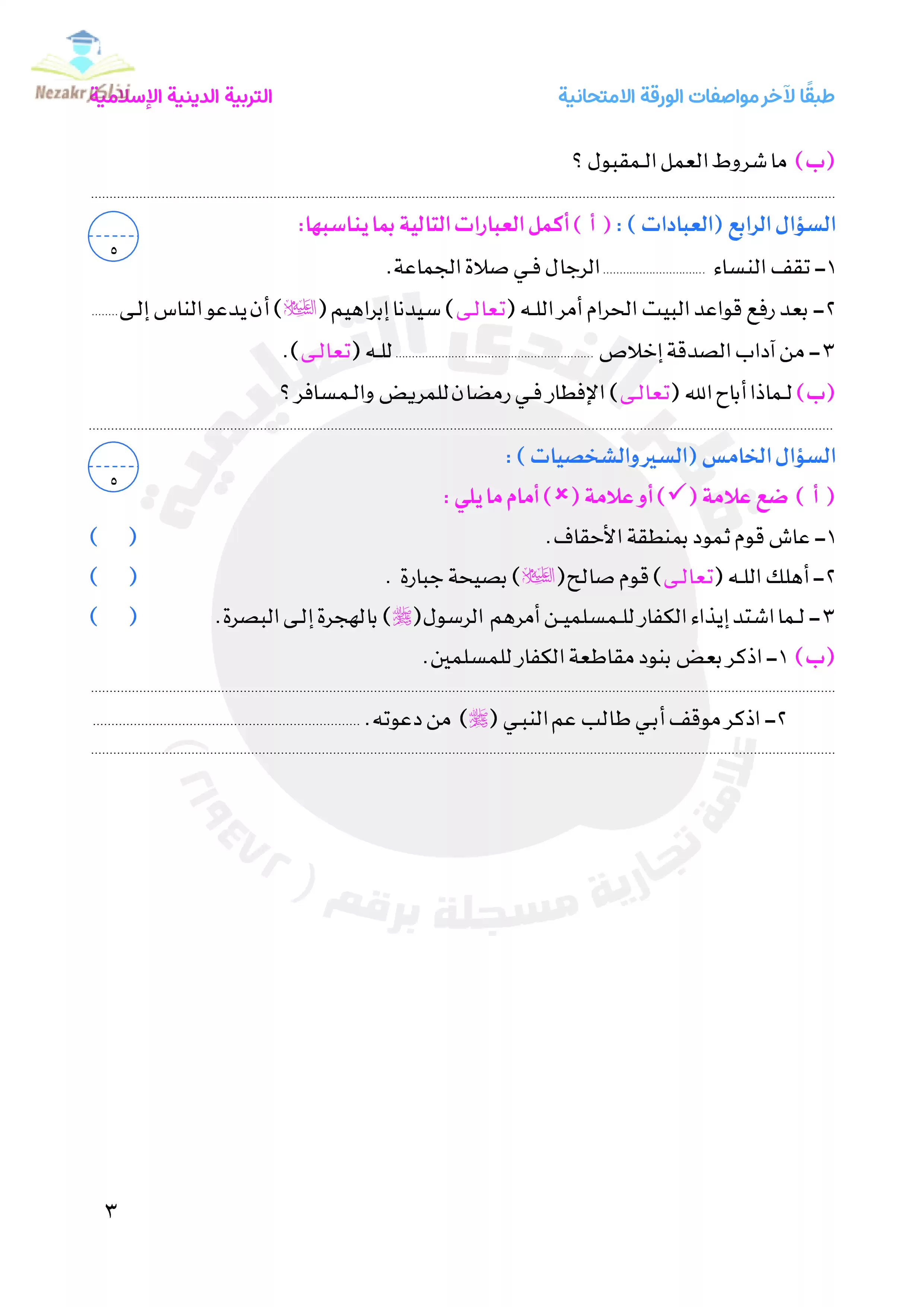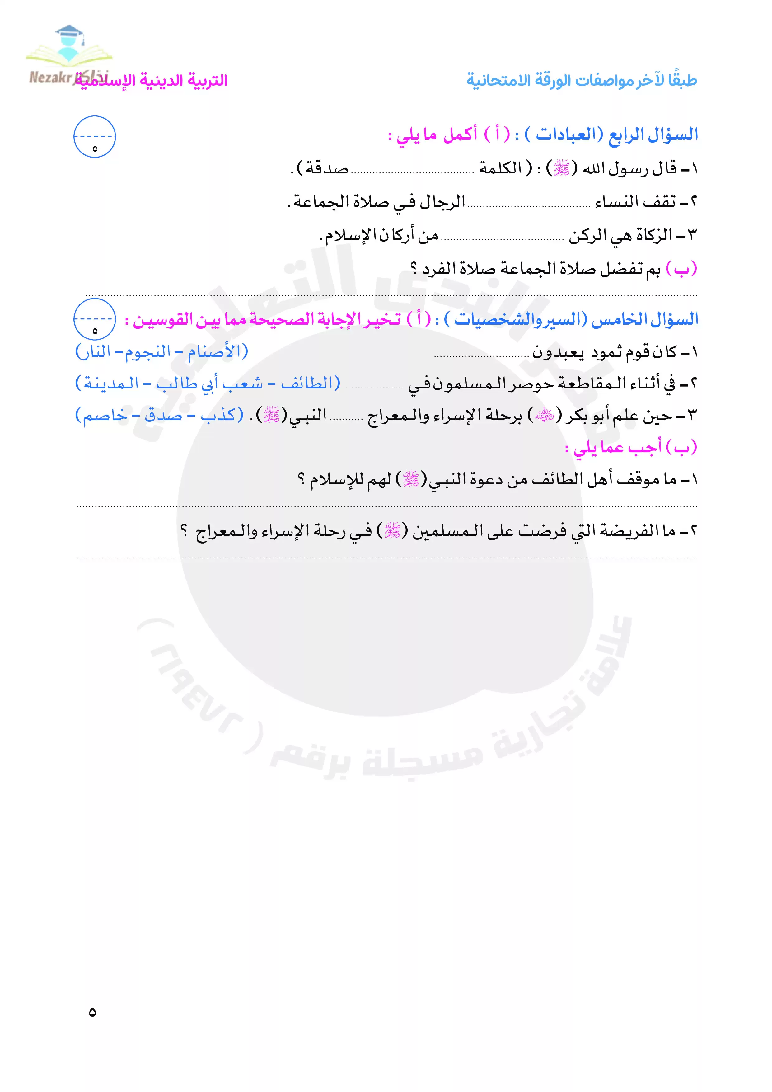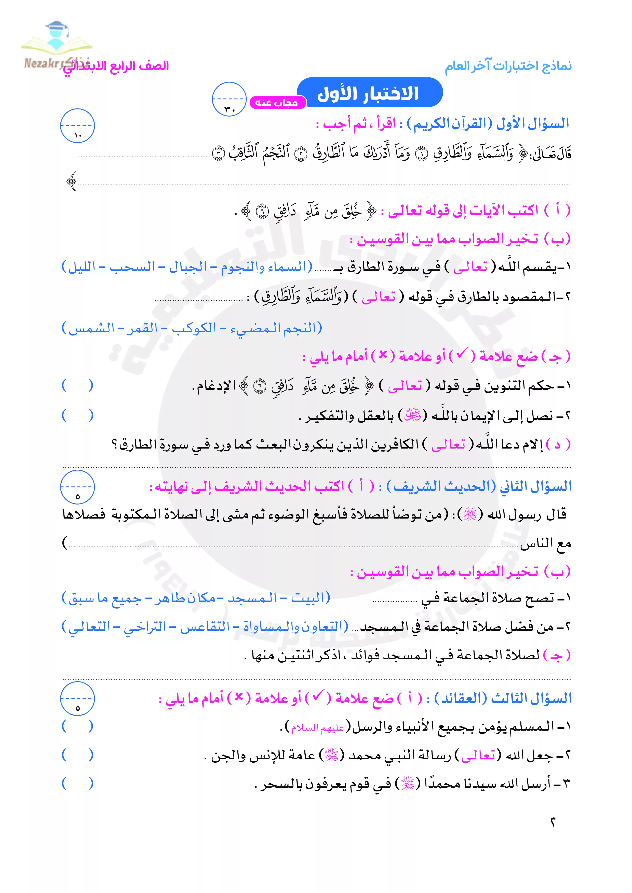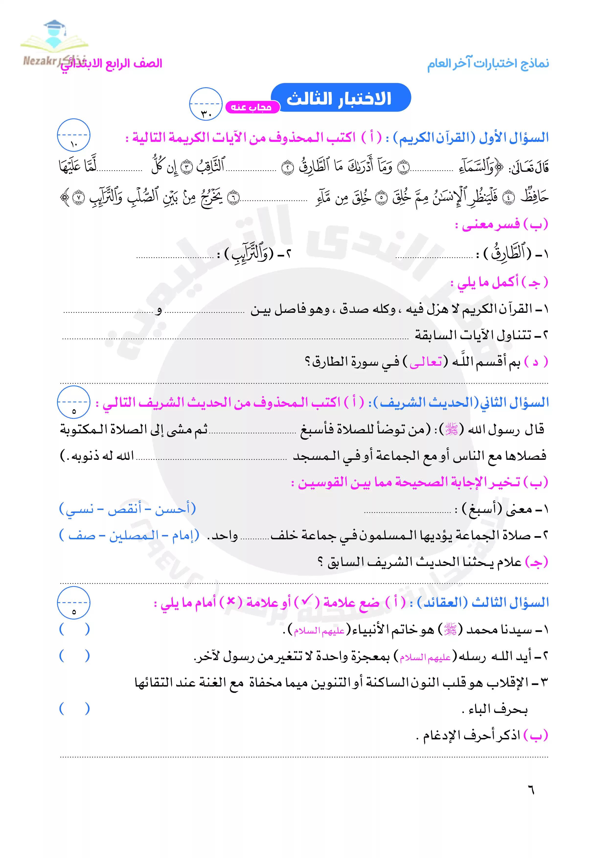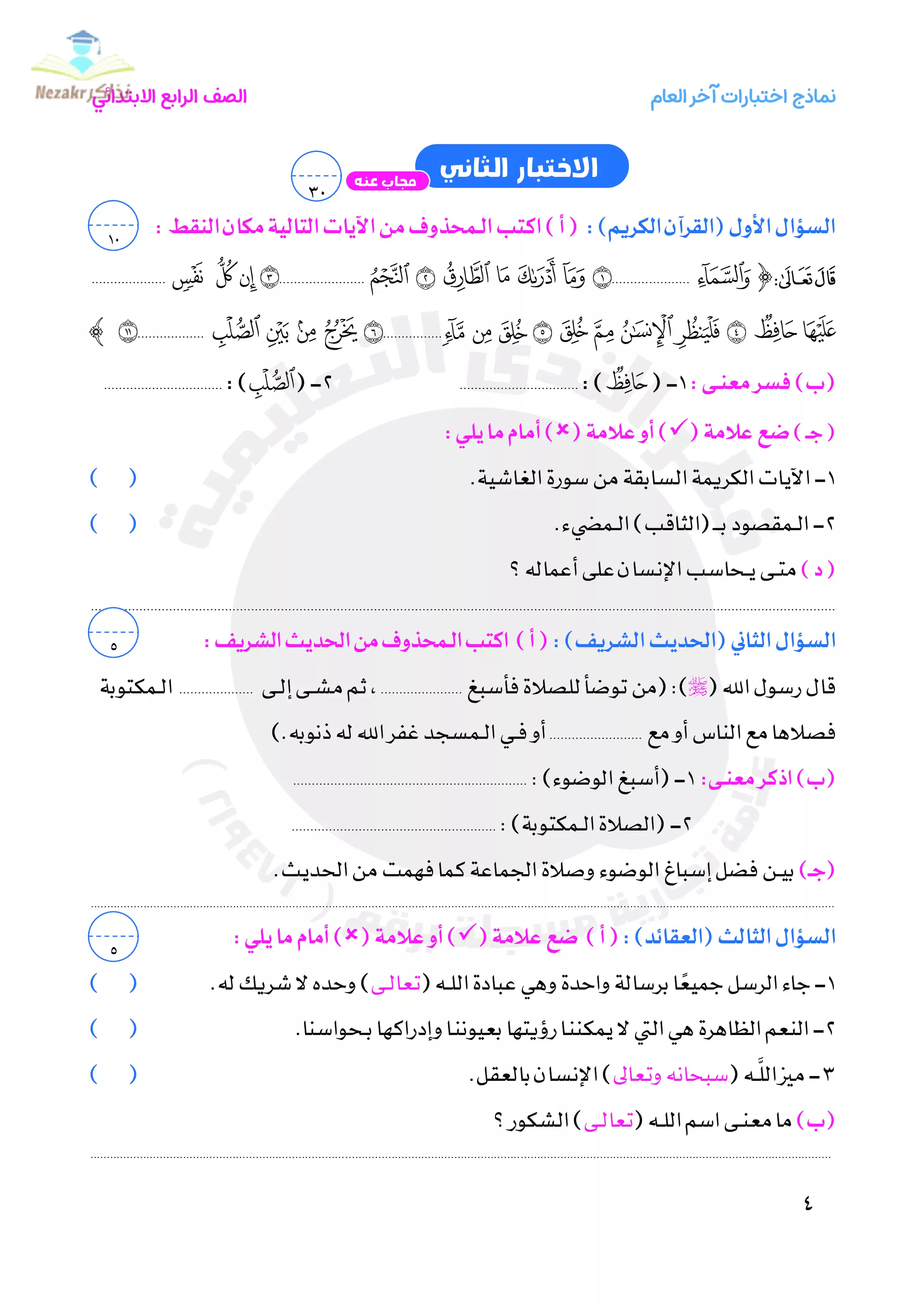 | بيانات الملف: (نماذج امتحانات التربية الدينية الإسلامية للصف الرابع الابتدائي الترم الثاني من قطر الندى - Nezakr) | |