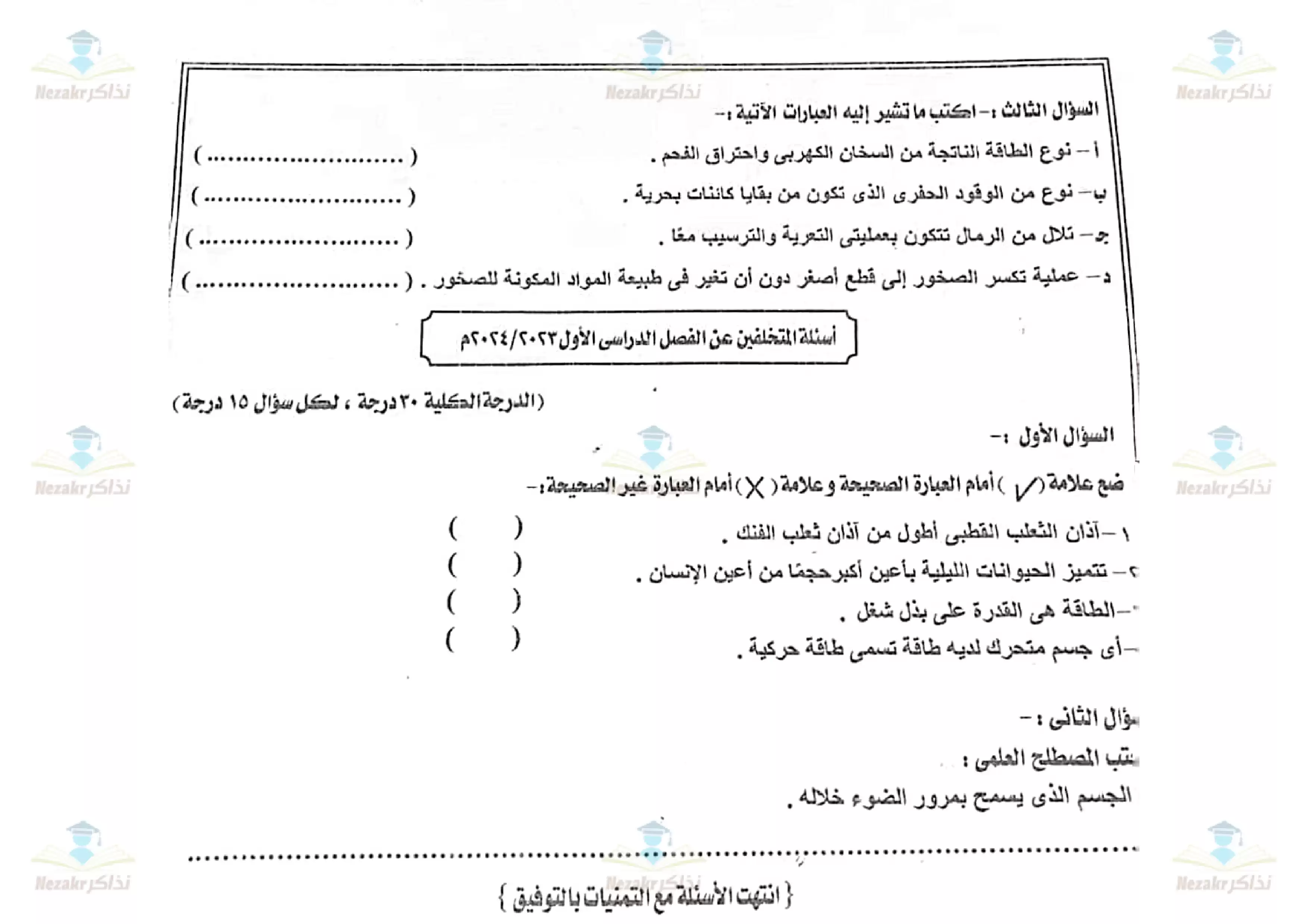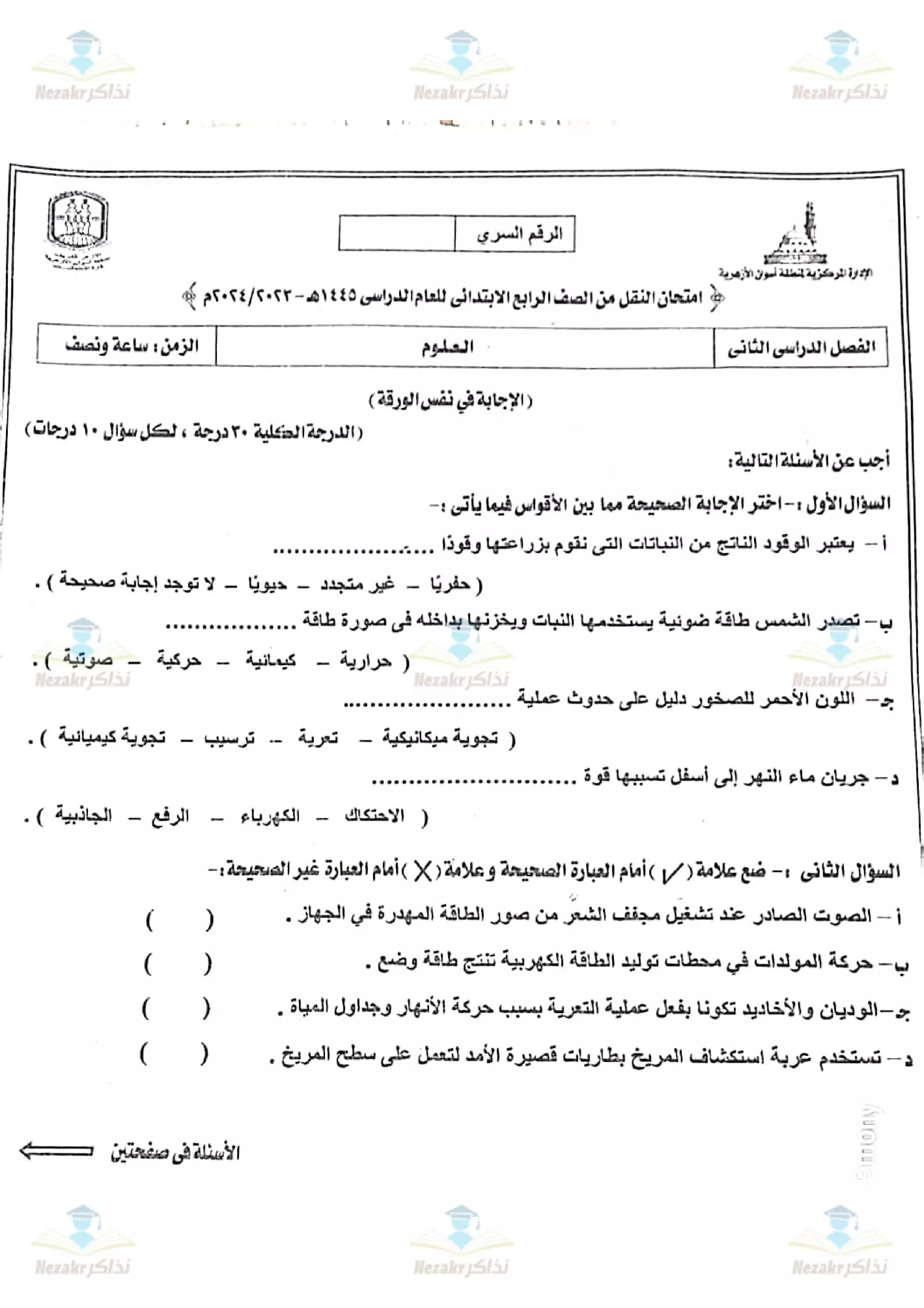 | بيانات الملف: (امتحان الصف الرابع الابتدائي في العلوم الفصل الدراسي الثاني 2024 منطقة أسوان الأزهرية - Nezakr) | |