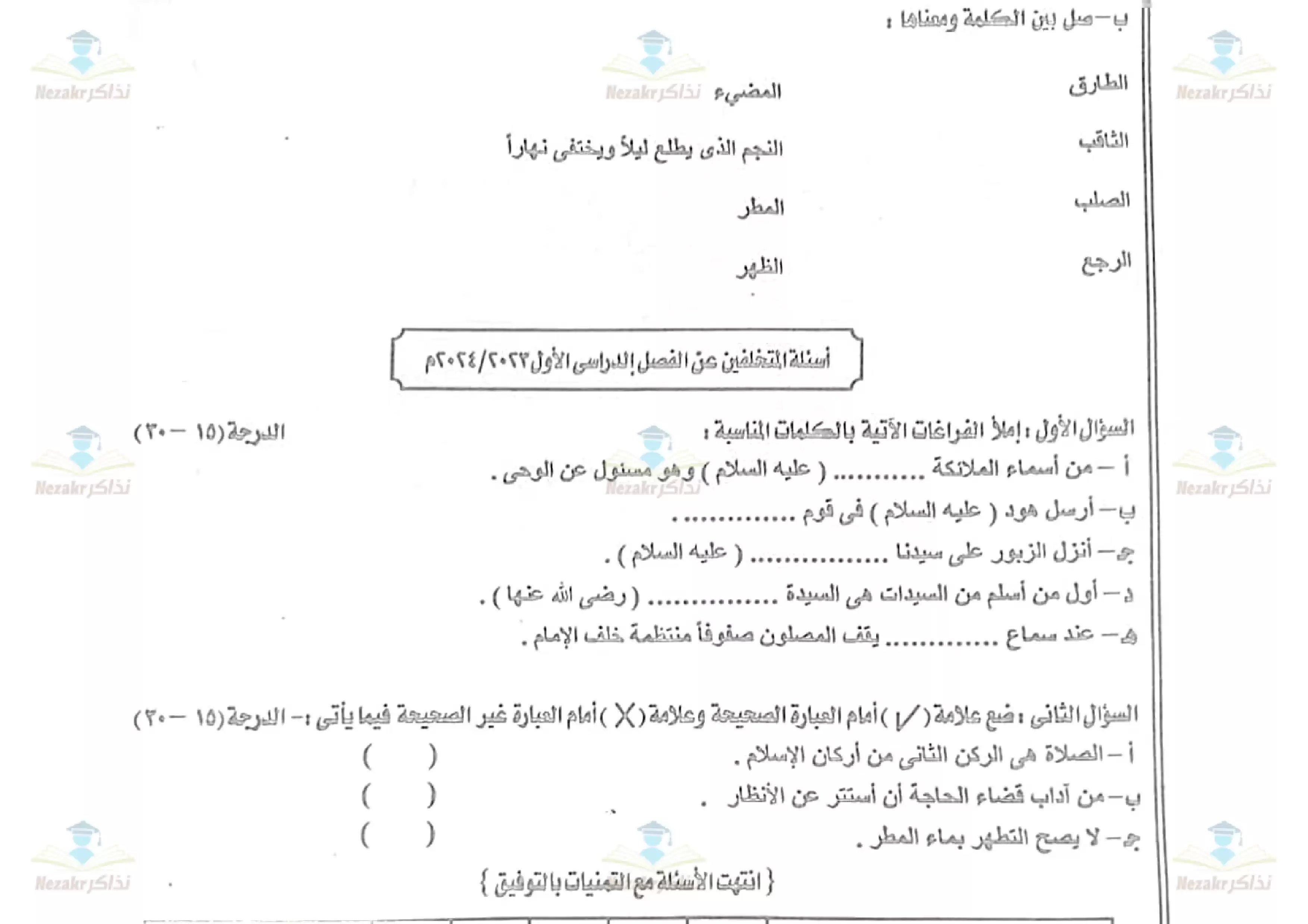 | بيانات الملف: (امتحان الصف الرابع الابتدائي في التربية الإسلامية الفصل الدراسي الثاني 2024 منطقة أسوان الأزهرية - Nezakr) | |