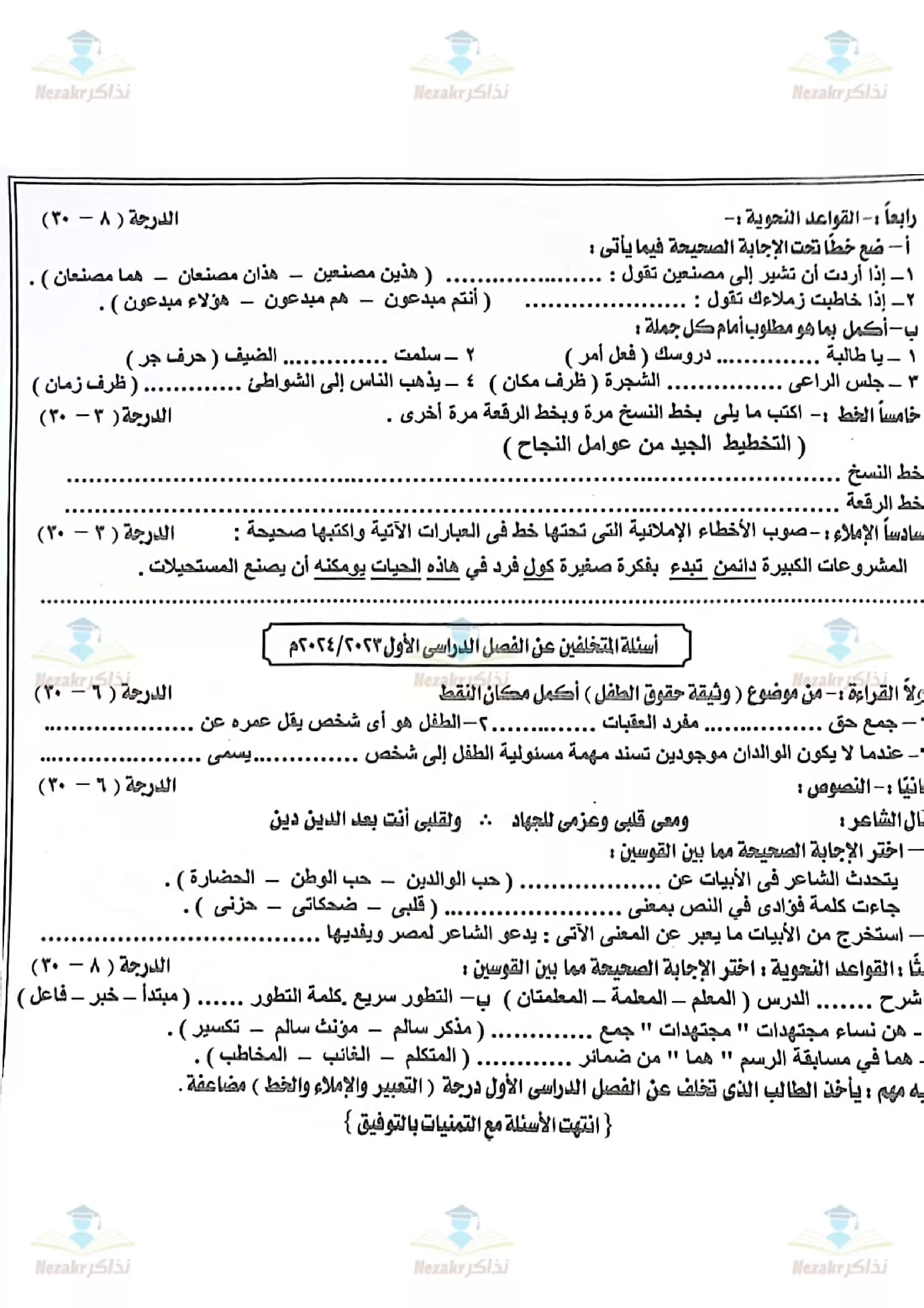 امتحان الصف الرابع الابتدائي في اللغة العربية والخط والإملاء الفصل الدراسي الثاني 2024 منطقة أسوان الأزهرية - Nezakr