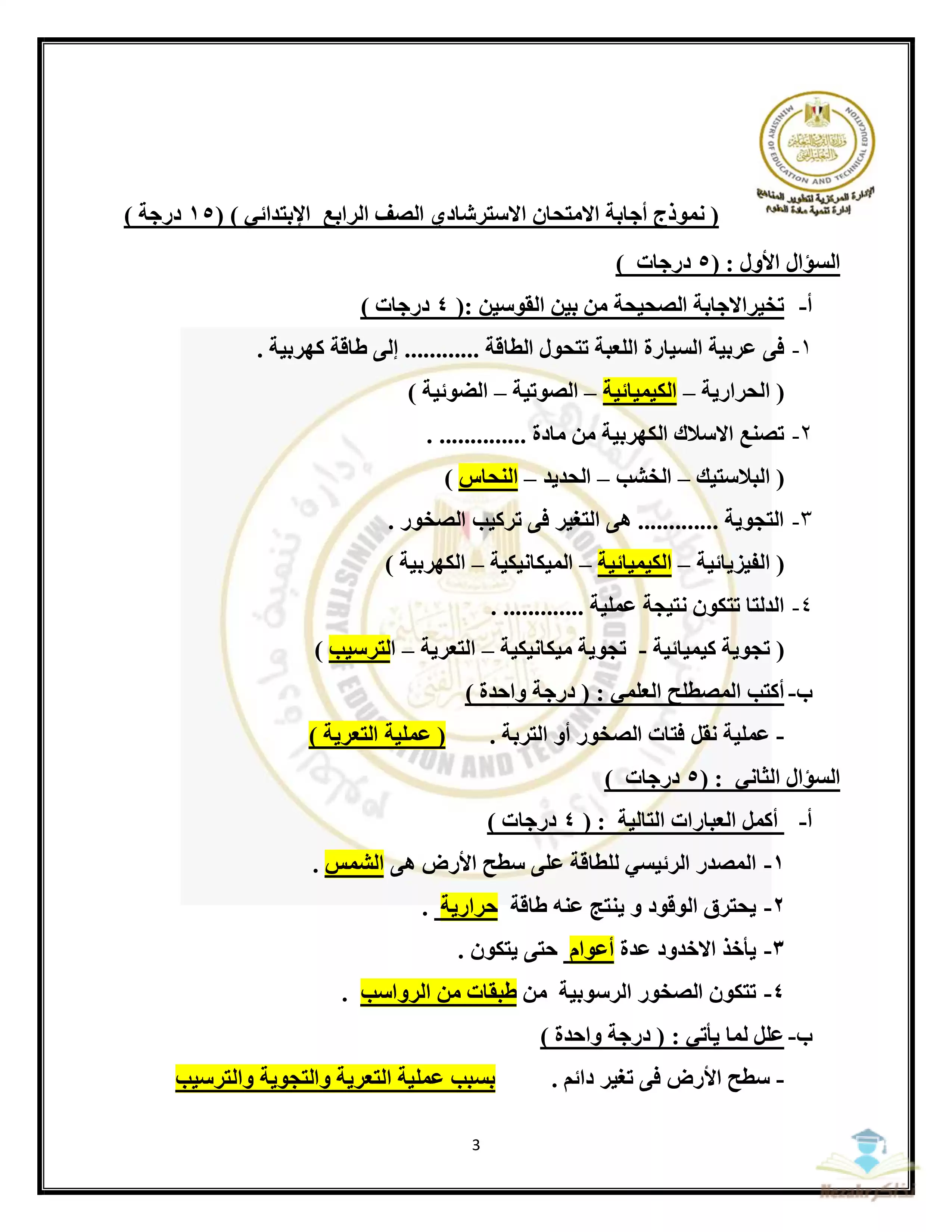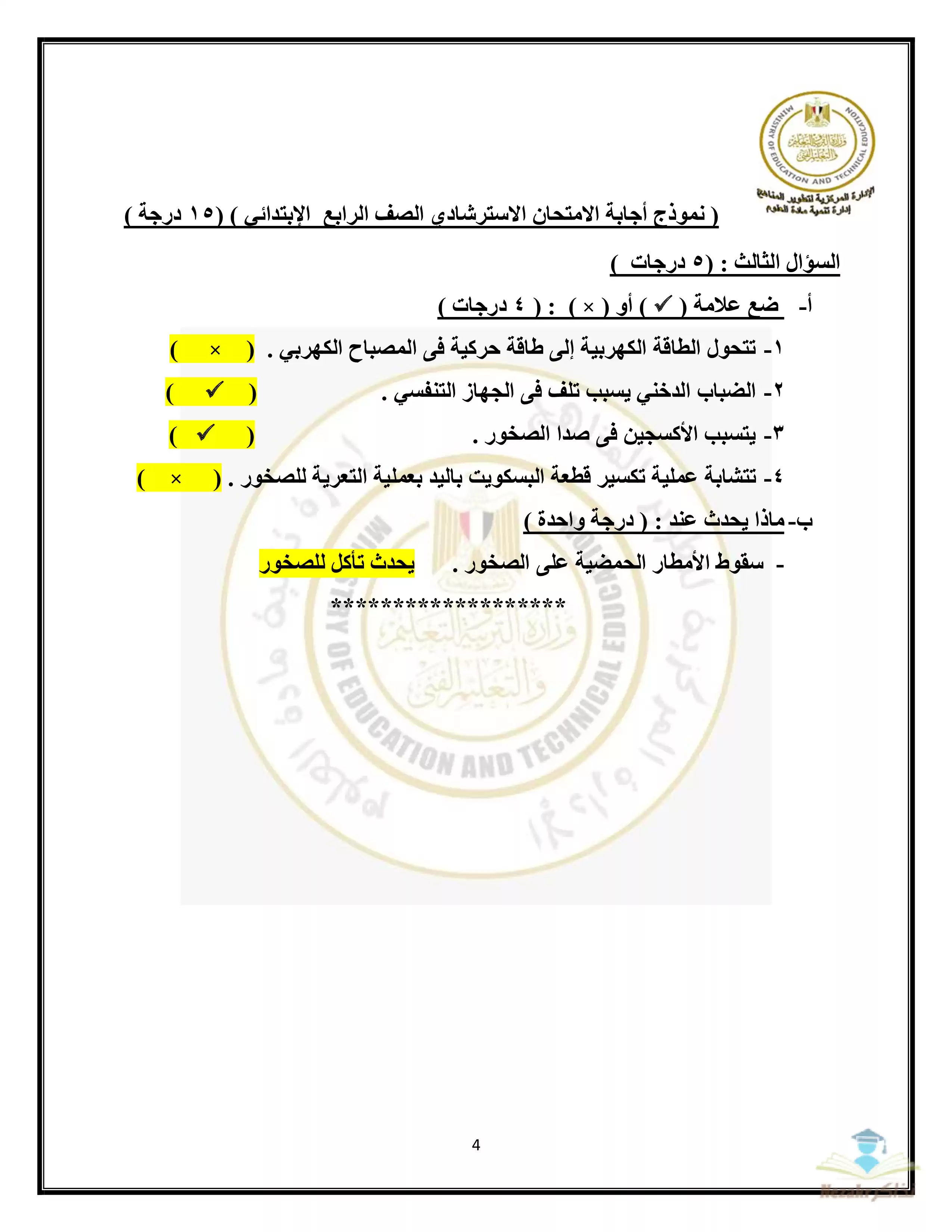 يتكون الملف من نموذج اختبار استرشادي في مادة العلوم للصف الرابع الابتدائي من وزارة التعليم, كما يضم نموذج الإجابة الرسمي للاختبار من إعداد مكتب مستشار العلوم.