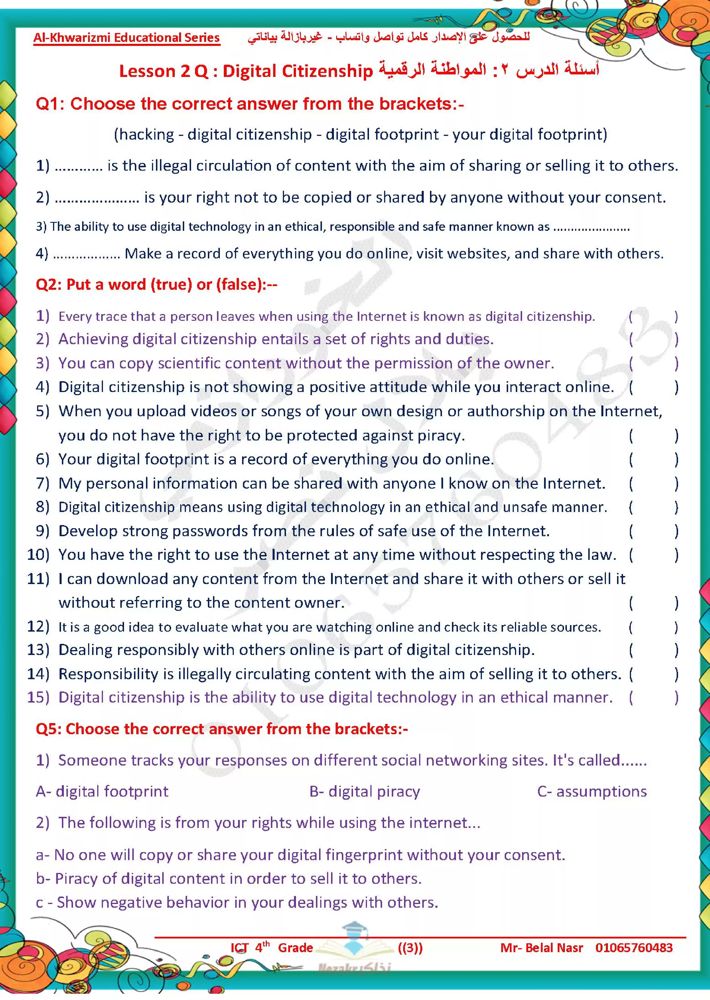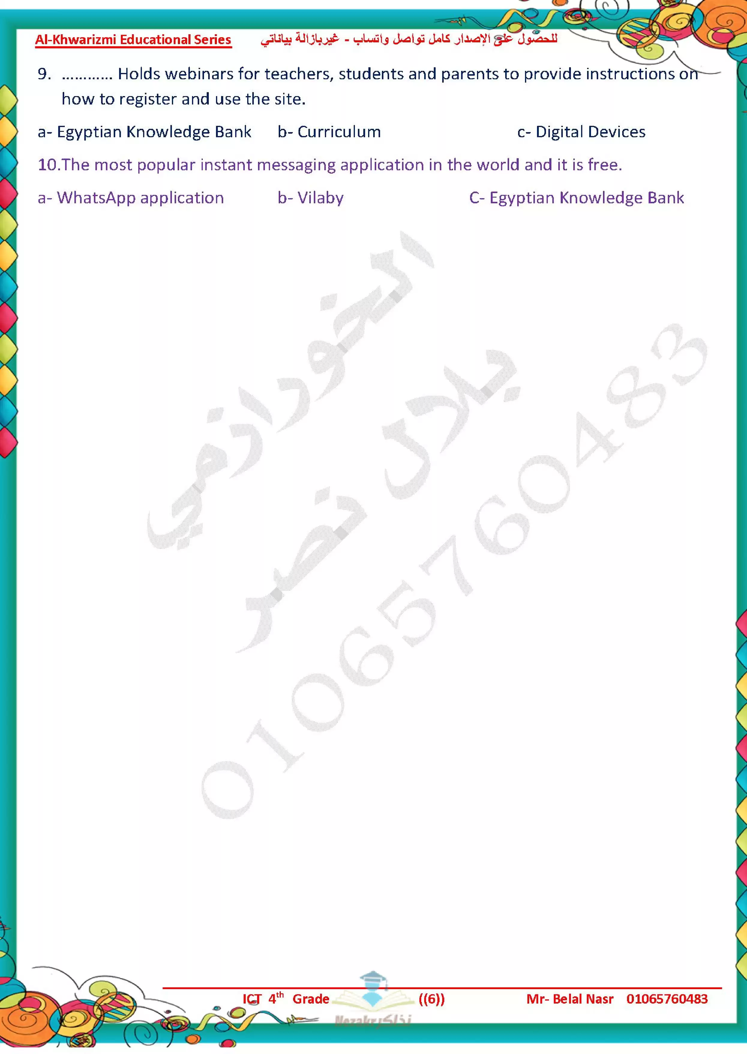 | بيانات الملف: (مراجعة آخر العام في تكنولوجيا المعلومات للغات ICT للصف الرابع الابتدائي من سلسلة الخوارزمي - Nezakr) | |