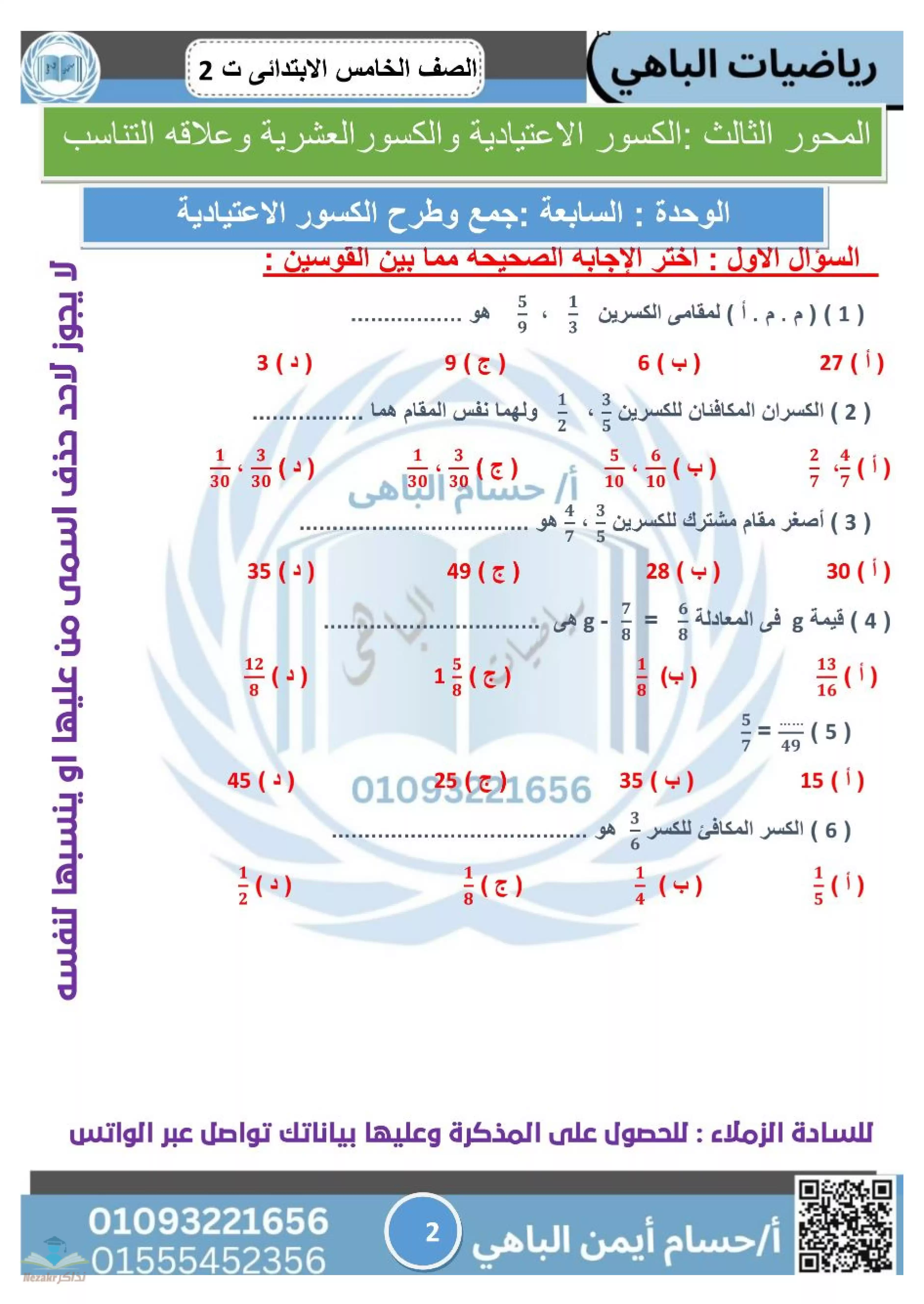صفحة 2 من 46 صفحة من ملف: سلسلة الباهي في الرياضيات لمراجعة الصف الخامس الابتدائي الترم الثاني