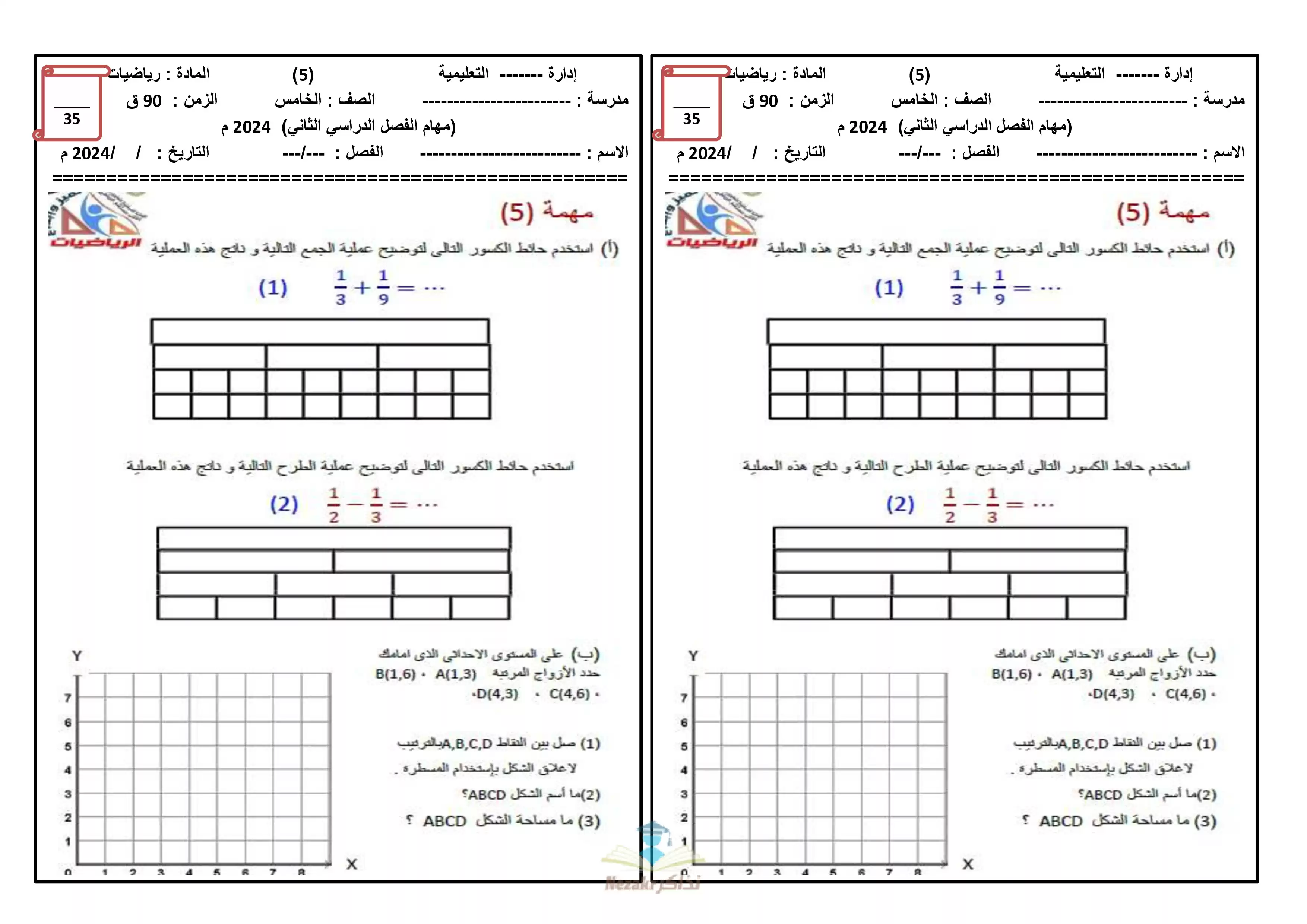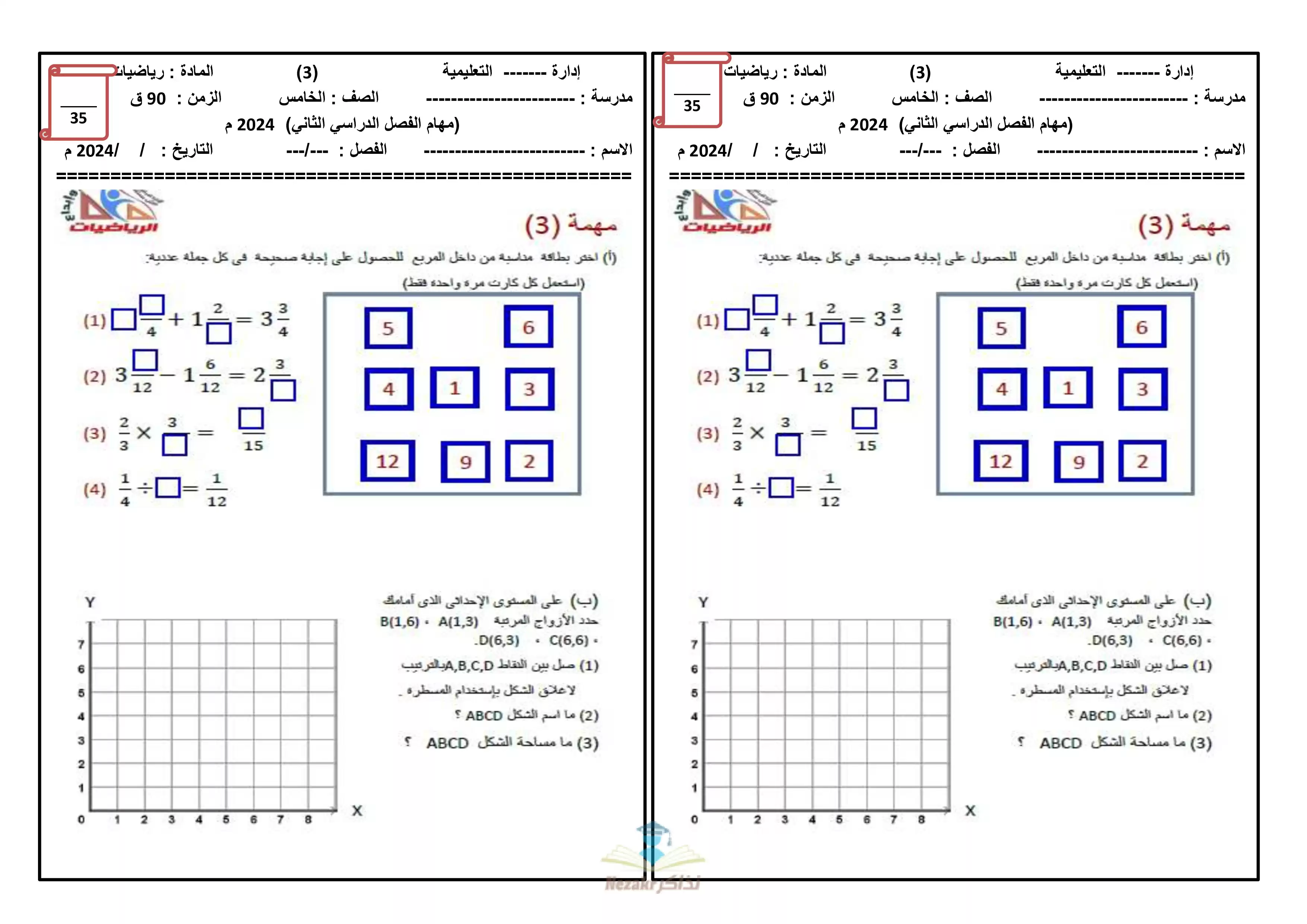 يحتوى الملف المرفق في المقال على ملف المهام الآدائية في الرياضيات للصف الخامس الابتدائي الفصل الدراسي الثاني من موقع وزارة التربية والتعليم, وذلك لتتمكن من تشغيله على جهاز الموبايل أو من خلال جهاز الكمبيوتر أو عبر اللابتوب أو التابلت لضمان سهولة الوصول الى الملف والمذاكرة عليه وقراءة محتوياته.