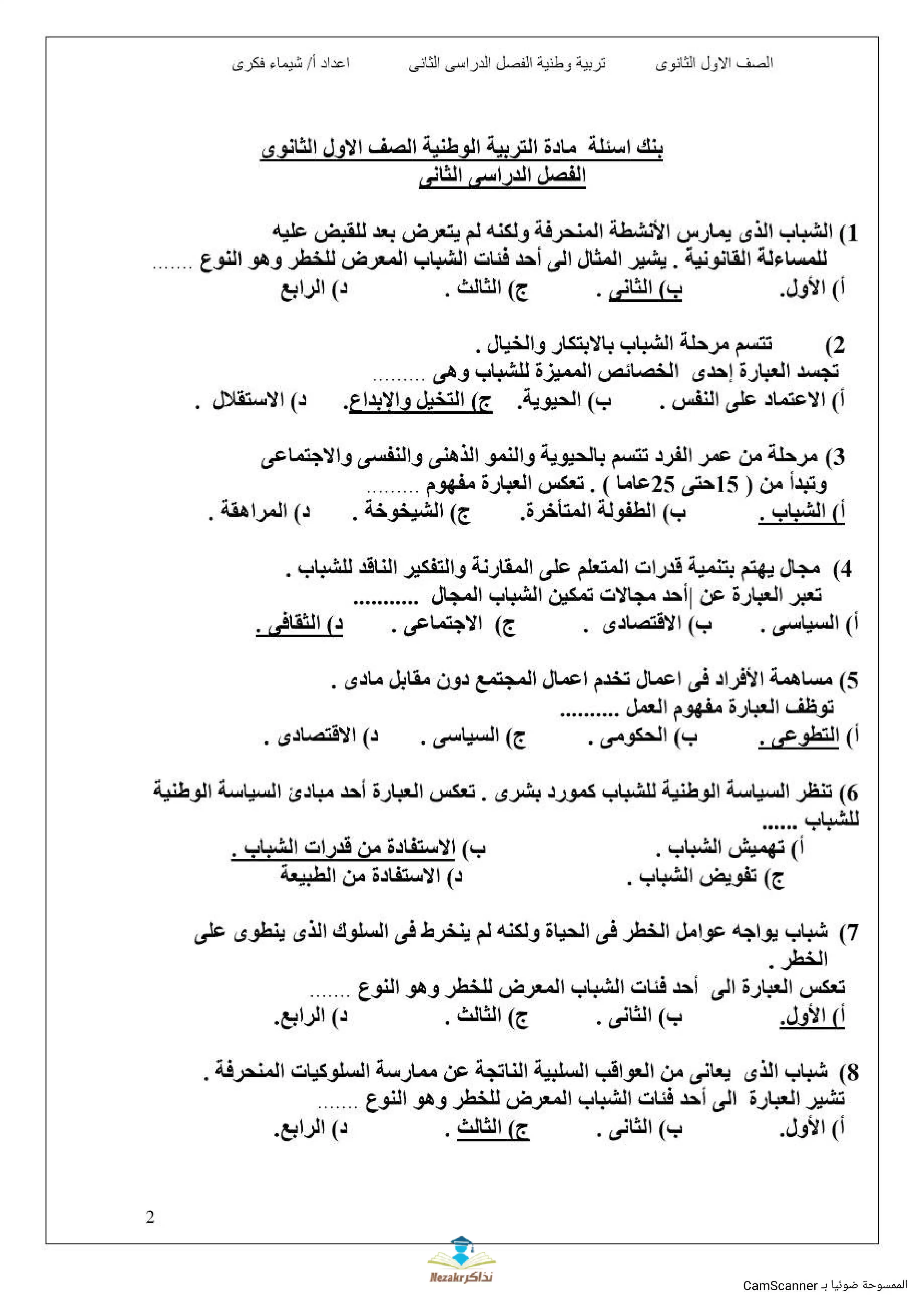 بنك أسئلة التربية الوطنية للصف الأول الثانوي الفصل الدراسي الثاني - Nezakr |