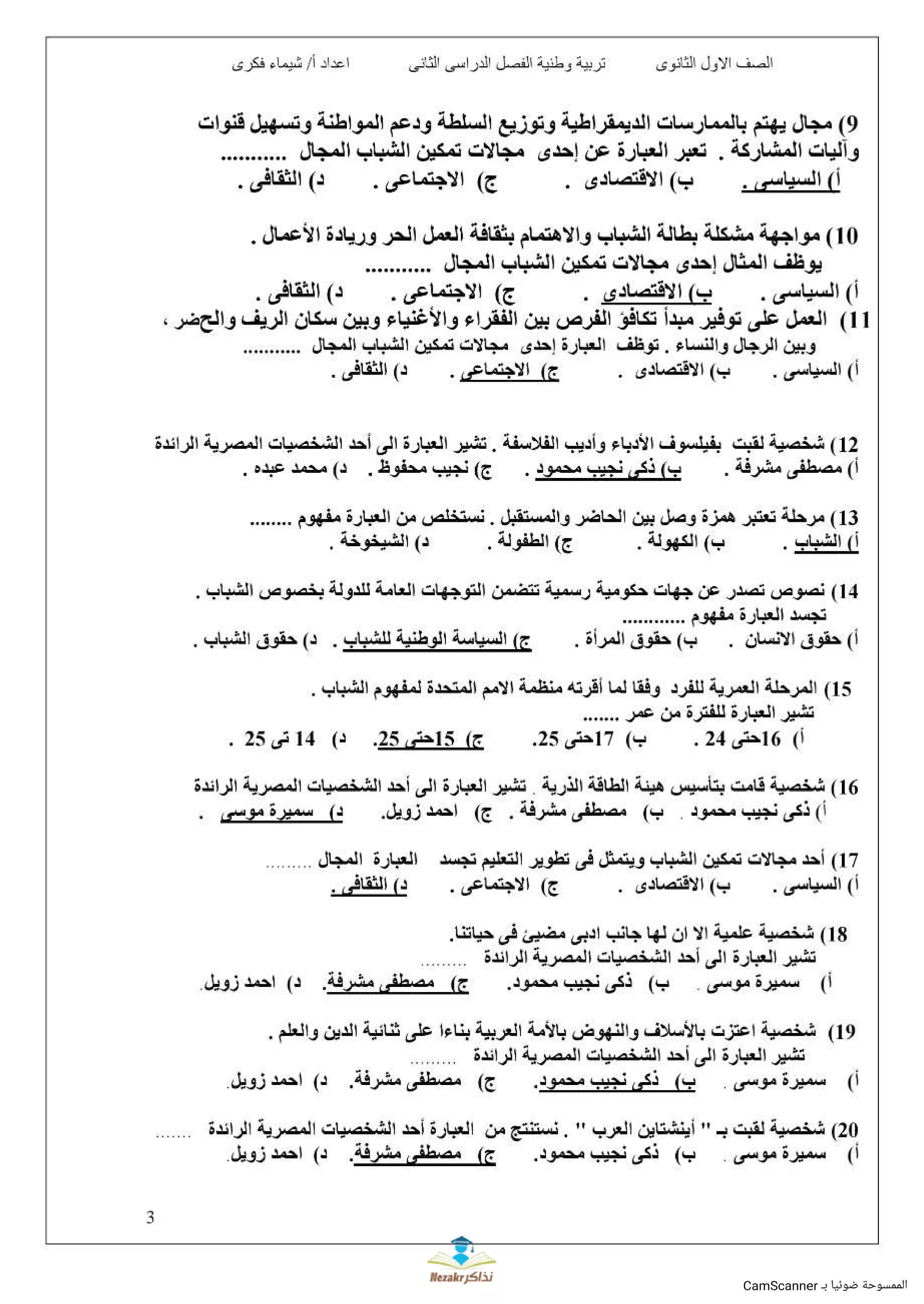 سكرين شوت من الملف: بنك أسئلة التربية الوطنية للصف الأول الثانوي الفصل الدراسي الثاني - Nezakr