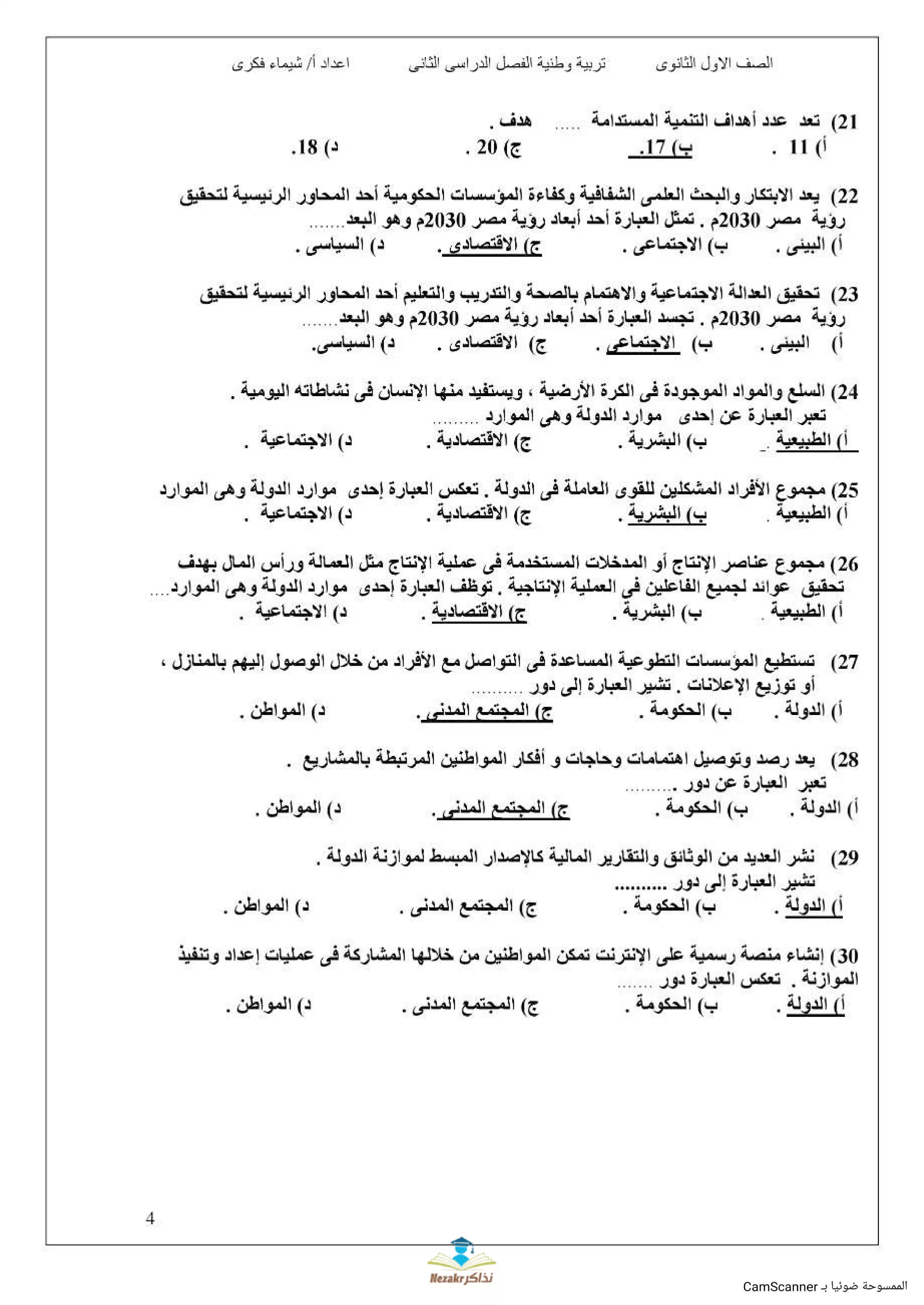 صفحة 4 من 5 صفحة من ملف: بنك أسئلة التربية الوطنية للصف الأول الثانوي الفصل الدراسي الثاني - Nezakr