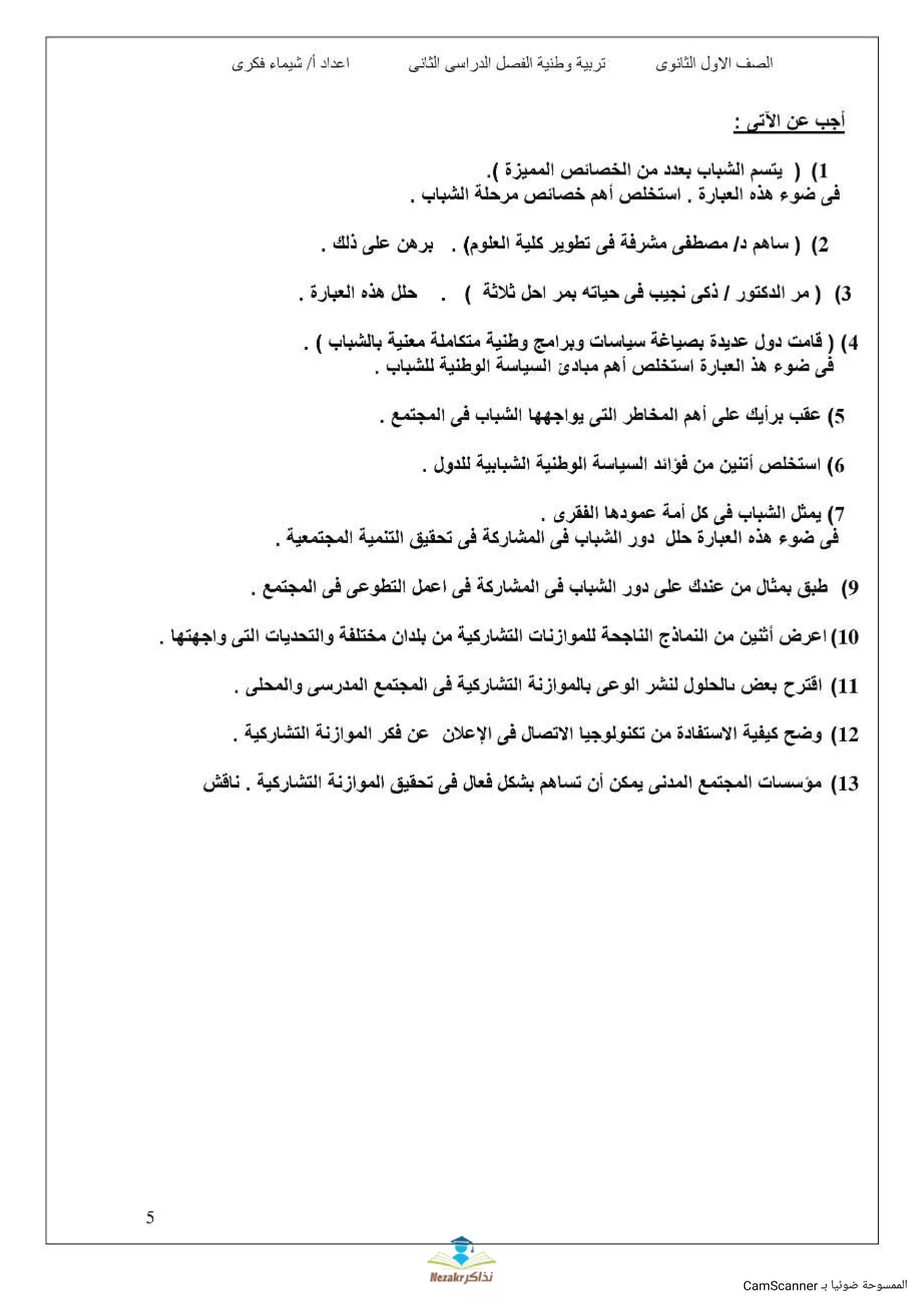 صفحة 5 من 5 صفحة من ملف: بنك أسئلة التربية الوطنية للصف الأول الثانوي الفصل الدراسي الثاني - Nezakr