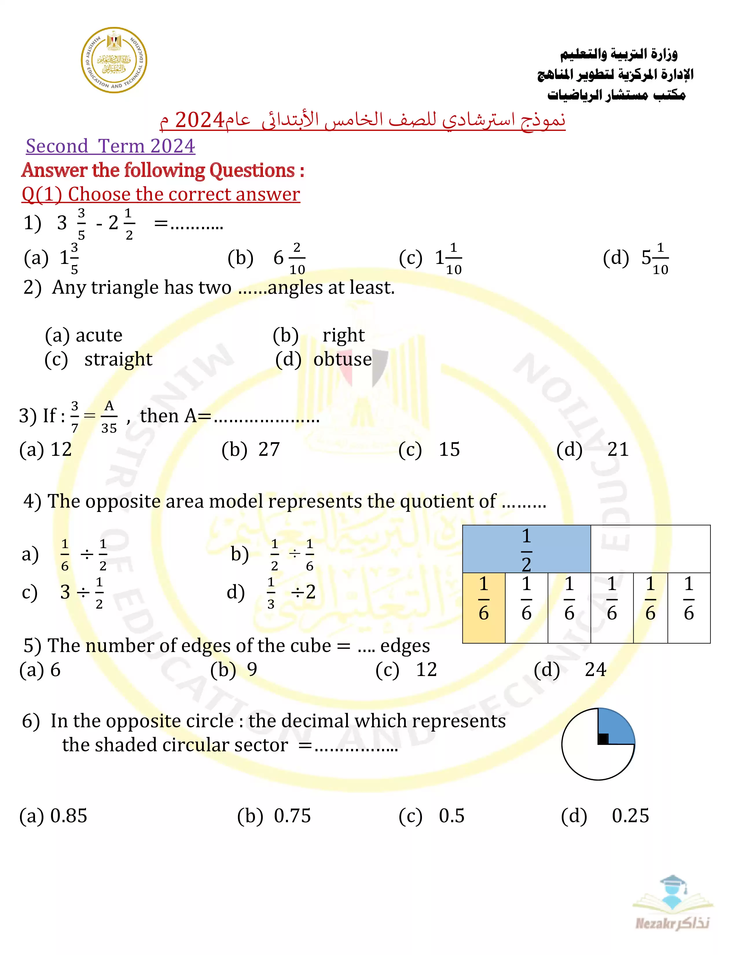 بيانات الملف: (نموذج امتحان الوزارة الاسترشادي في مادة الرياضيات باللغة الإنجليزية (Math) للصف الخامس الابتدائي الفصل الدراسي الثانى - Nezakr)