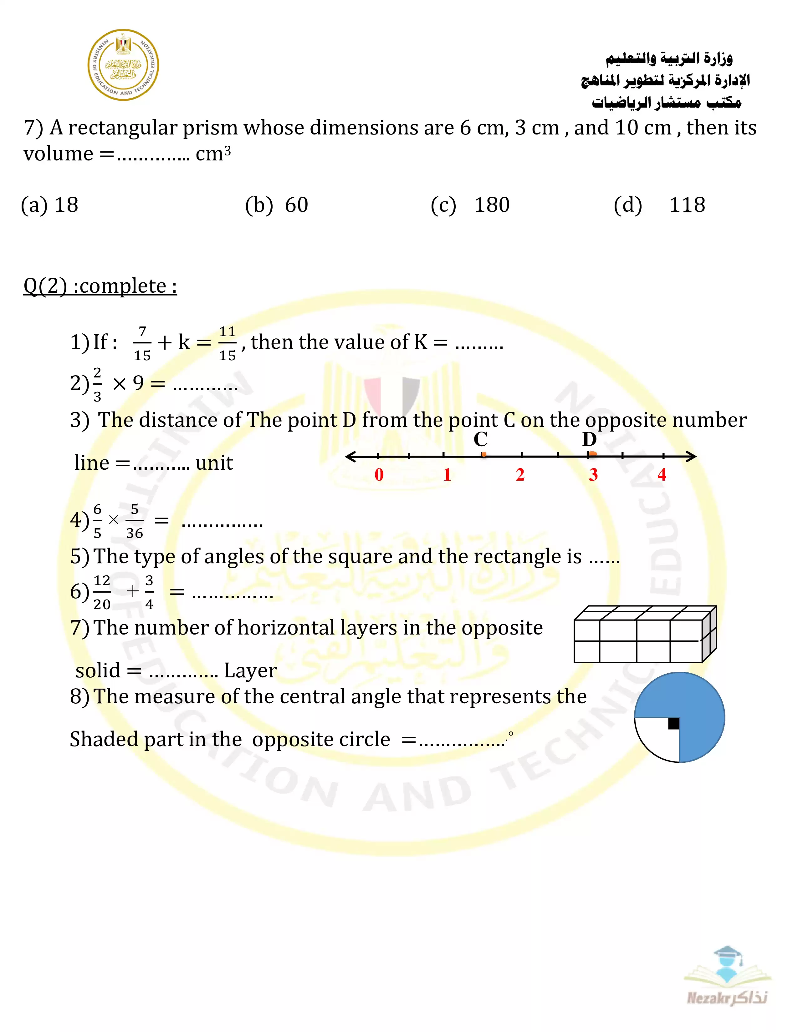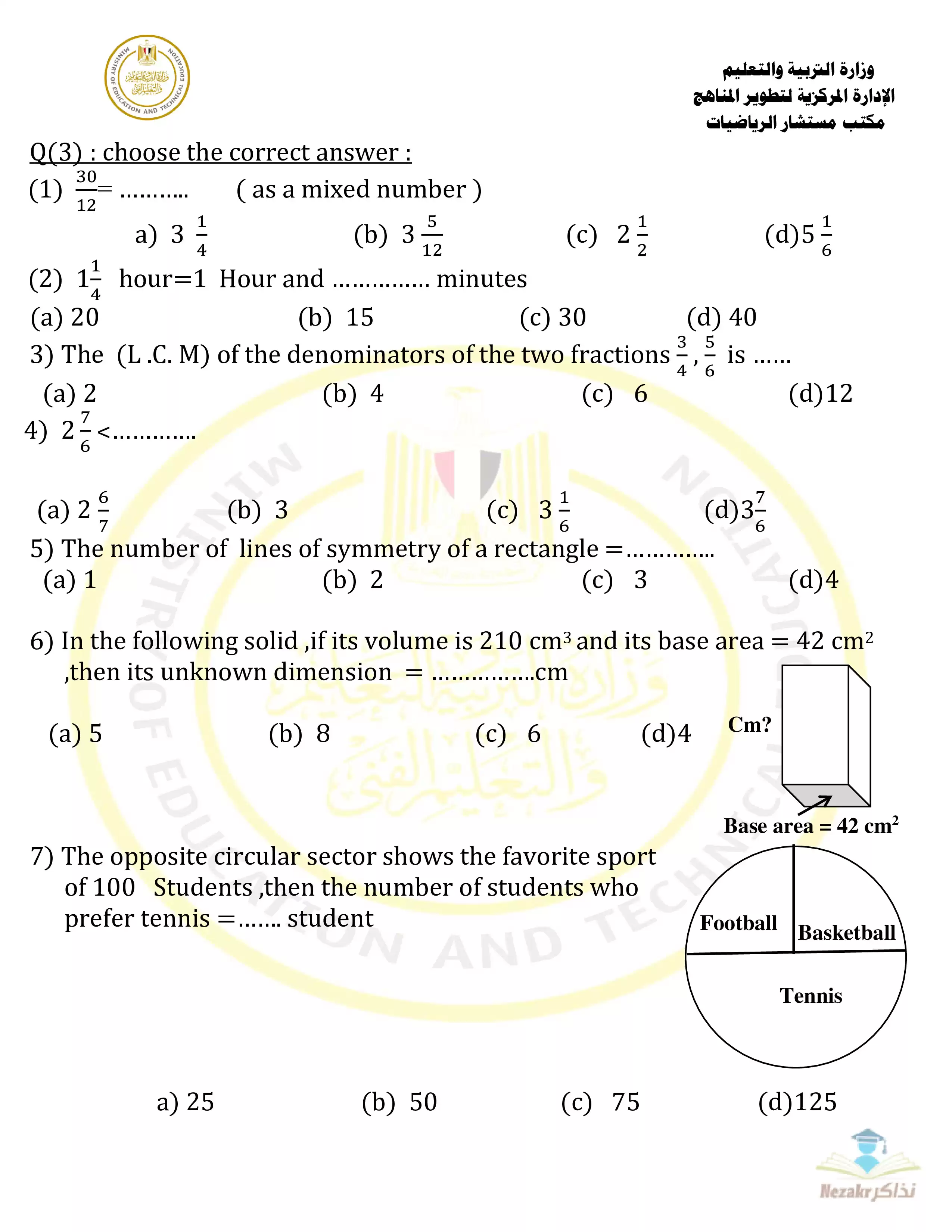 نموذج امتحان الوزارة الاسترشادي في مادة الرياضيات باللغة الإنجليزية (Math) للصف الخامس الابتدائي الفصل الدراسي الثانى - Nezakr