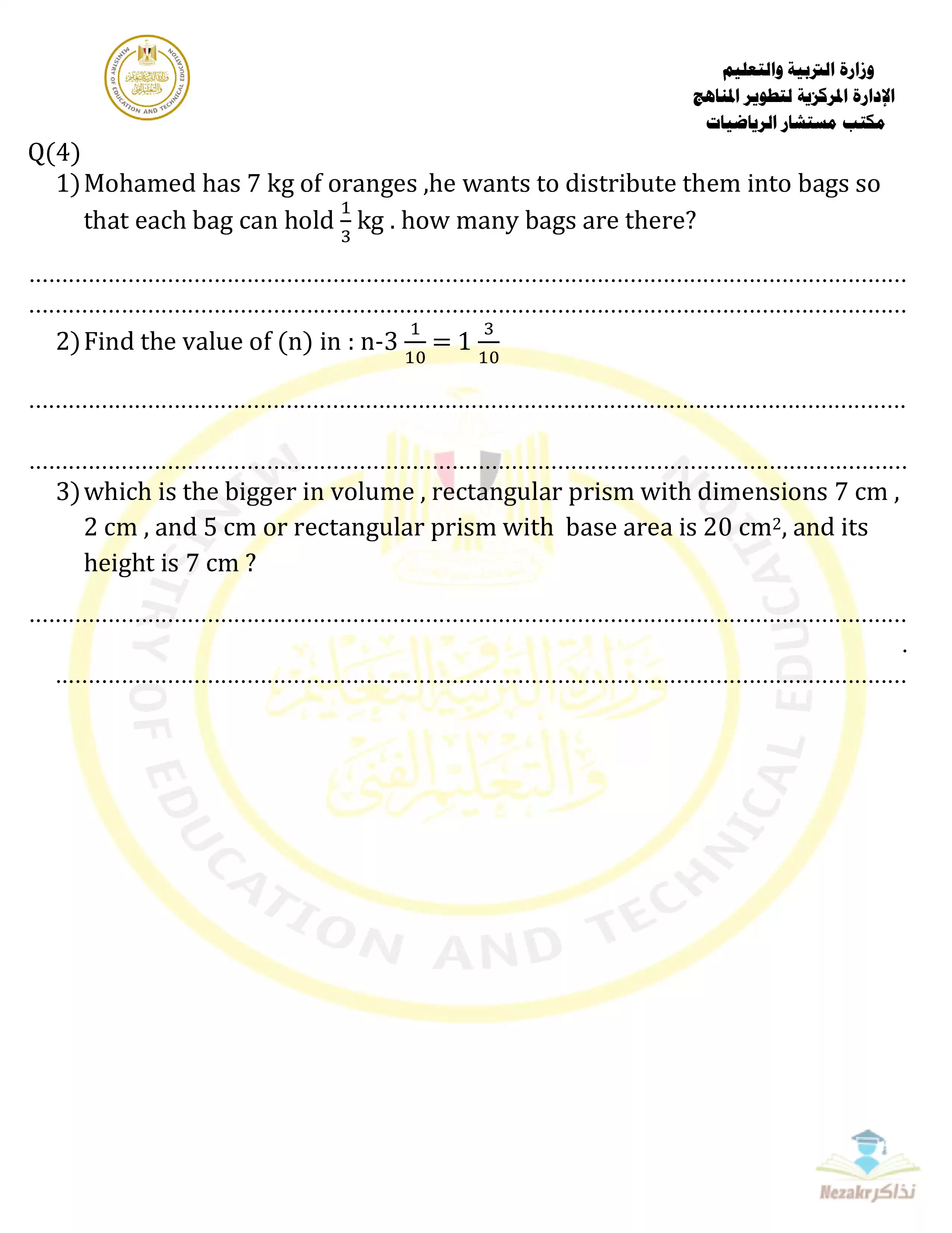 صفحة 3 من 6 صفحة من ملف: نموذج امتحان الوزارة الاسترشادي في مادة الرياضيات باللغة الإنجليزية (Math) للصف الخامس الابتدائي الفصل الدراسي الثانى - Nezakr