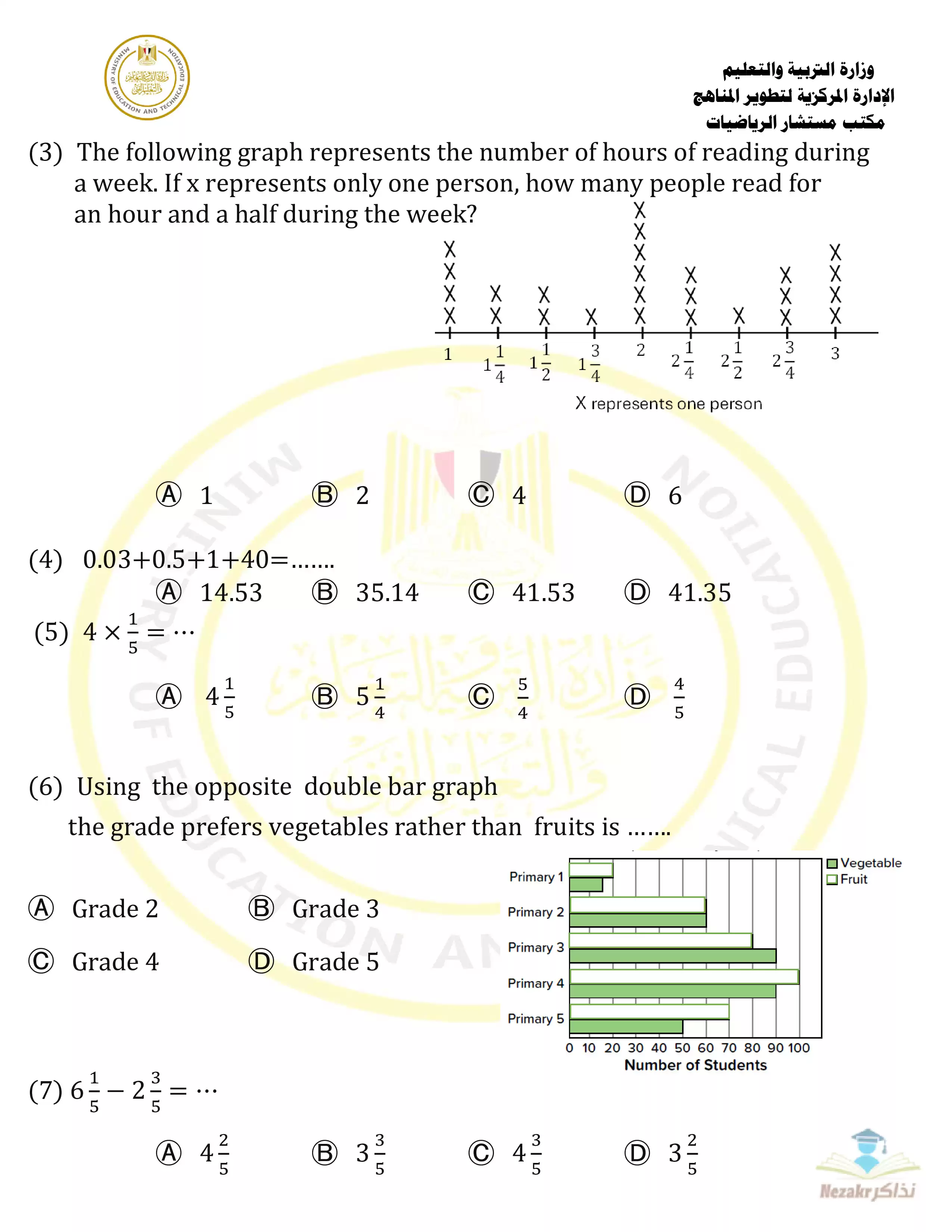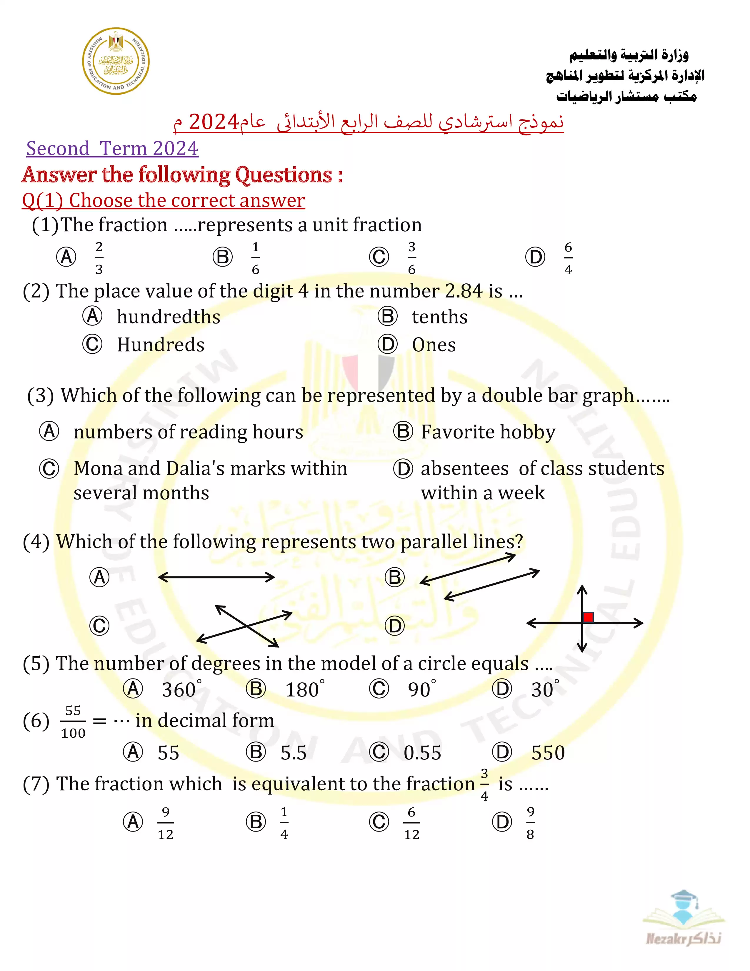 نموذج امتحان الوزارة الاسترشادي في مادة الرياضيات باللغة الإنجليزية (Math) للصف الرابع الابتدائي الفصل الدراسي الثانى - Nezakr