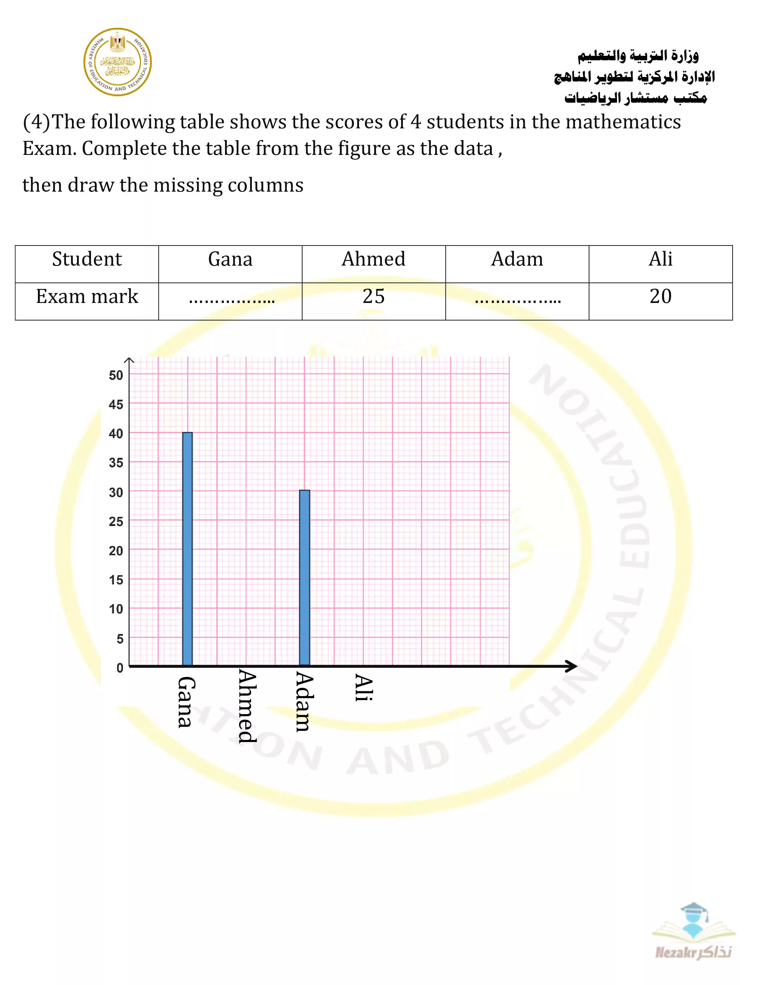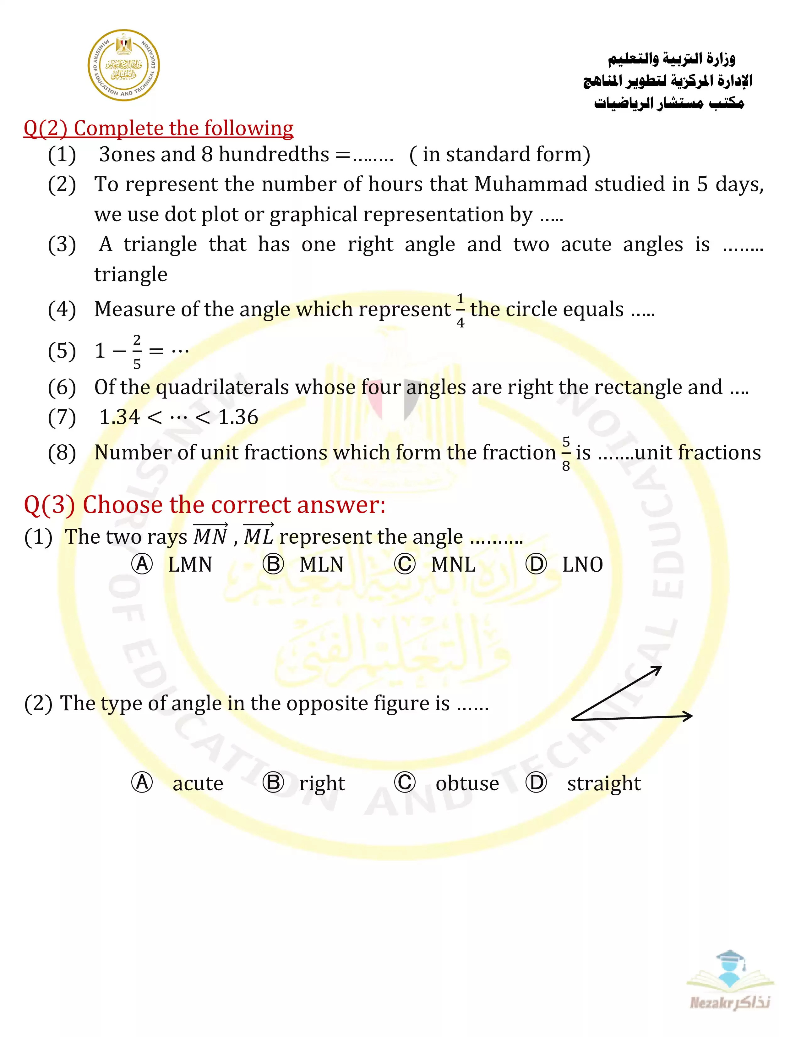 بيانات الملف: (نموذج امتحان الوزارة الاسترشادي في مادة الرياضيات باللغة الإنجليزية (Math) للصف الرابع الابتدائي الفصل الدراسي الثانى - Nezakr)
