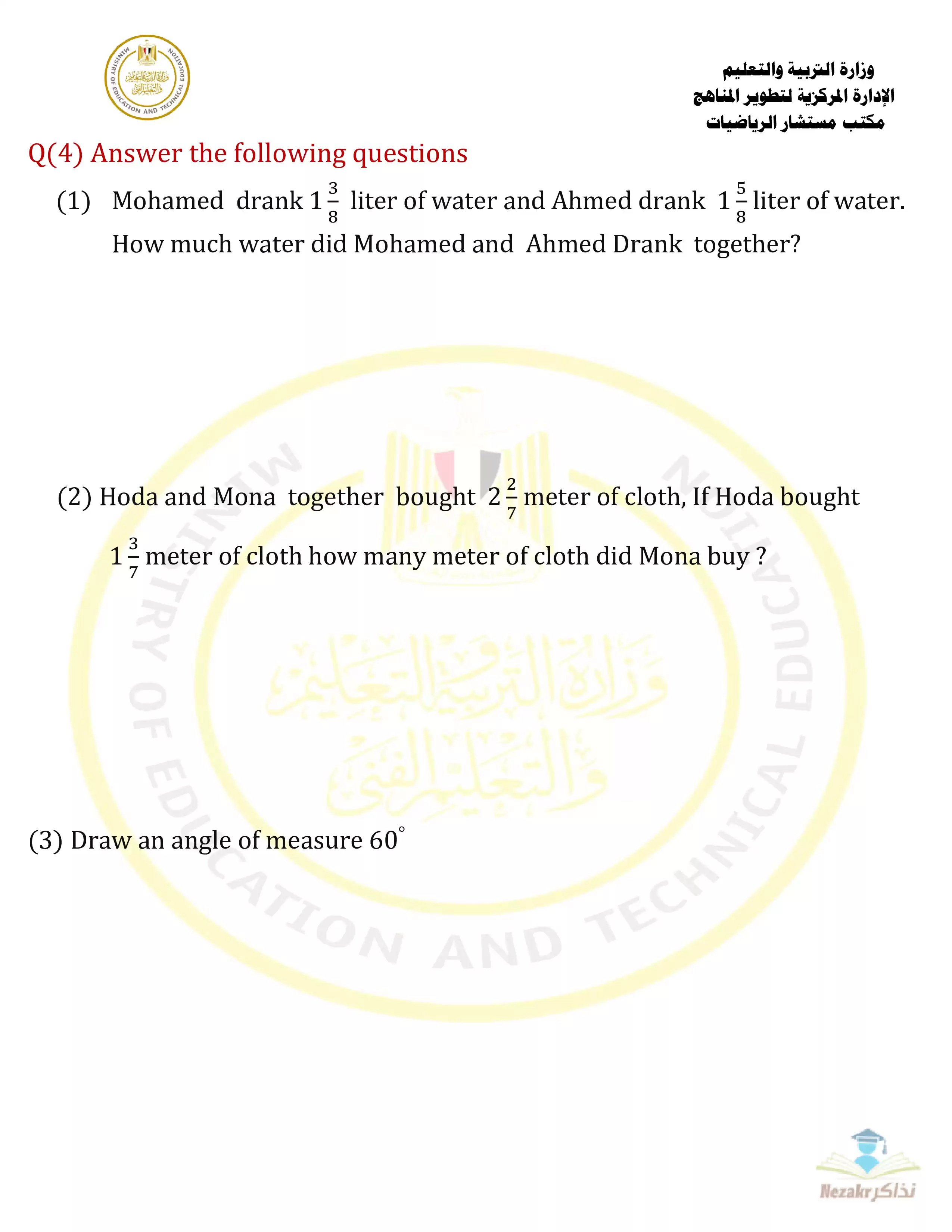 سكرين شوت من الملف: نموذج امتحان الوزارة الاسترشادي في مادة الرياضيات باللغة الإنجليزية (Math) للصف الرابع الابتدائي الفصل الدراسي الثانى - Nezakr
