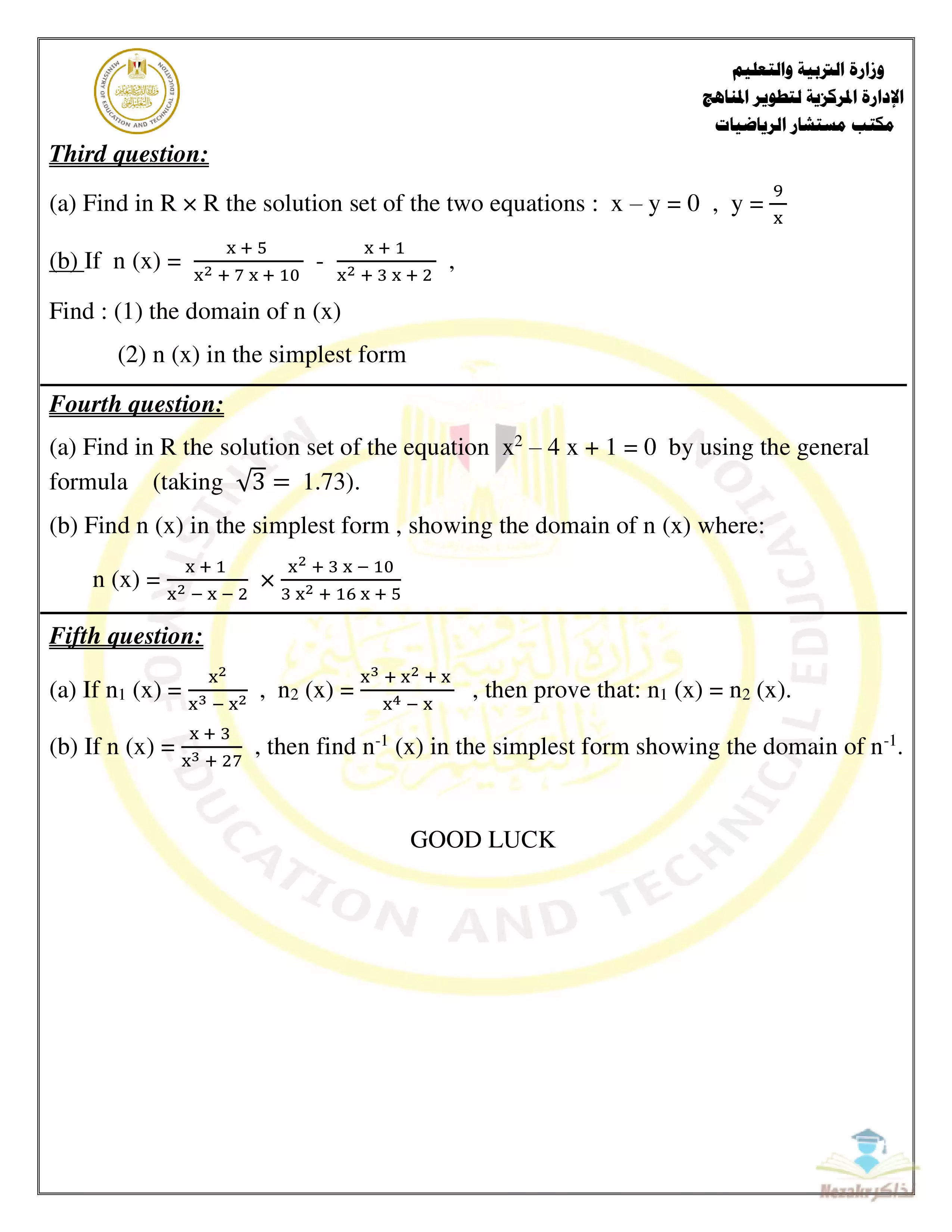 ويشمل الامتحان الرسمي المنشور عبر موقع وزارة التعليم اختباراً استرشادياً شاملا على منهج الترم الثاني في Math Algebra للصف الثالث الإعدادي مكون من 5 أسئلة وهي أسئلة الامتحان الاسترشادي في الجبر بالانجليزي للصف الثالث الإعدادي.