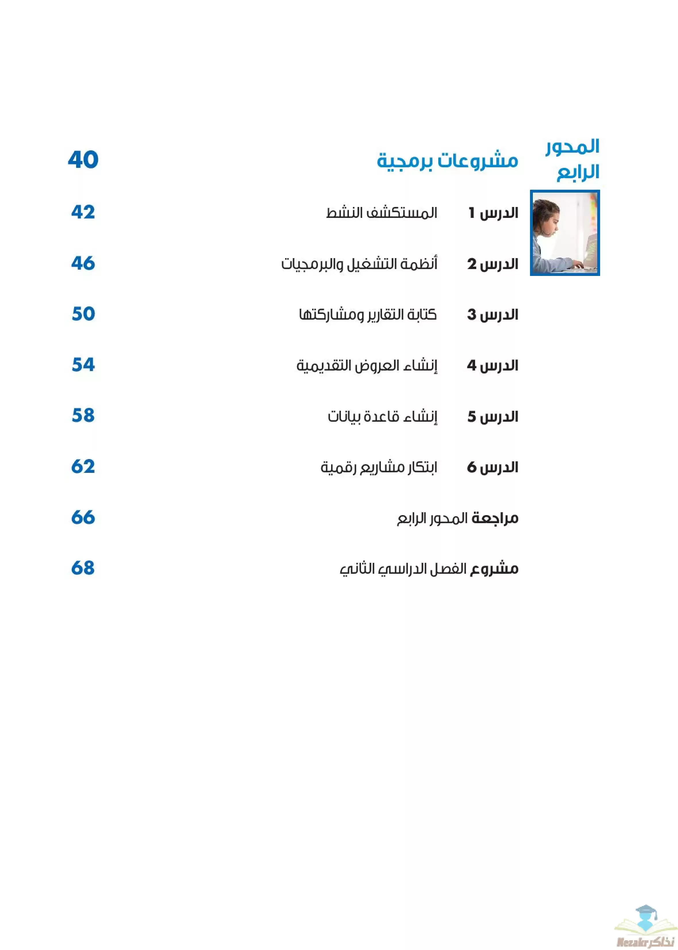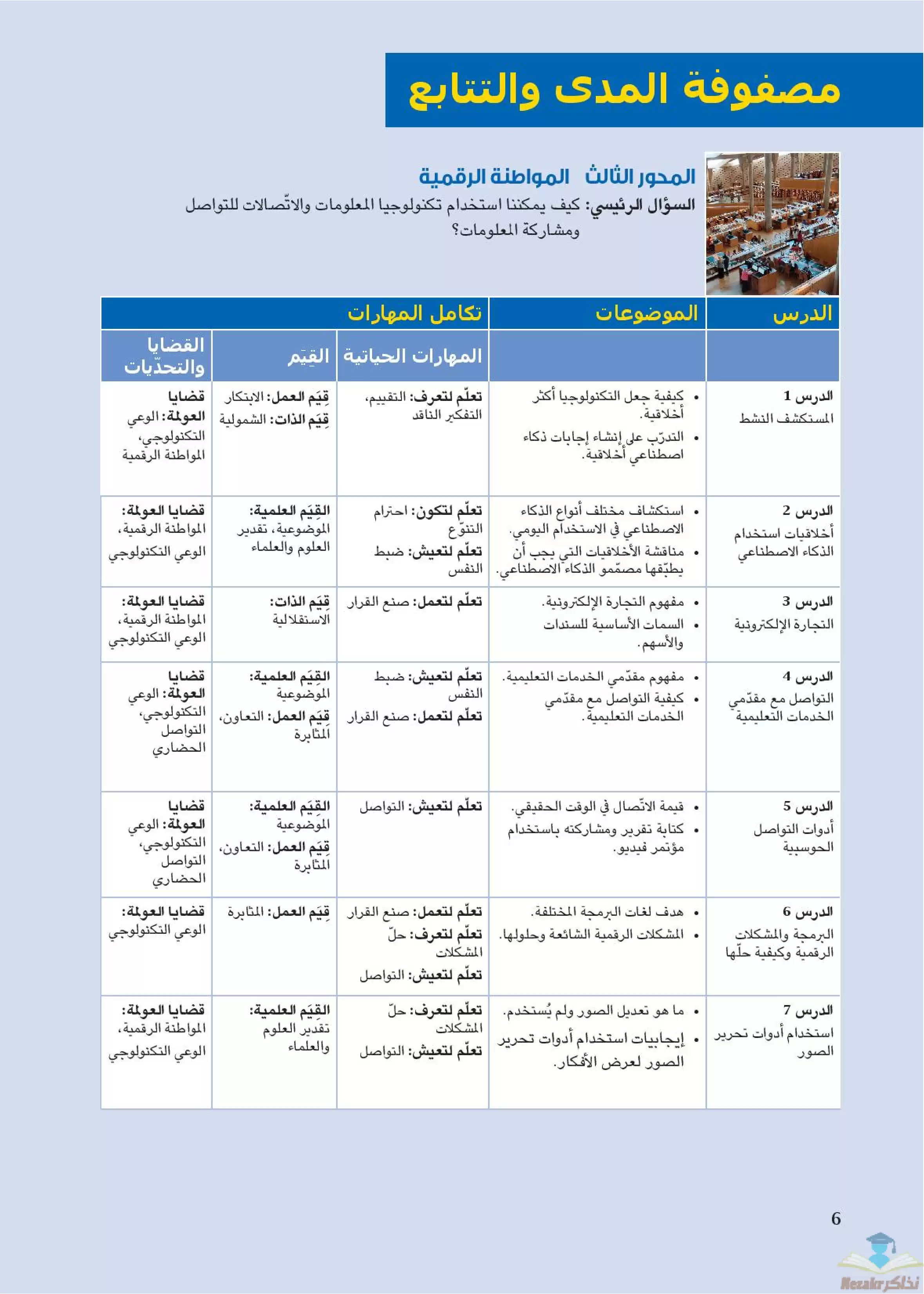 وعن محتوى منهج تكنولوجيا المعلومات والاتصالات للصف السادس الابتدائي للفصل الدراسي الثاني فقد تم تضمين الموضوعات التالية ضمن المنهج الجديد لمادة تكنولوجيا المعلومات والاتصالات لساتة ابتدائي وهي: