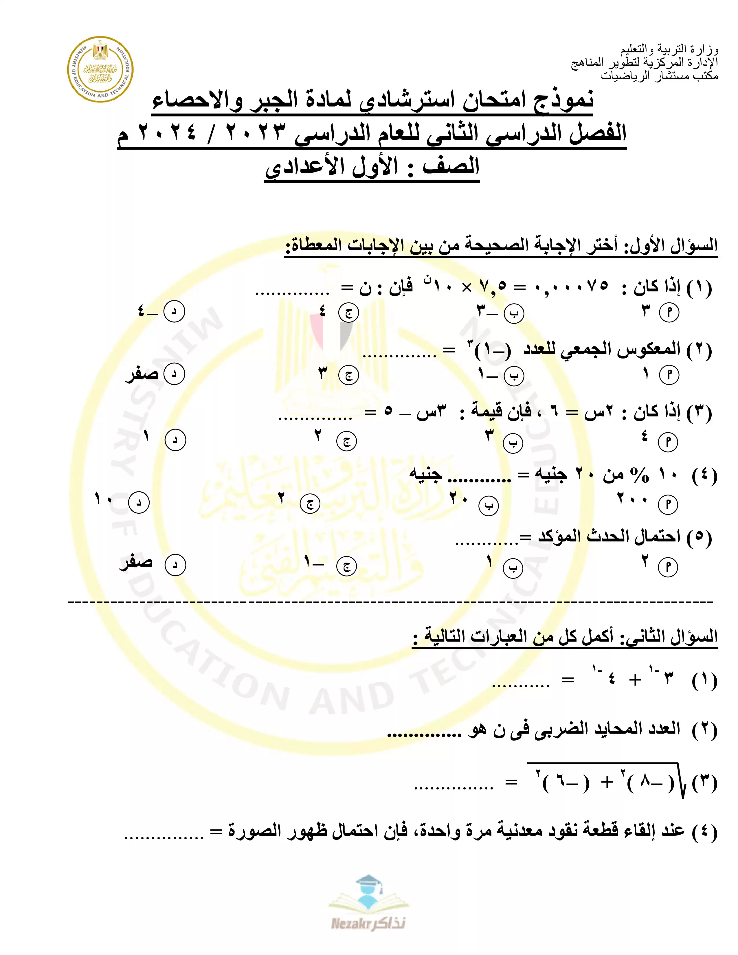 1. نموذج اختبار استرشادي في الجبر لأولى إعدادي مكون من 5 أسئلة من إعداد مكتب مستشار الرياضيات.