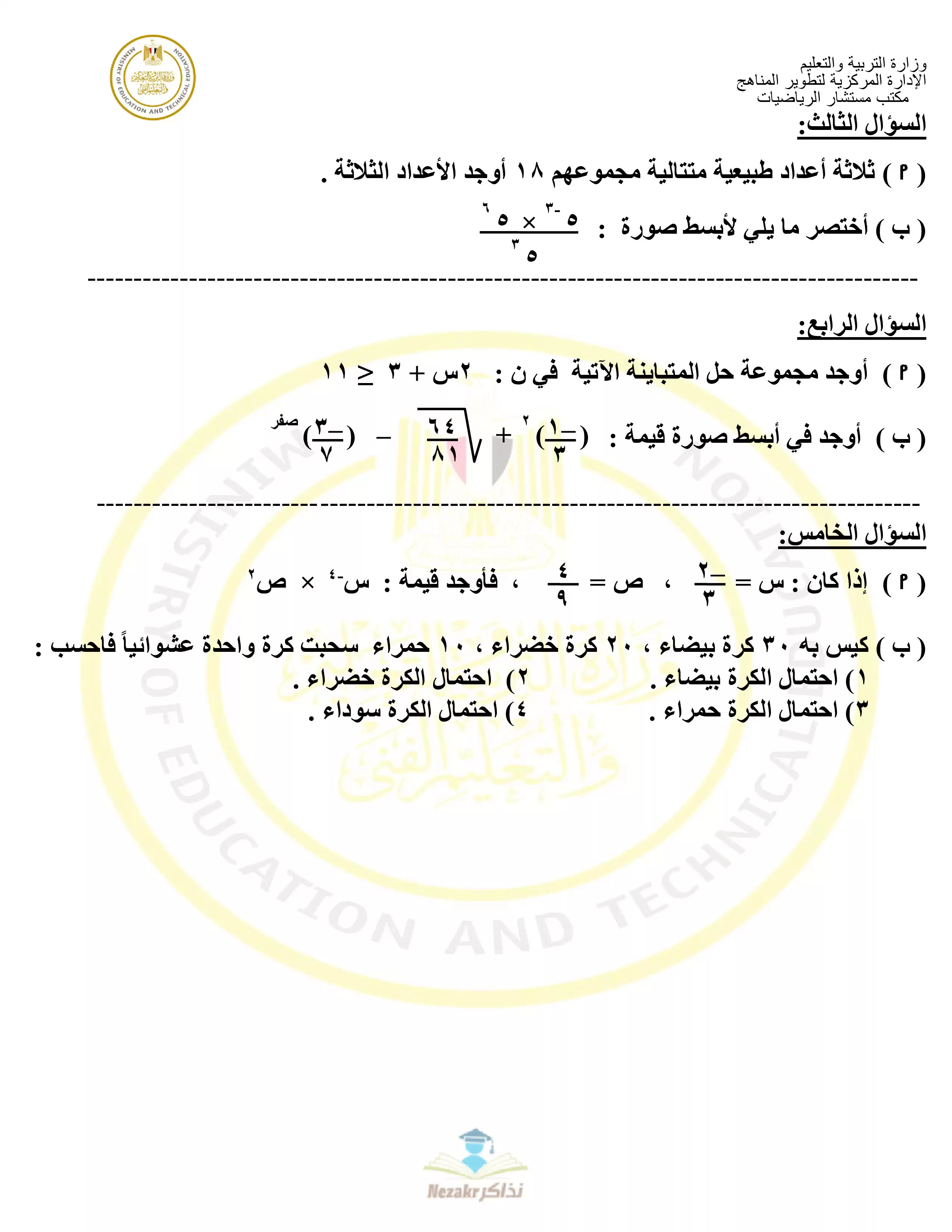• نموذج اختبار استرشادي في الجبر مكون من 5 أسئلة من إعداد مكتب مستشار الرياضيات