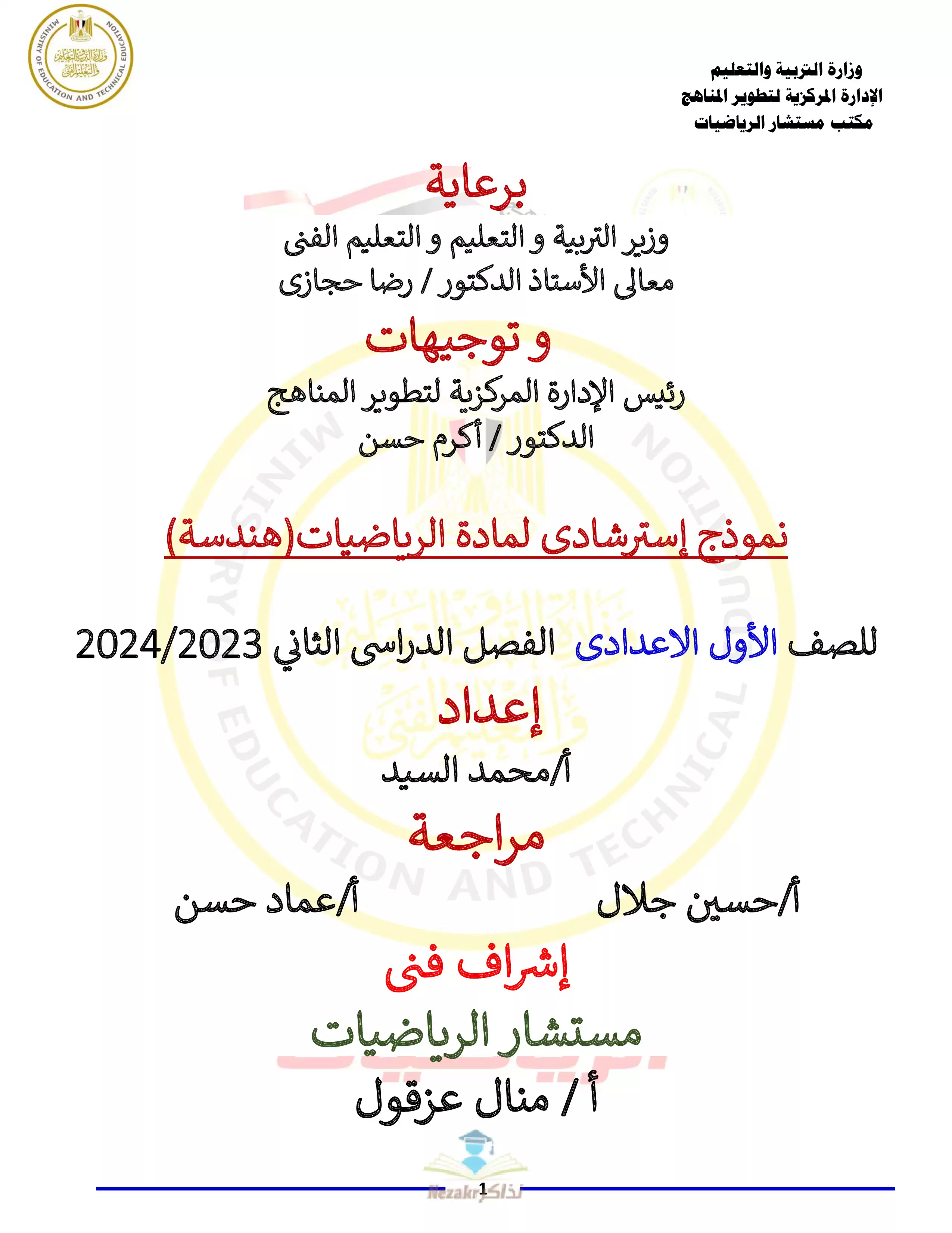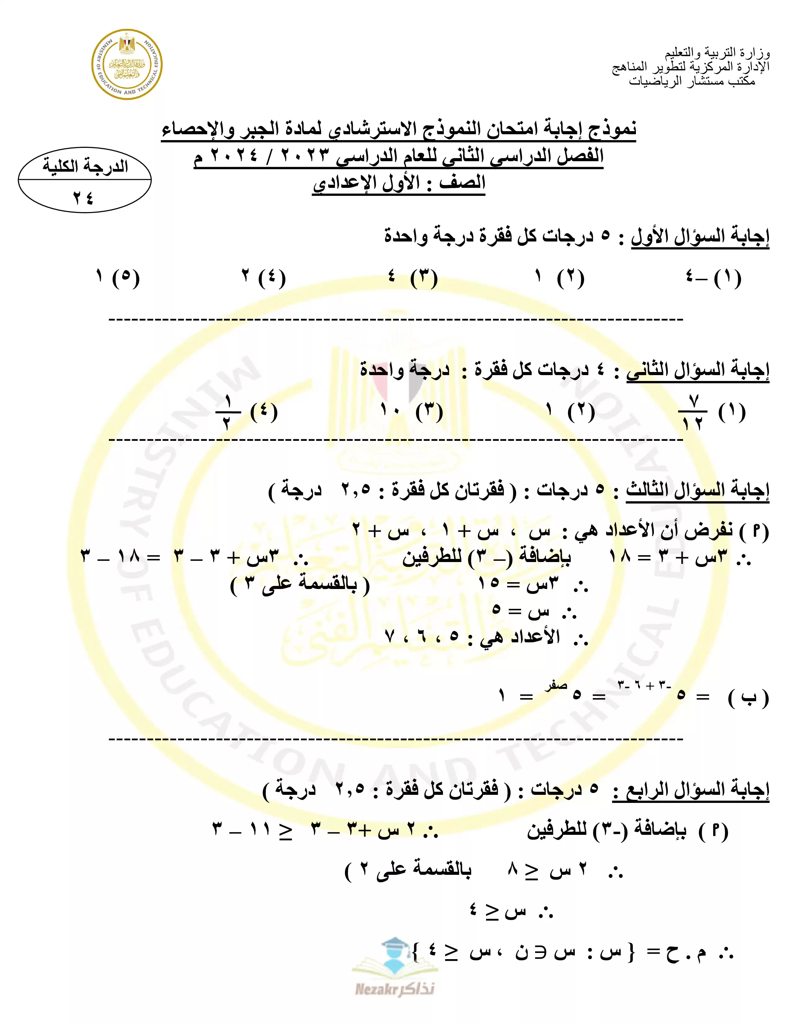 3. نموذج الإجابة الرسمي والنموذجي لاختباري الجبر والهندسة الاسترشاديين للصف الأول الإعدادي.