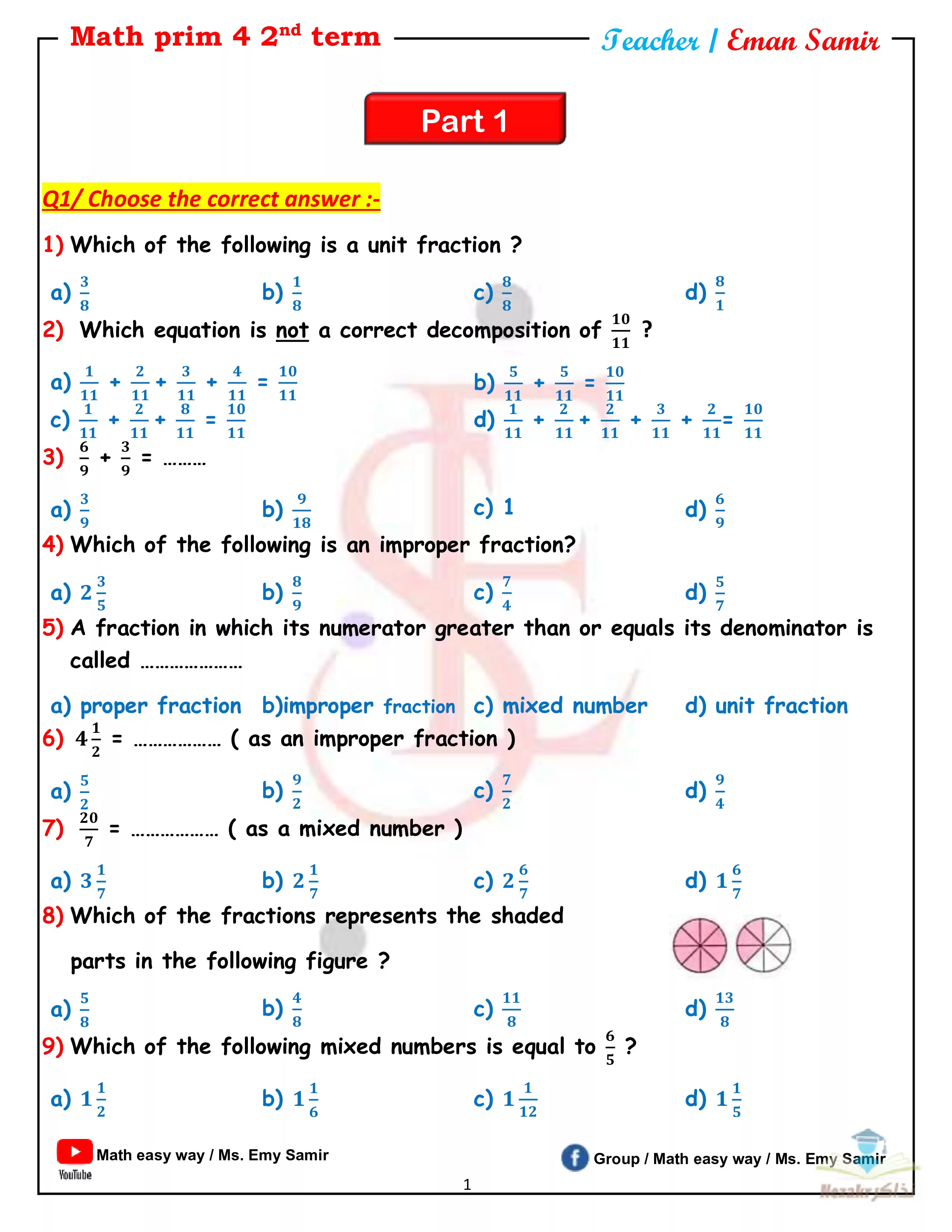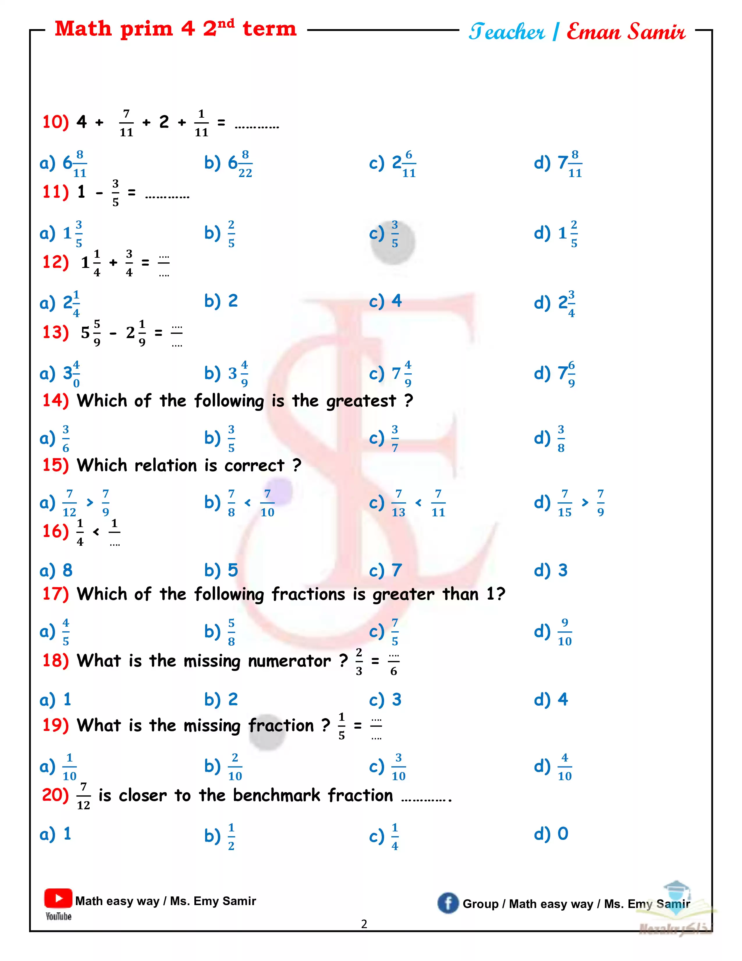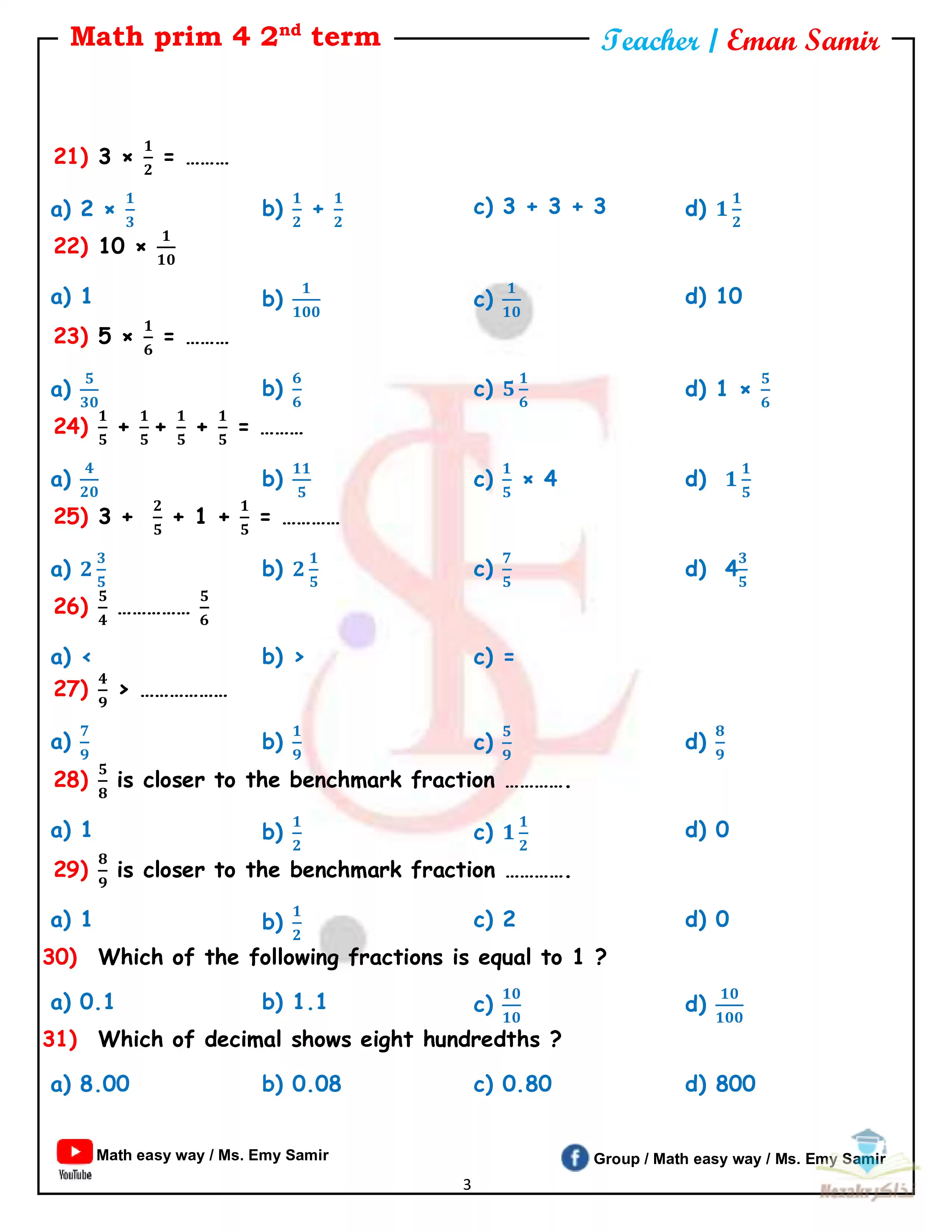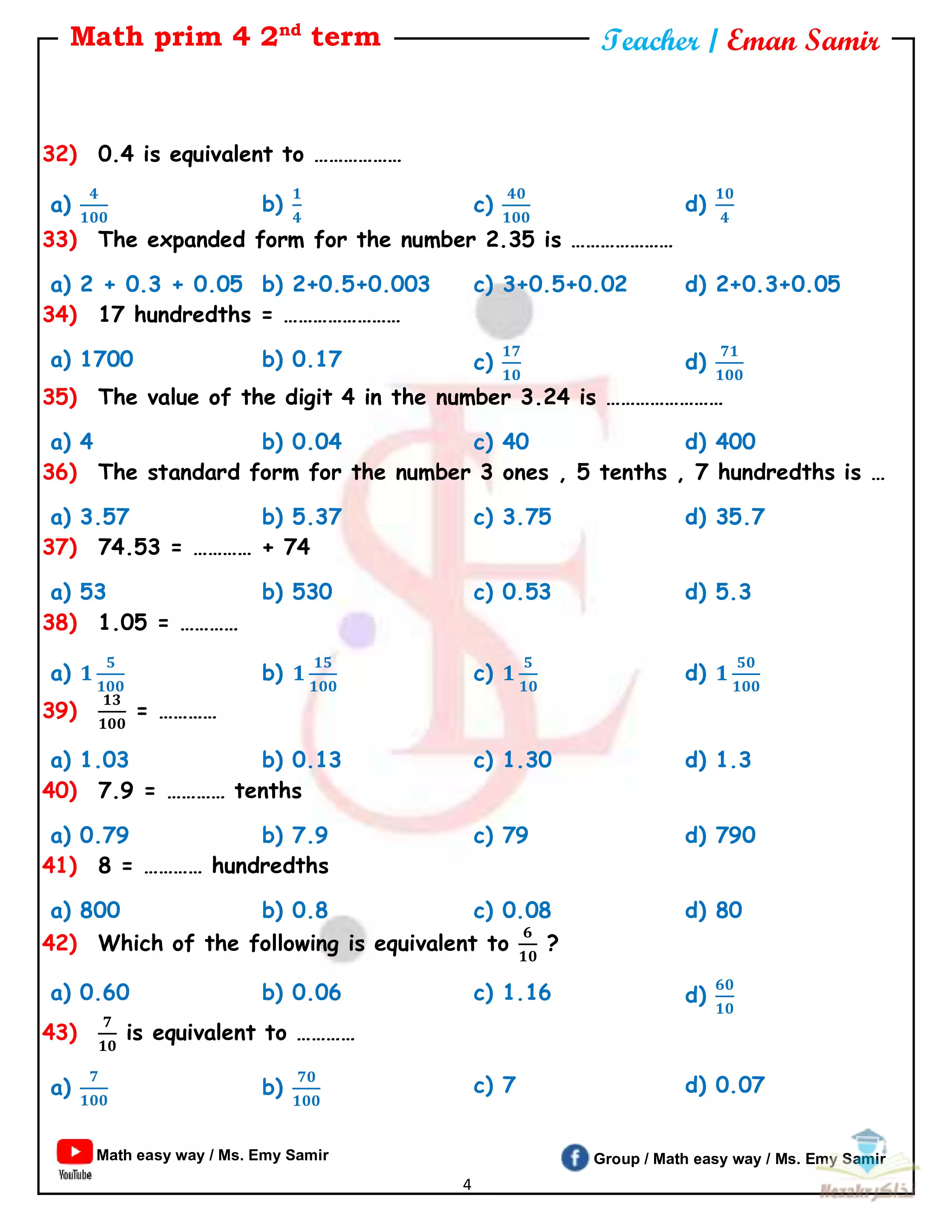 يحتوي الملف المرفق على مراجعة نهائية ماث رابعة ابتدائي ترم تاني من إعداد الأستاذة ايمي سمير للتحميل مجاناً بصيغة PDF.