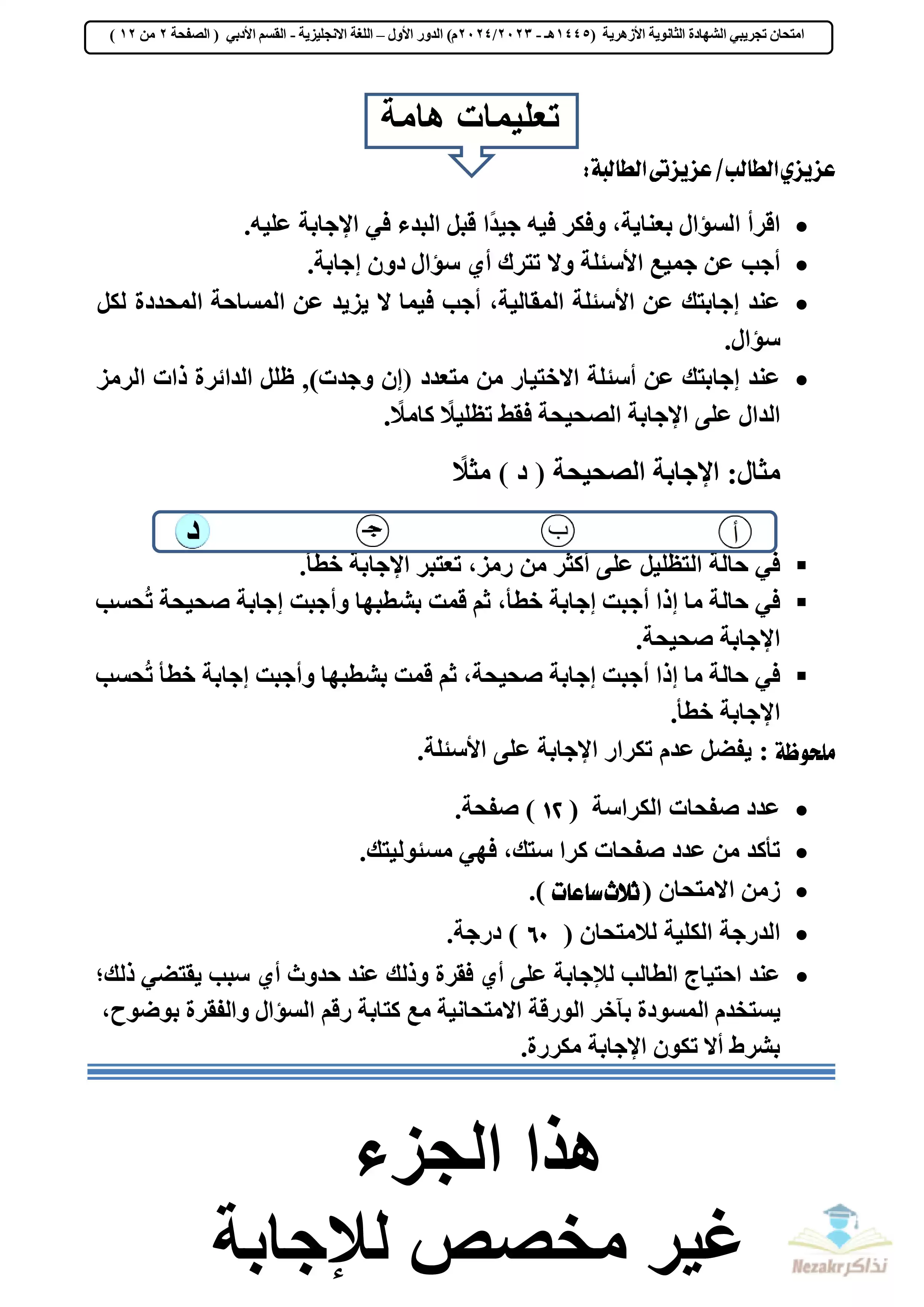 صفحة 2 من 12 صفحة من ملف: امتحان البوكليت التجريبي في اللغة الإنجليزية أدبي للشهادة الثانوية الأزهرية 2024 - Nezakr