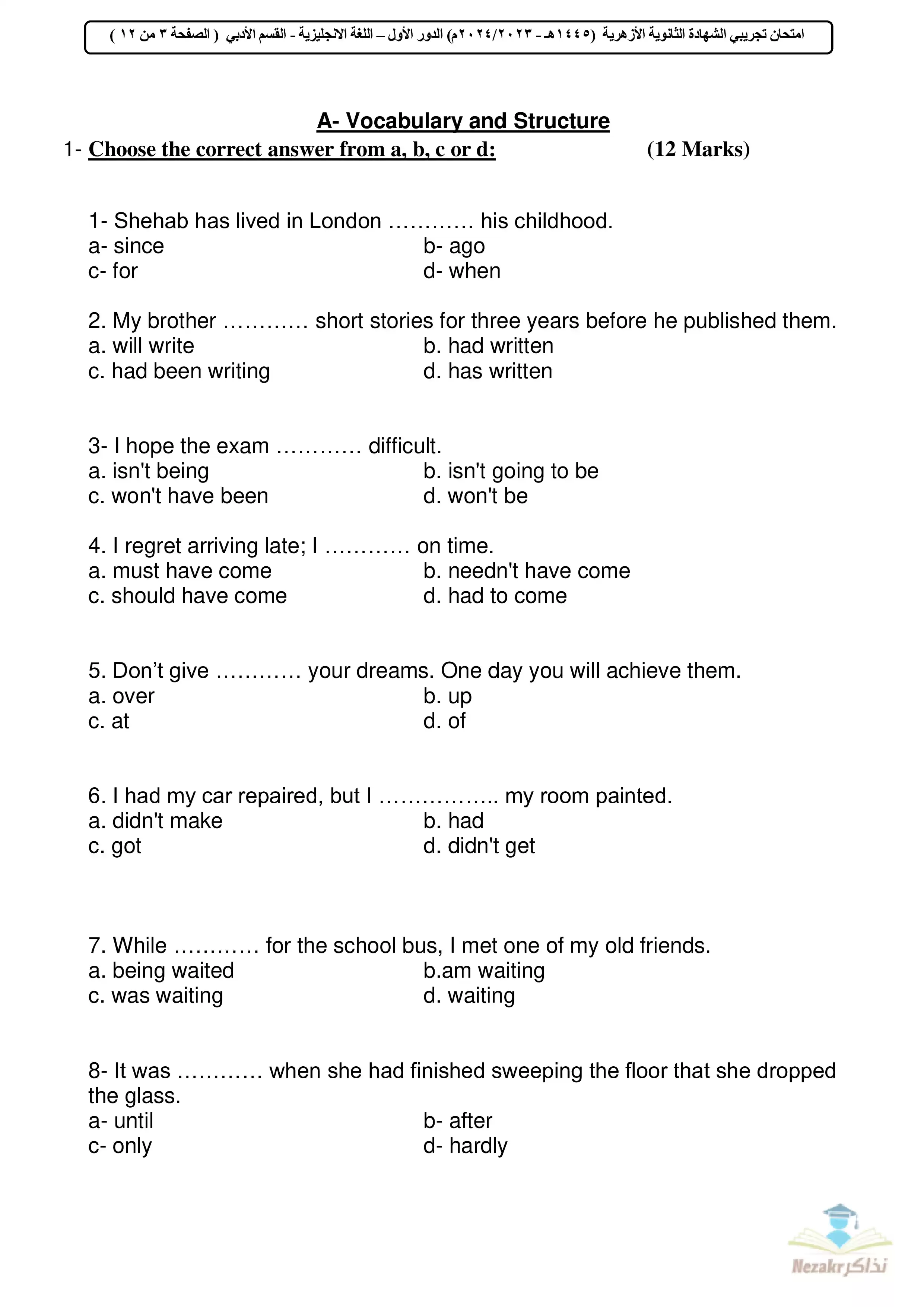 صفحة 3 من 12 صفحة من ملف: امتحان البوكليت التجريبي في اللغة الإنجليزية أدبي للشهادة الثانوية الأزهرية 2024 - Nezakr