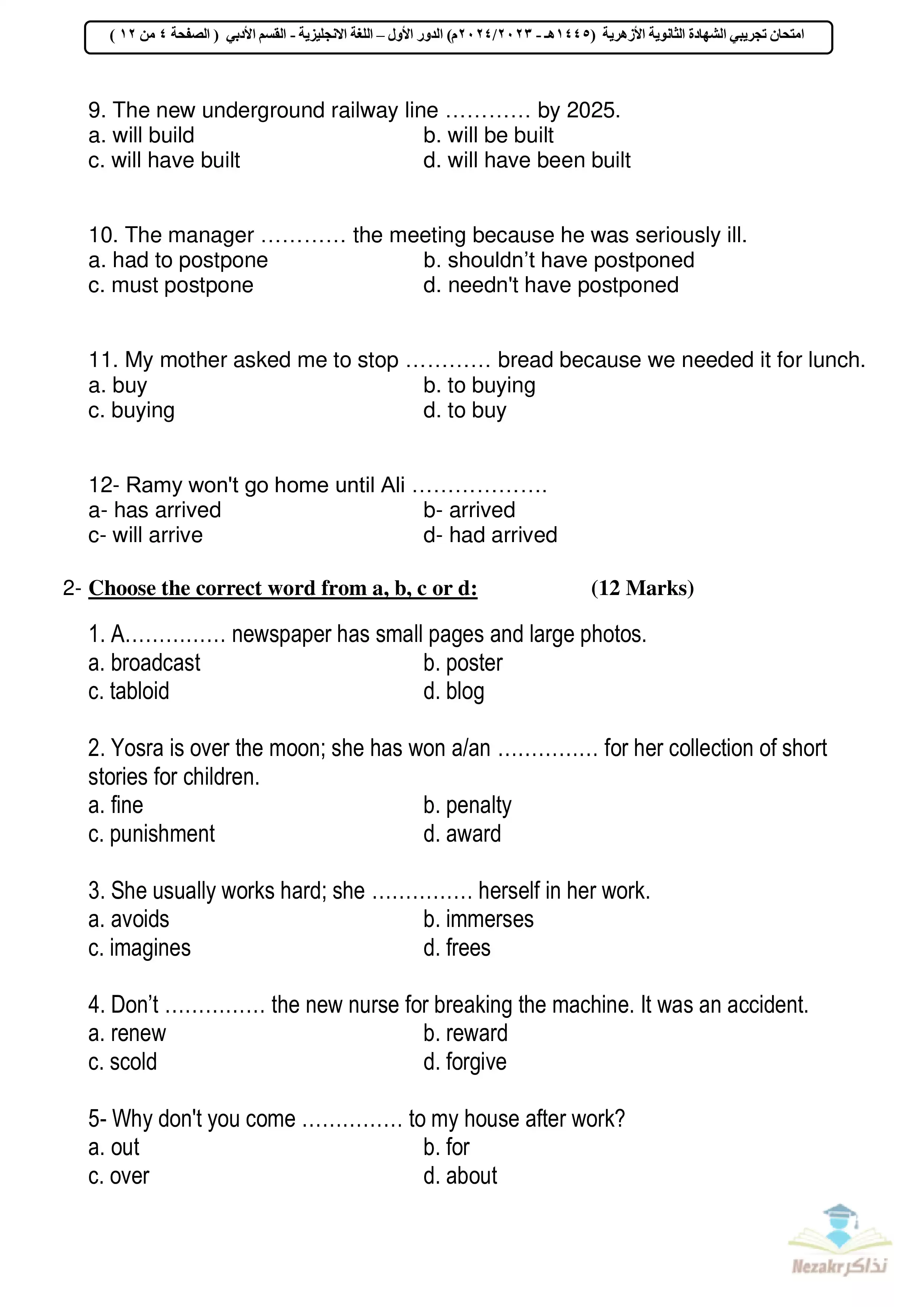 صفحة 4 من 12 صفحة من ملف: امتحان البوكليت التجريبي في اللغة الإنجليزية أدبي للشهادة الثانوية الأزهرية 2024 - Nezakr