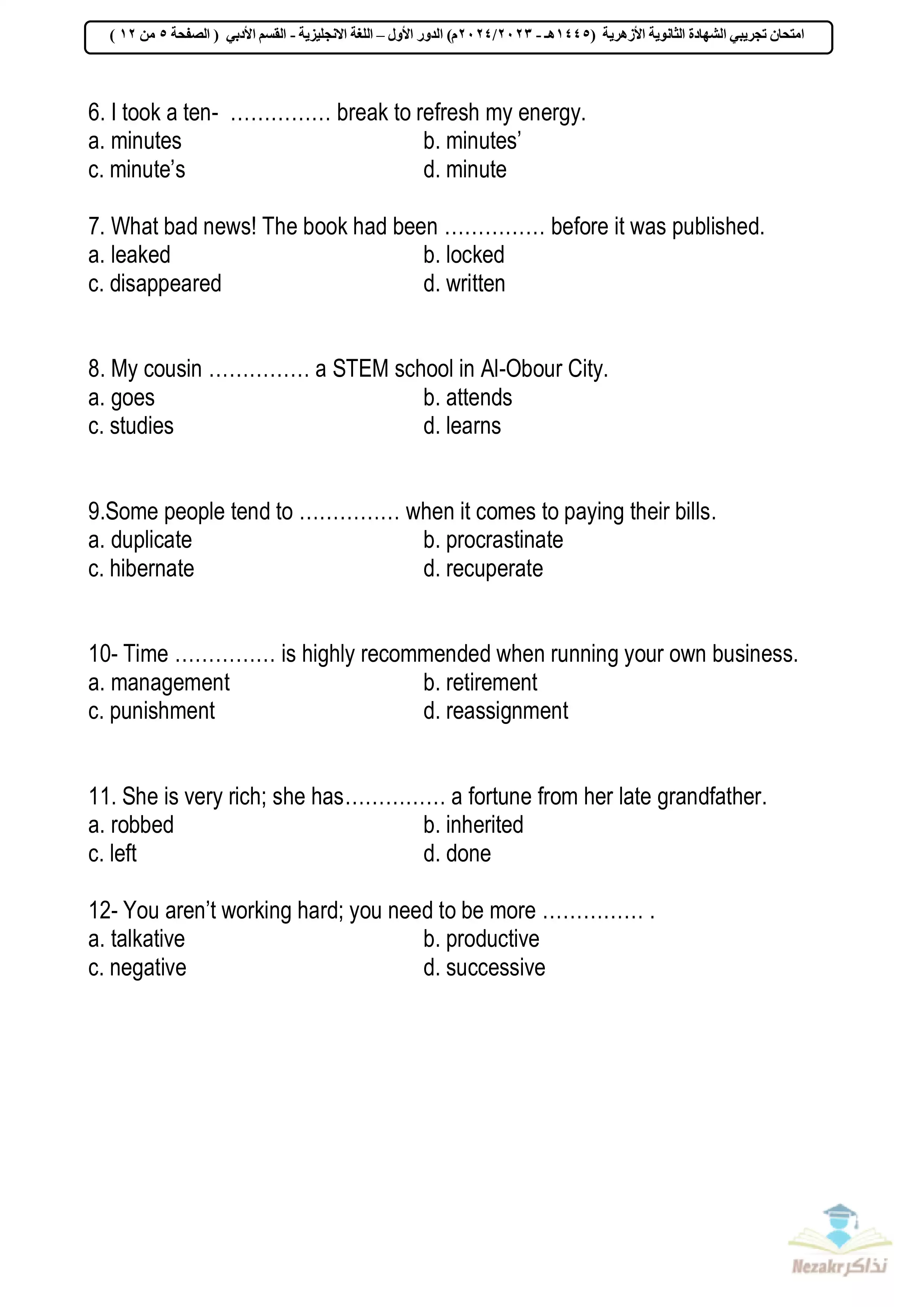 صفحة 5 من 12 صفحة من ملف: امتحان البوكليت التجريبي في اللغة الإنجليزية أدبي للشهادة الثانوية الأزهرية 2024 - Nezakr