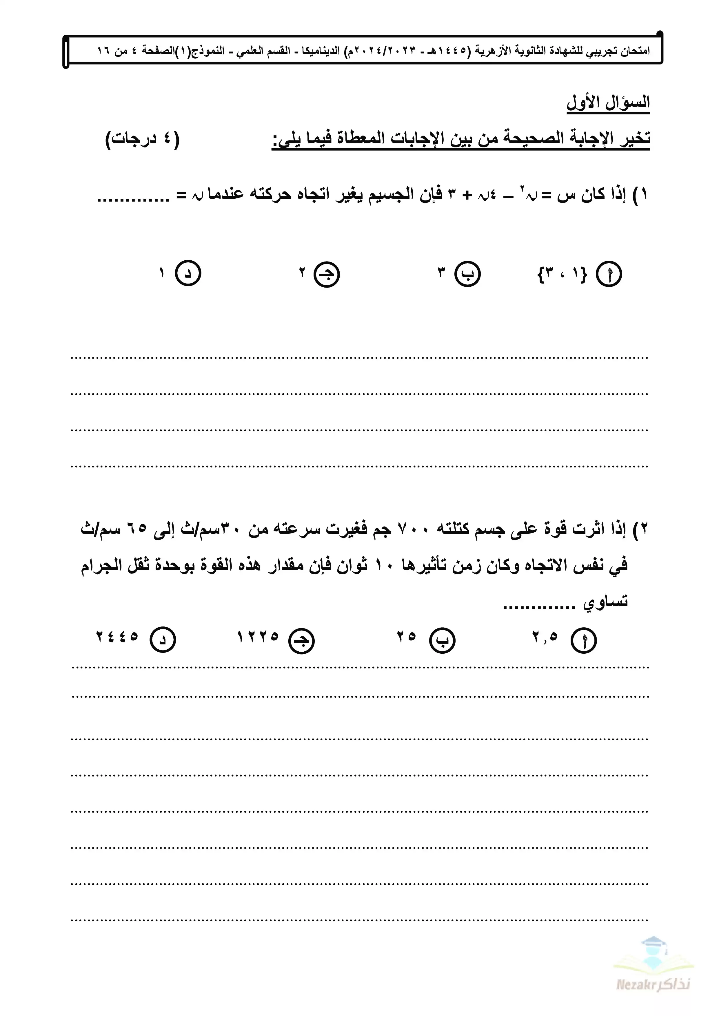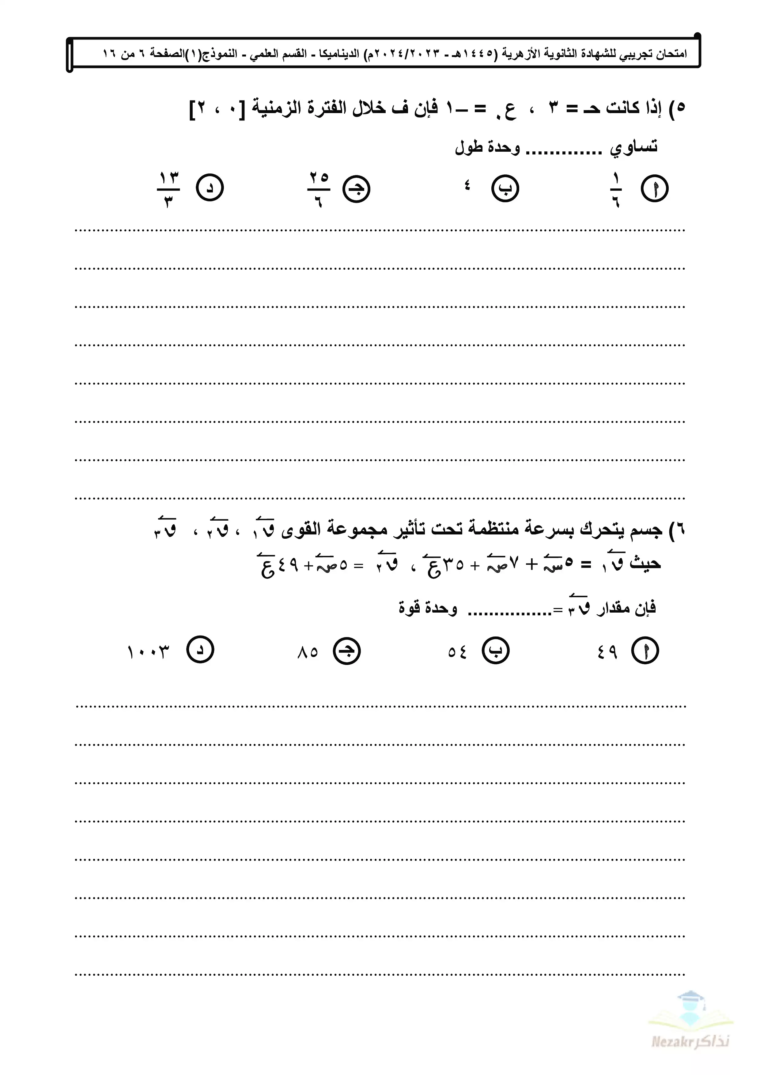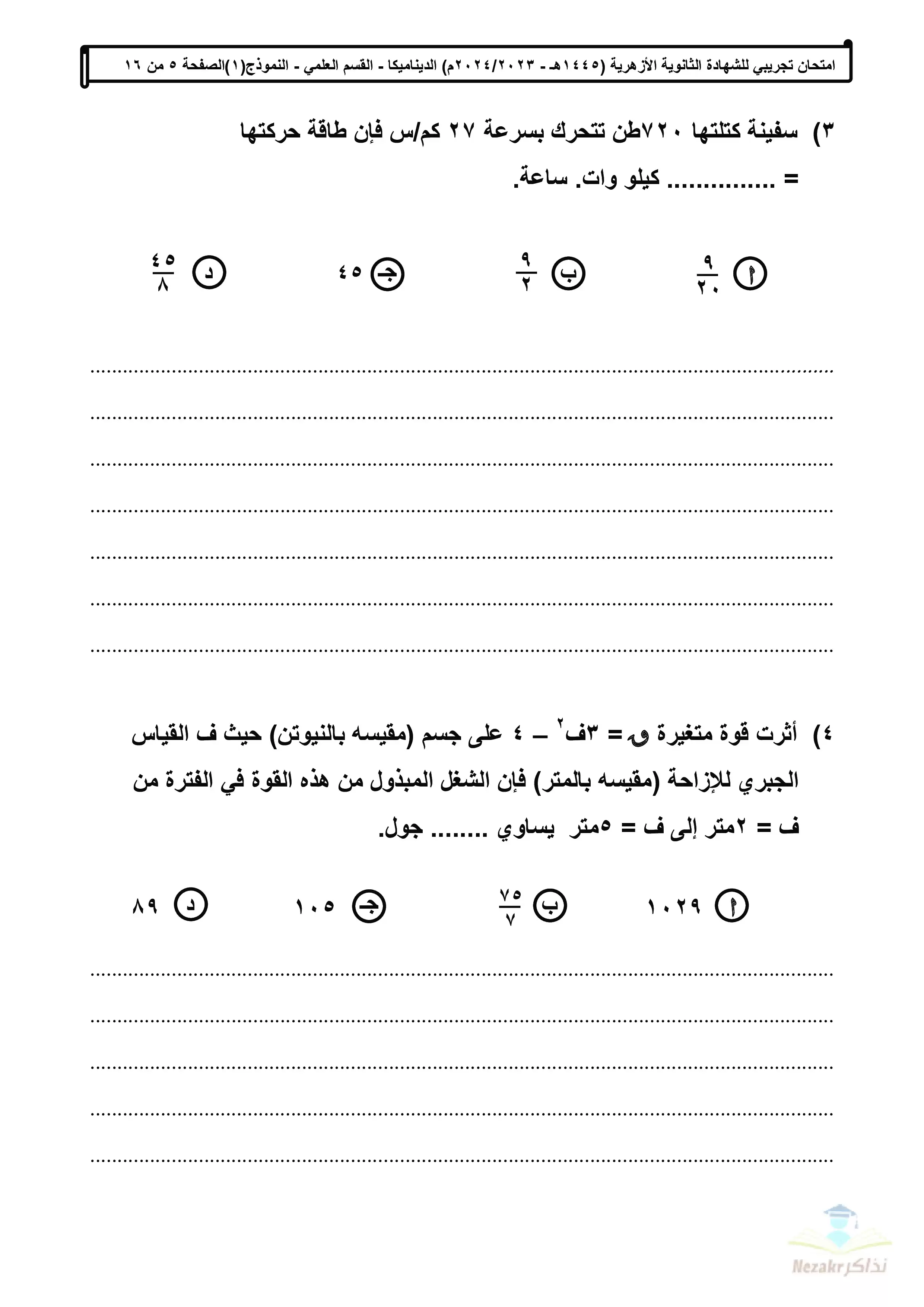 | بيانات الملف: (الامتحان التجريبي في الديناميكا للشهادة الثانوية الأزهرية 2024 - Nezakr) | |