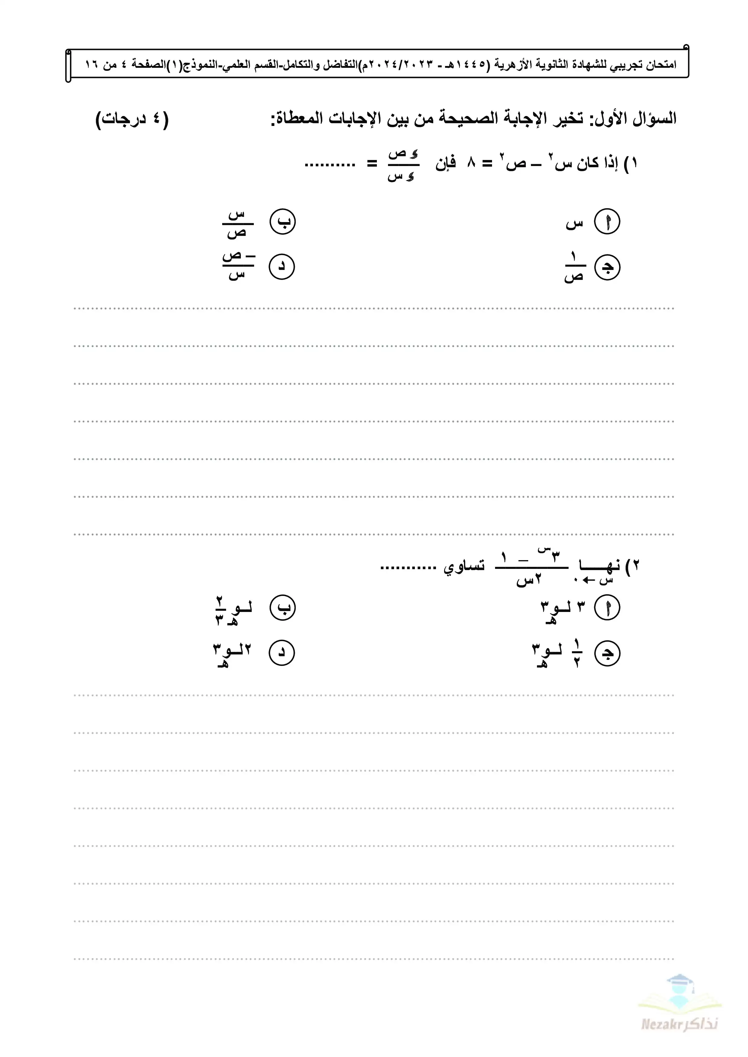 صفحة 4 من 16 صفحة من ملف: الامتحان التجريبي في التفاضل والتكامل للشهادة الثانوية الأزهرية 2024 - Nezakr