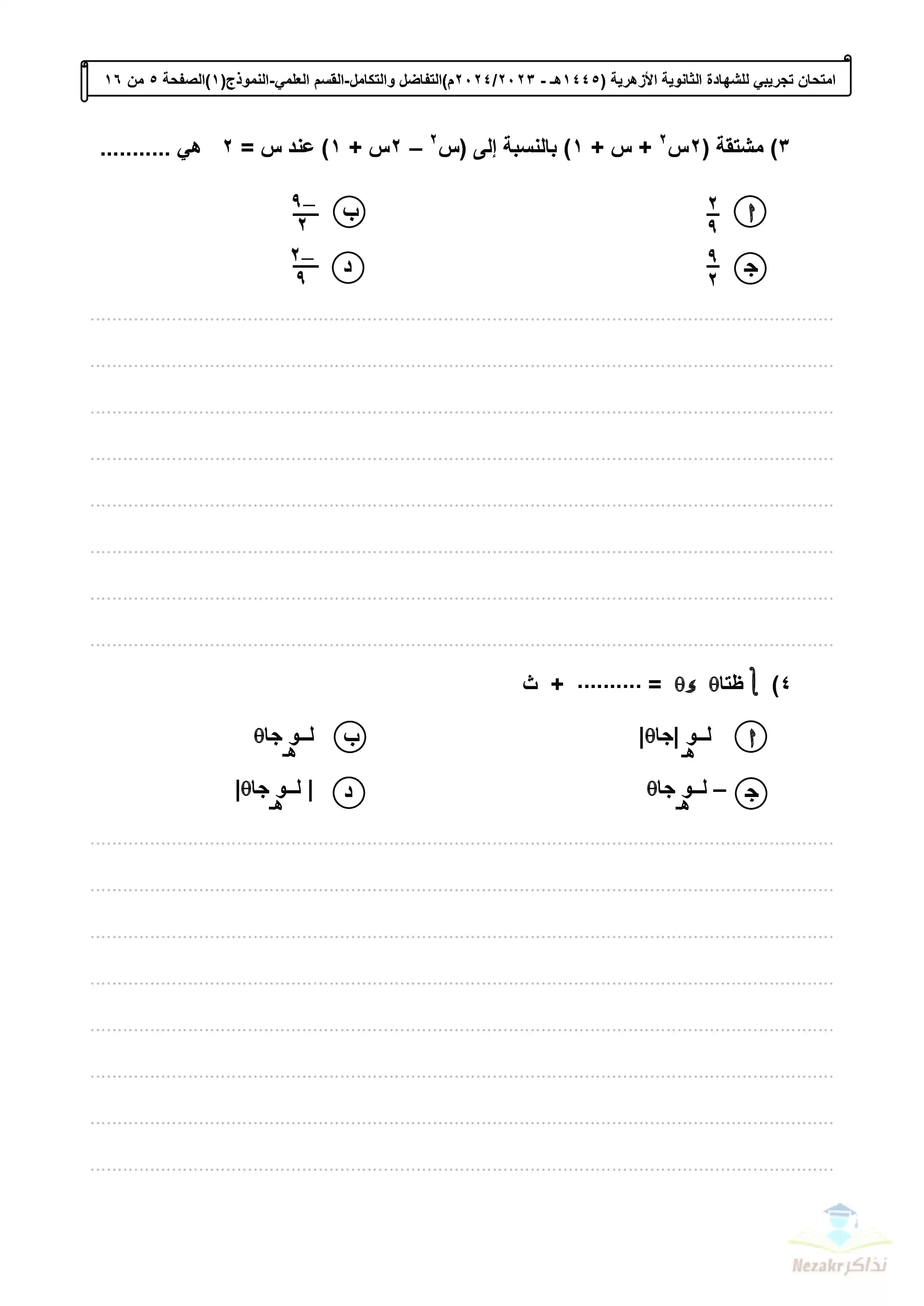 صفحة 5 من 16 صفحة من ملف: الامتحان التجريبي في التفاضل والتكامل للشهادة الثانوية الأزهرية 2024 - Nezakr