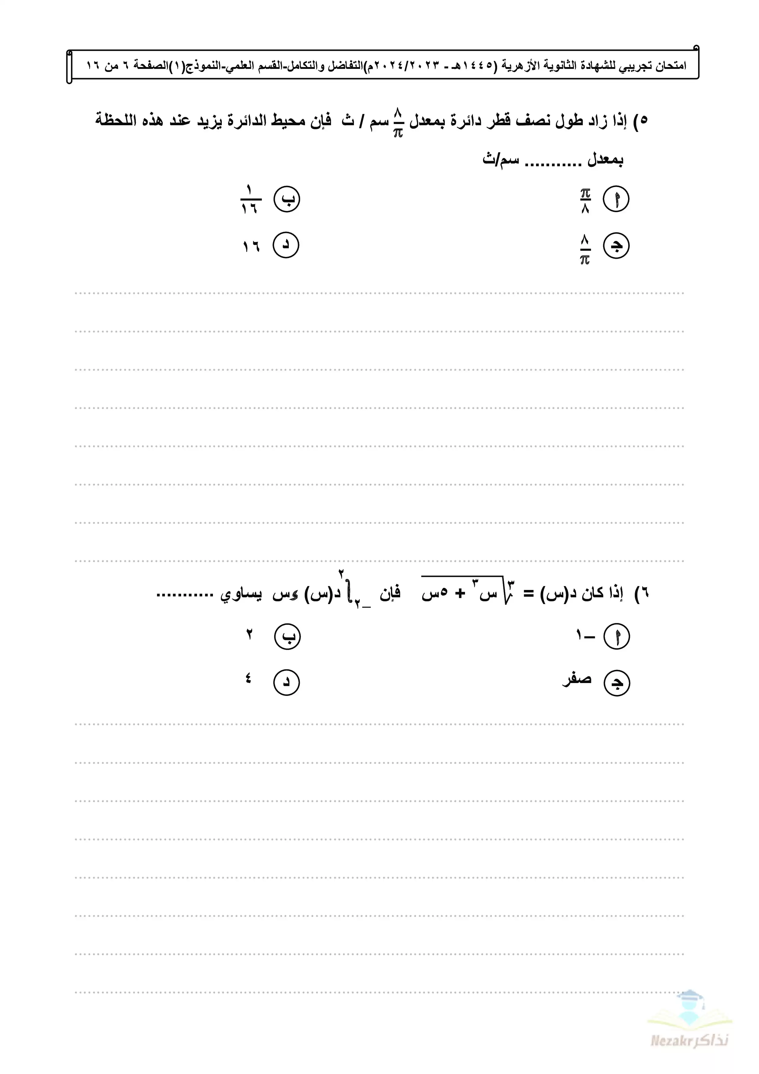 صفحة 6 من 16 صفحة من ملف: الامتحان التجريبي في التفاضل والتكامل للشهادة الثانوية الأزهرية 2024 - Nezakr