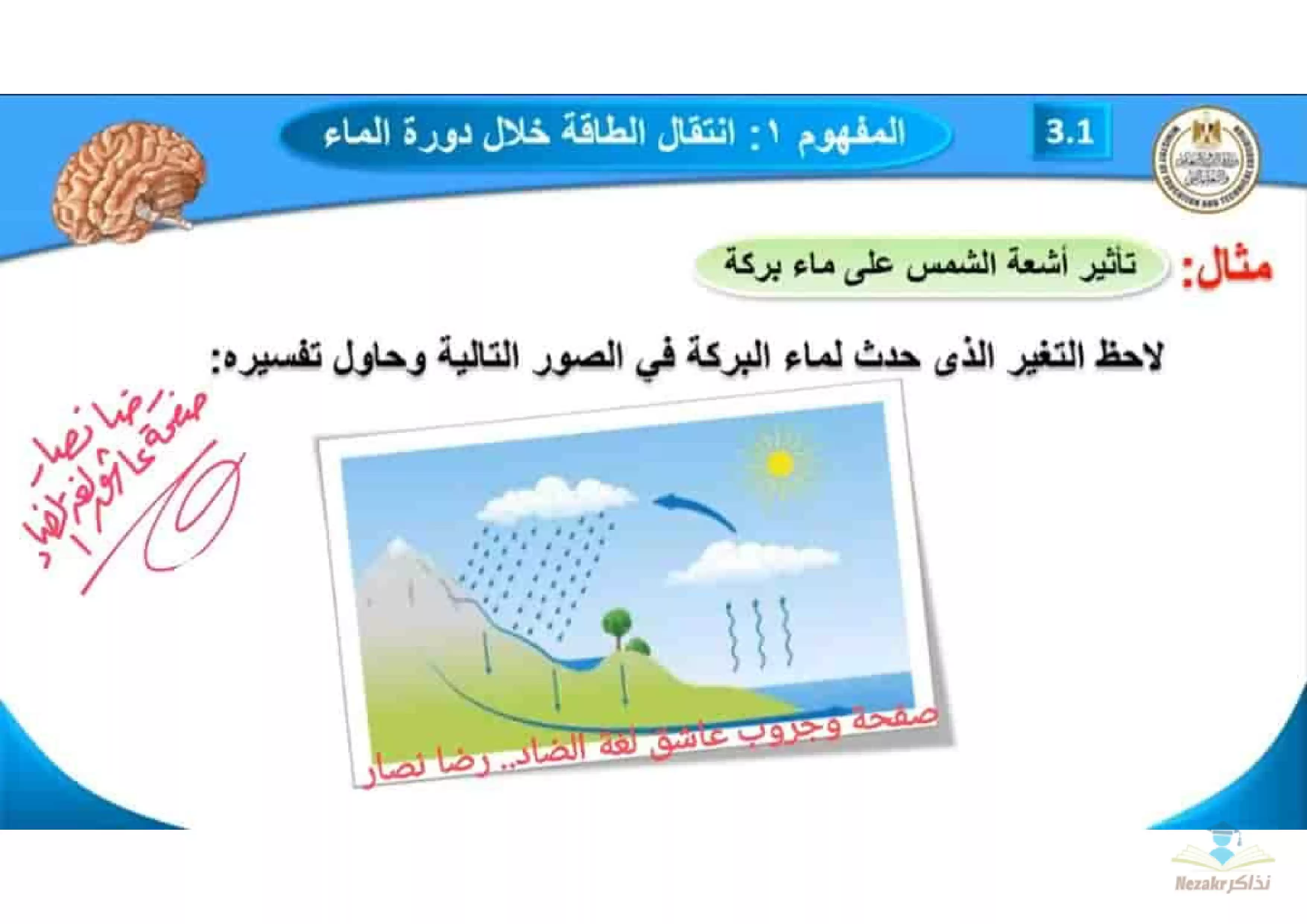 - الكثير من الأمثلة على المفهوم الأول (انتقال الطاقة خلال دورة المياه).