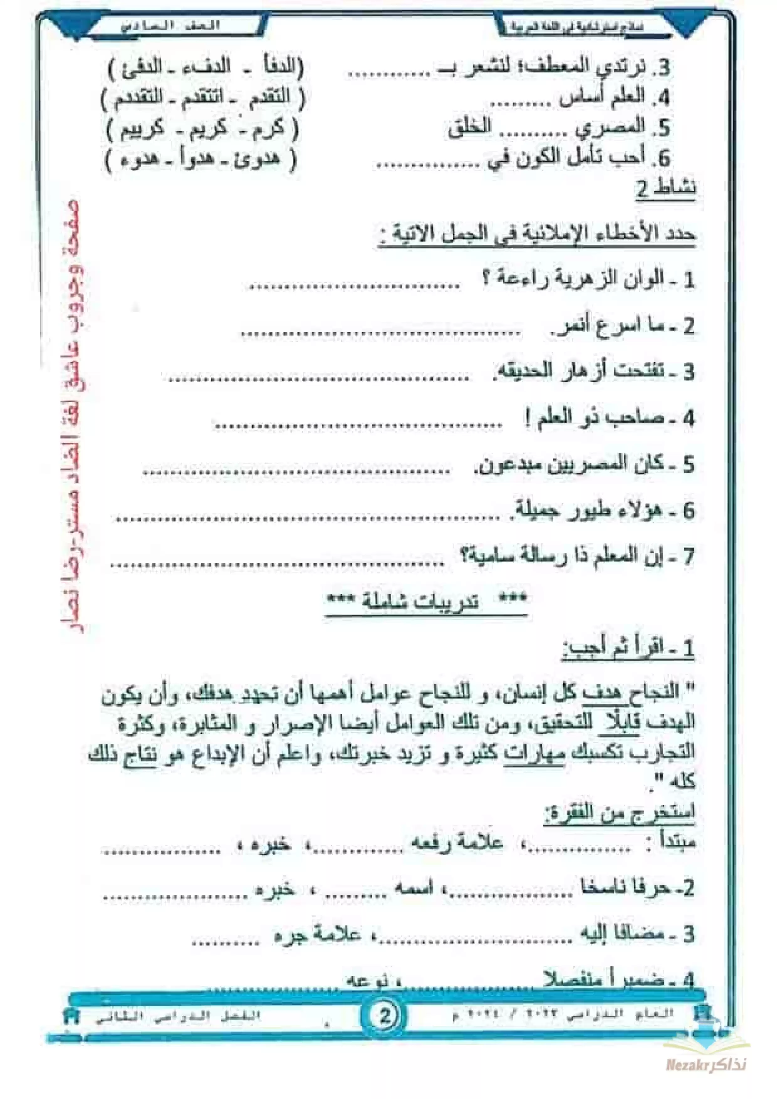 صفحة 6 من 62 صفحة من ملف: نماذج استرشادية في اللغة العربية للصف السادس الابتدائي ترم 2 - توجيه العربي بمحافظة الدقهلية