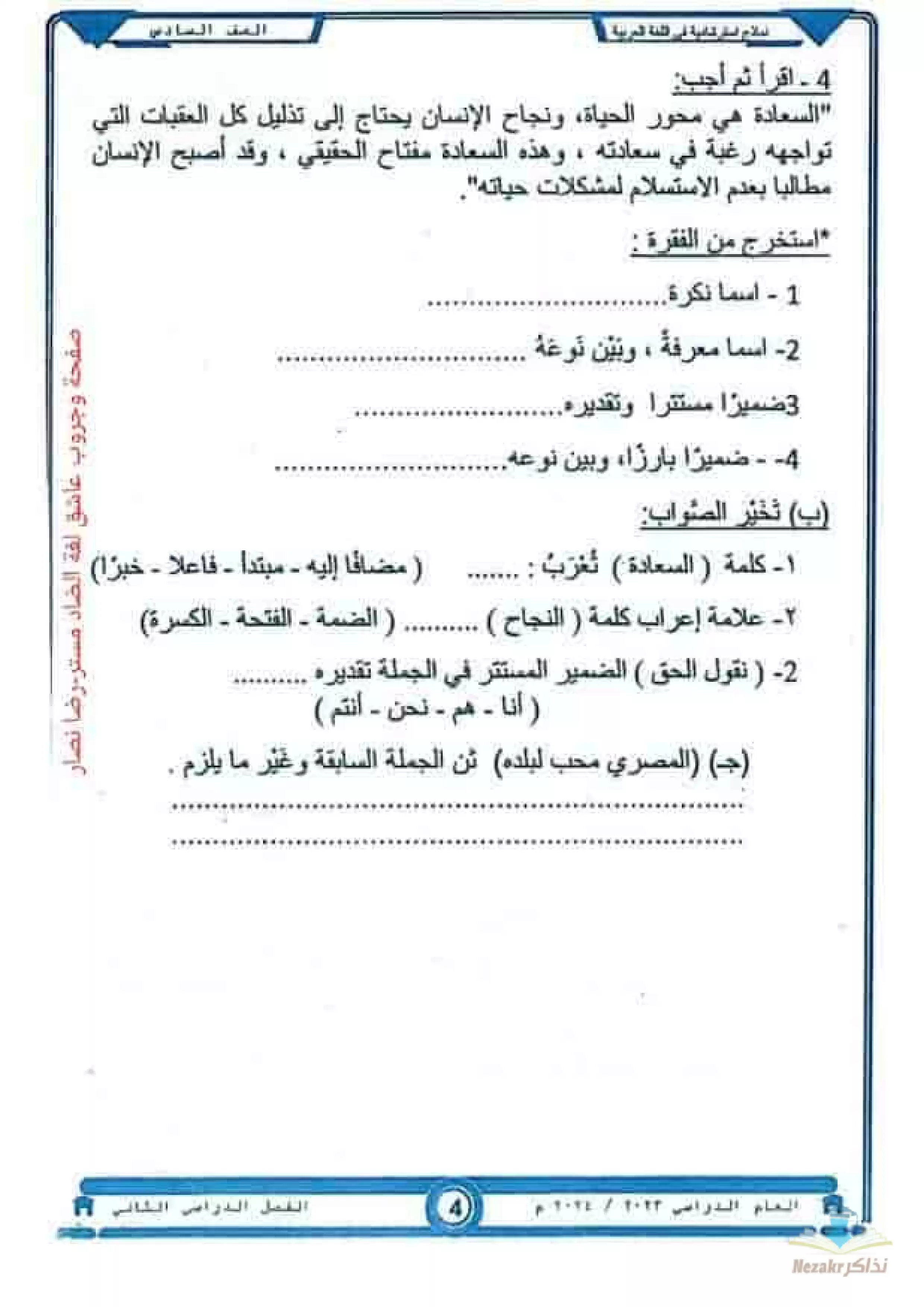 صفحة 4 من 62 صفحة من ملف: نماذج استرشادية في اللغة العربية للصف السادس الابتدائي ترم 2 - توجيه العربي بمحافظة الدقهلية