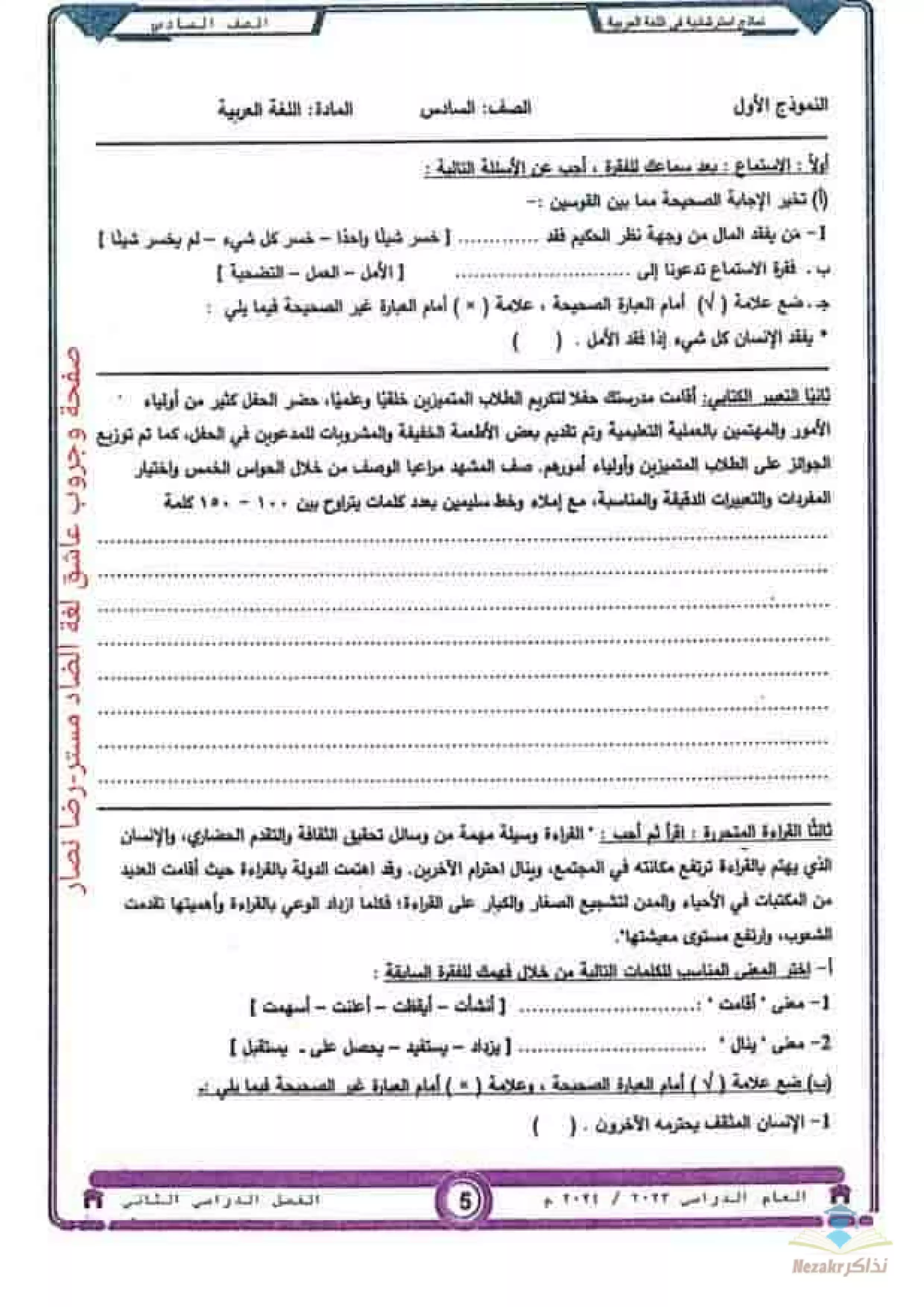 صفحة 5 من 62 صفحة من ملف: نماذج استرشادية في اللغة العربية للصف السادس الابتدائي ترم 2 - توجيه العربي بمحافظة الدقهلية
