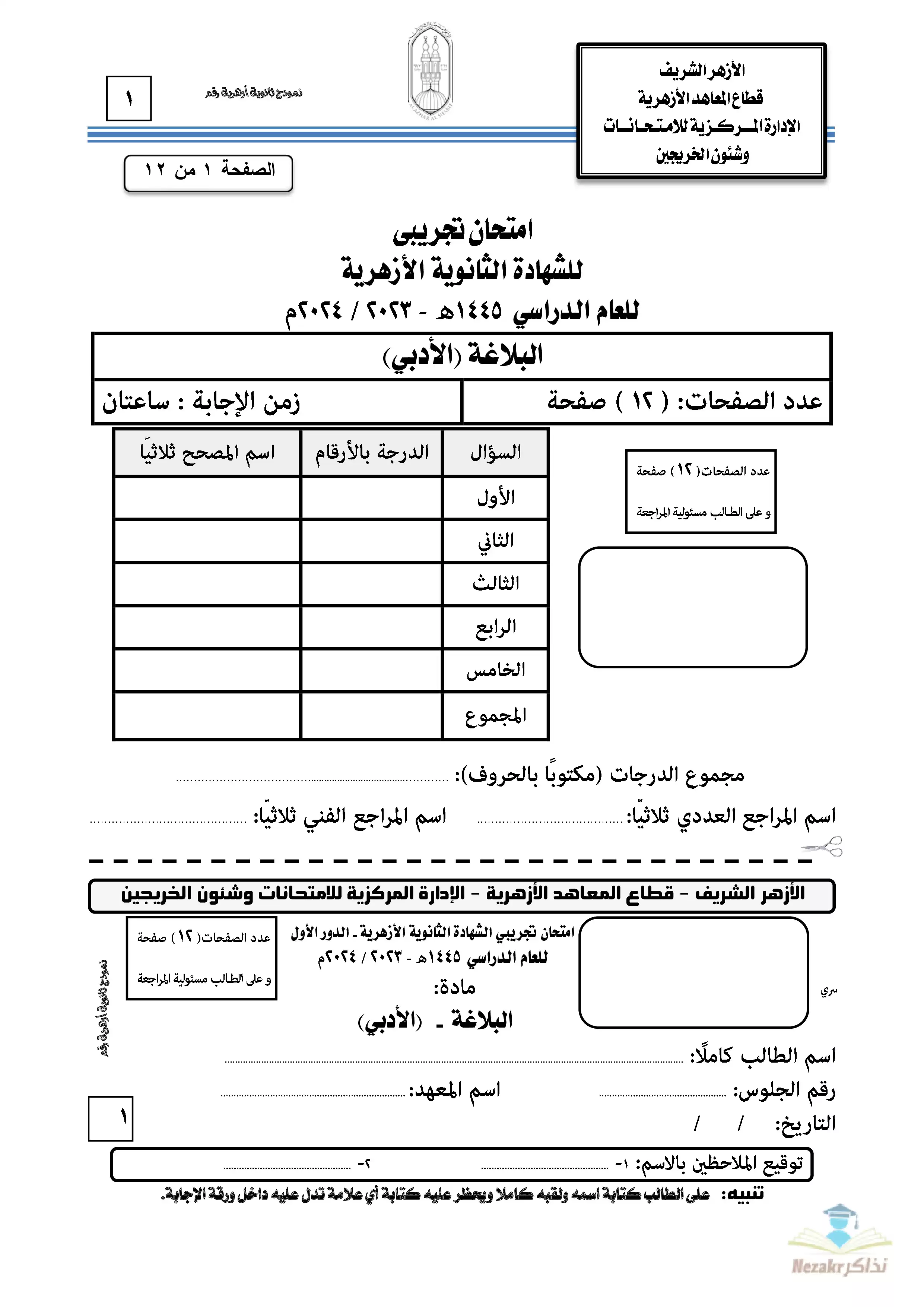 يمكنك معاينة ملف الامتحان التجريبي في البلاغة للثانوية الأزهرية القسم الأدبي - Nezakr بالكامل والمكون من 12 صفحة عن طريق الضغط على زر معاينة الملف الموجود بالأسفل أو عن طريق تحميل الملف..