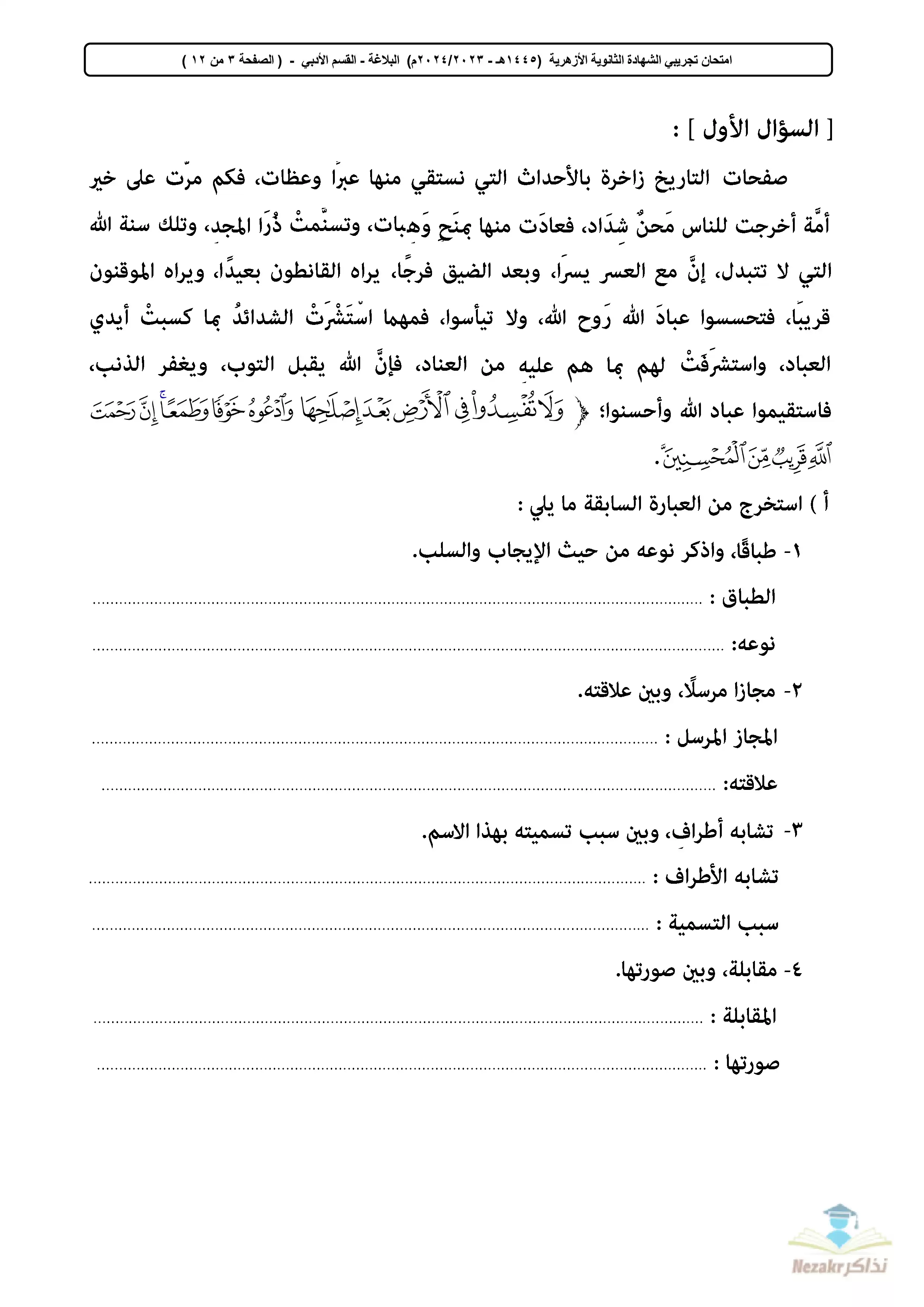 صفحة 3 من 12 صفحة من ملف: الامتحان التجريبي في البلاغة للثانوية الأزهرية القسم الأدبي - Nezakr