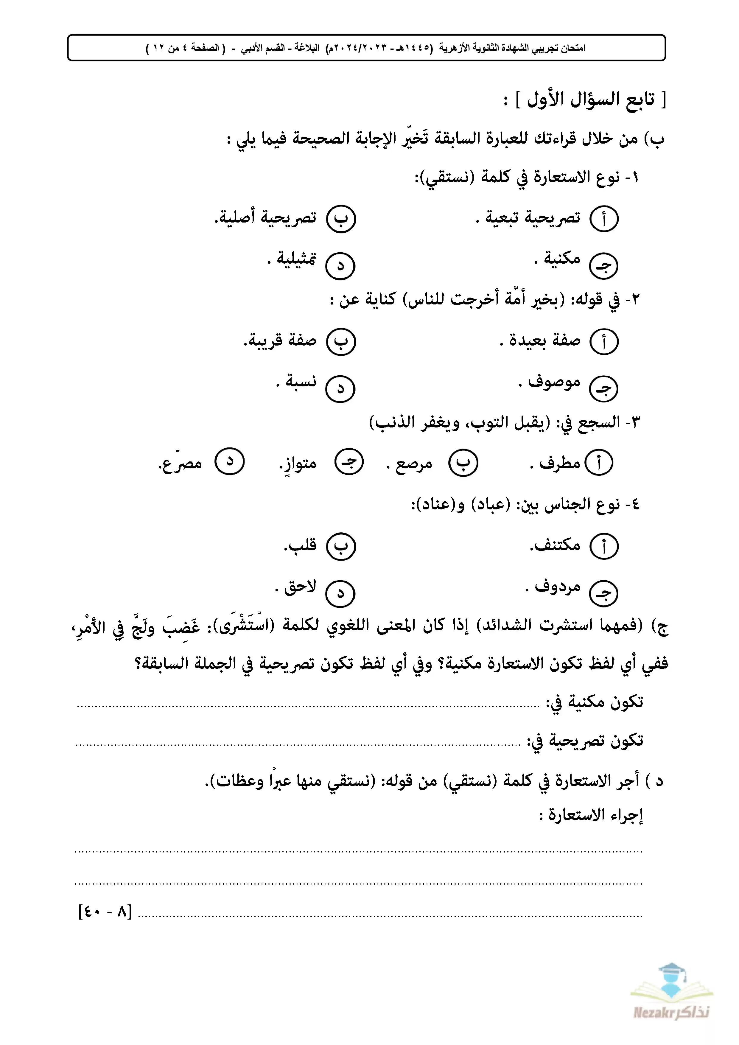 الامتحان التجريبي في البلاغة للثانوية الأزهرية القسم الأدبي - Nezakr