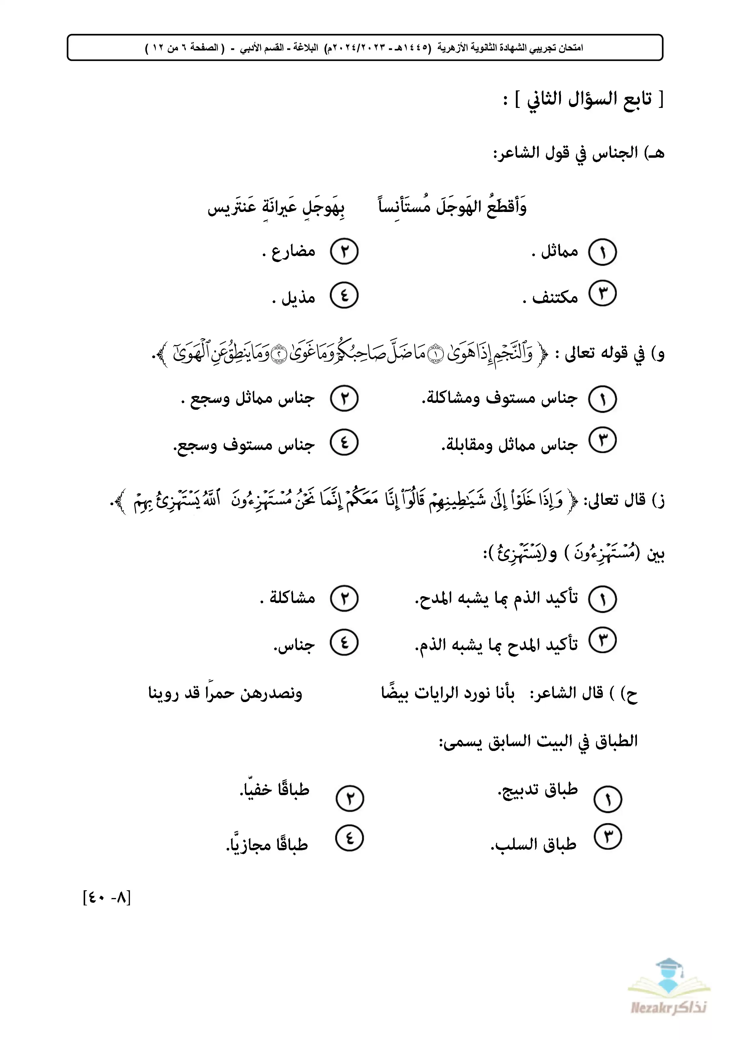 صفحة 6 من 12 صفحة من ملف: الامتحان التجريبي في البلاغة للثانوية الأزهرية القسم الأدبي - Nezakr