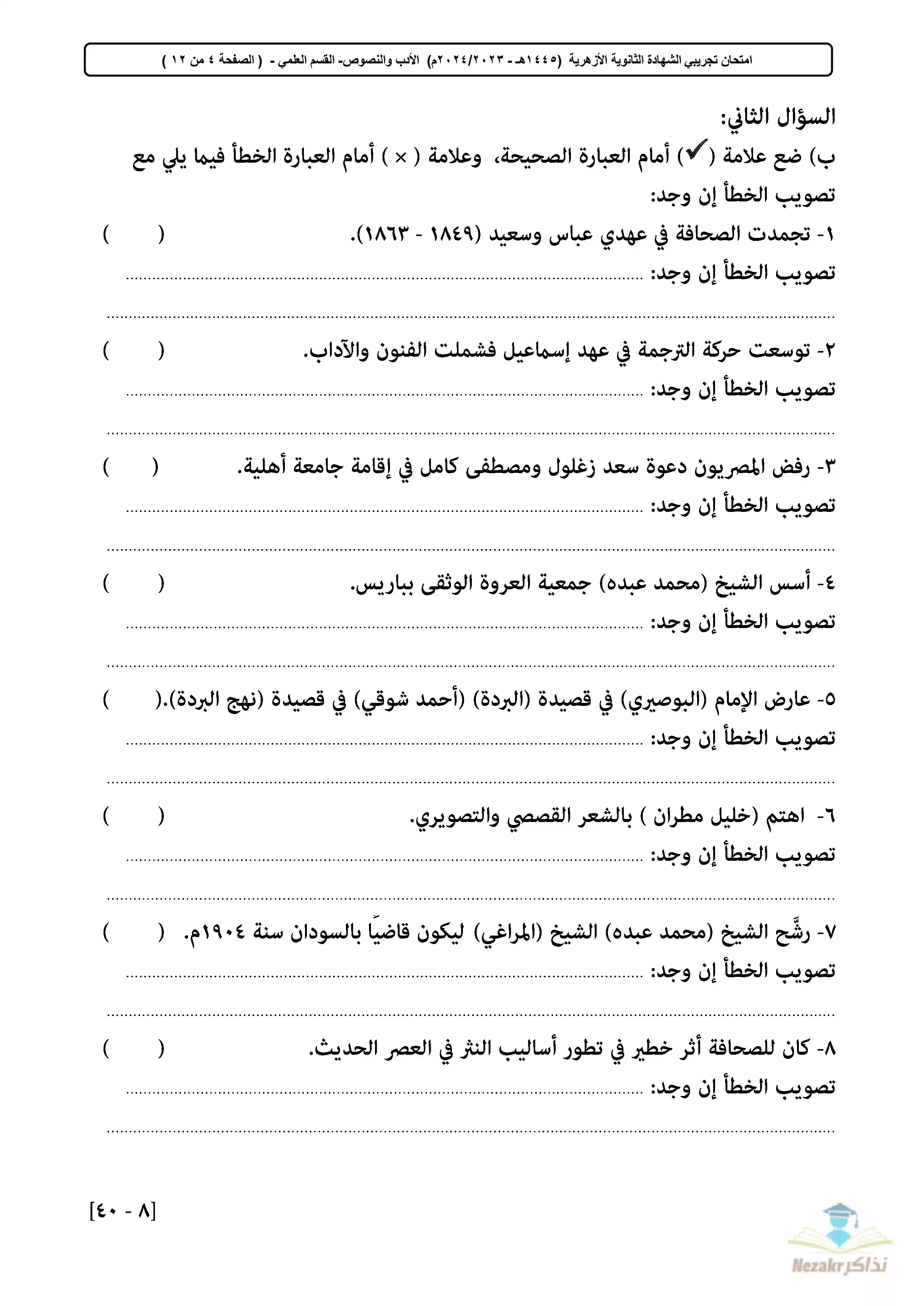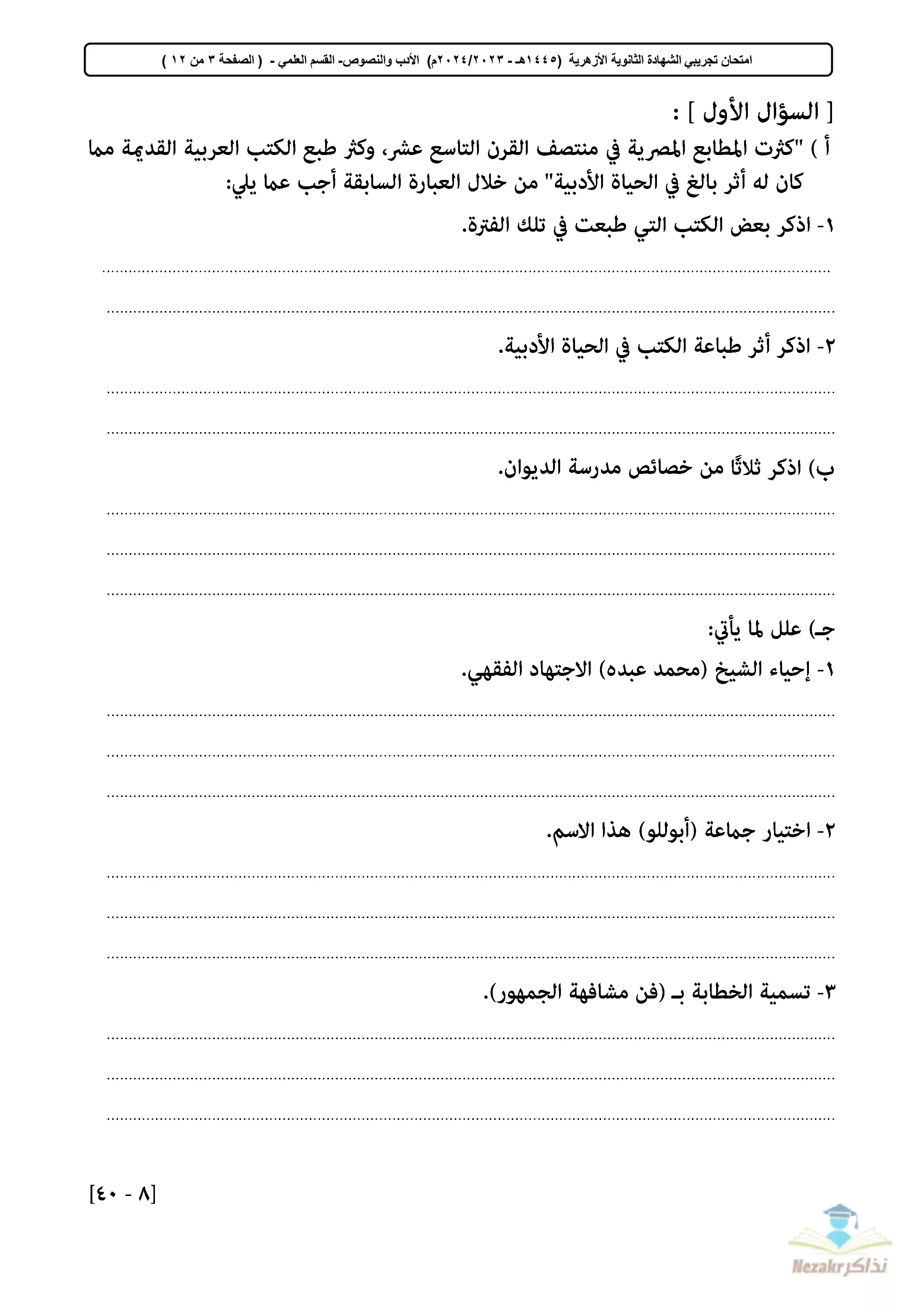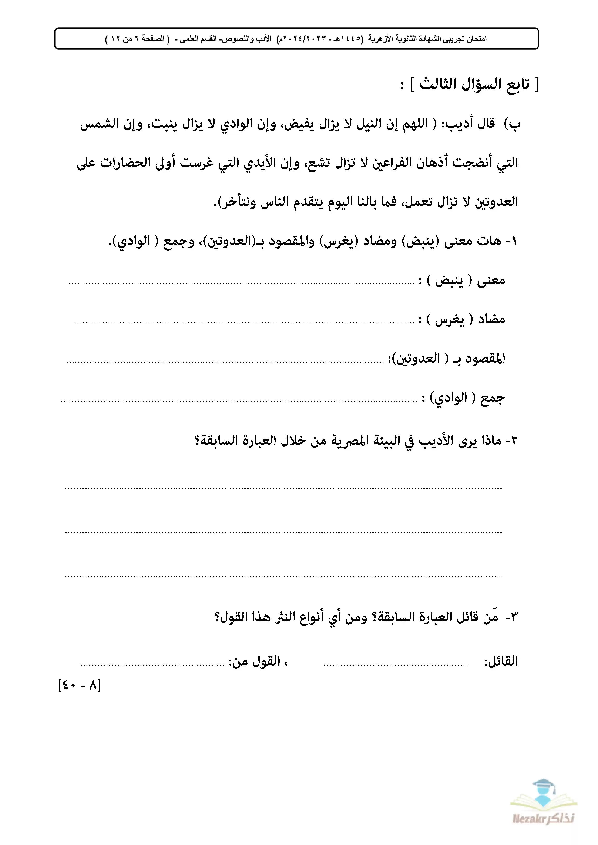 سكرين شوت من الملف: تجميع الامتحان التجريبي في اللغة العربية للثانوية الأزهرية القسم العلمي 2024 - Nezakr