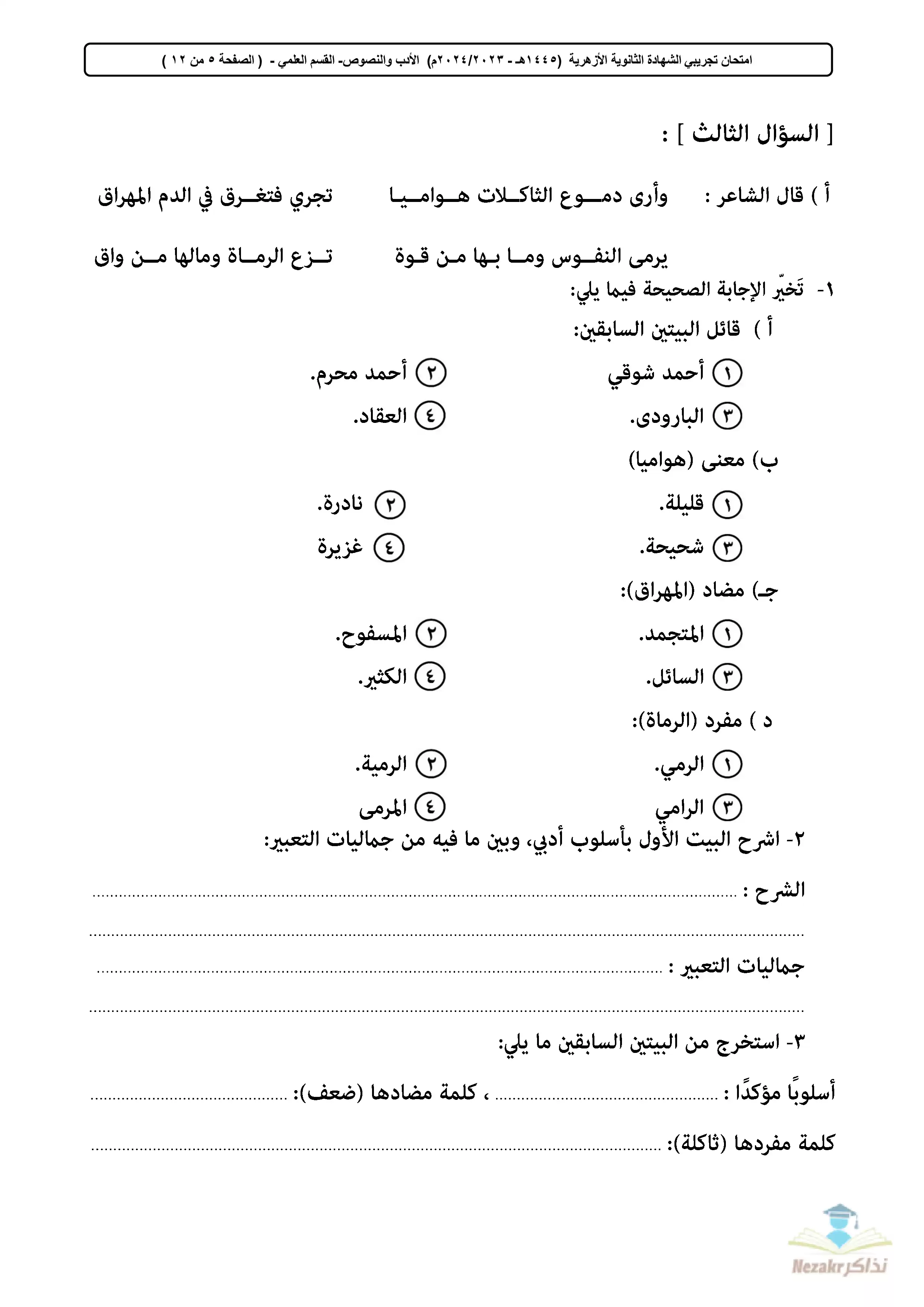 صفحة 5 من 48 صفحة من ملف: تجميع الامتحان التجريبي في اللغة العربية للثانوية الأزهرية القسم العلمي 2024 - Nezakr