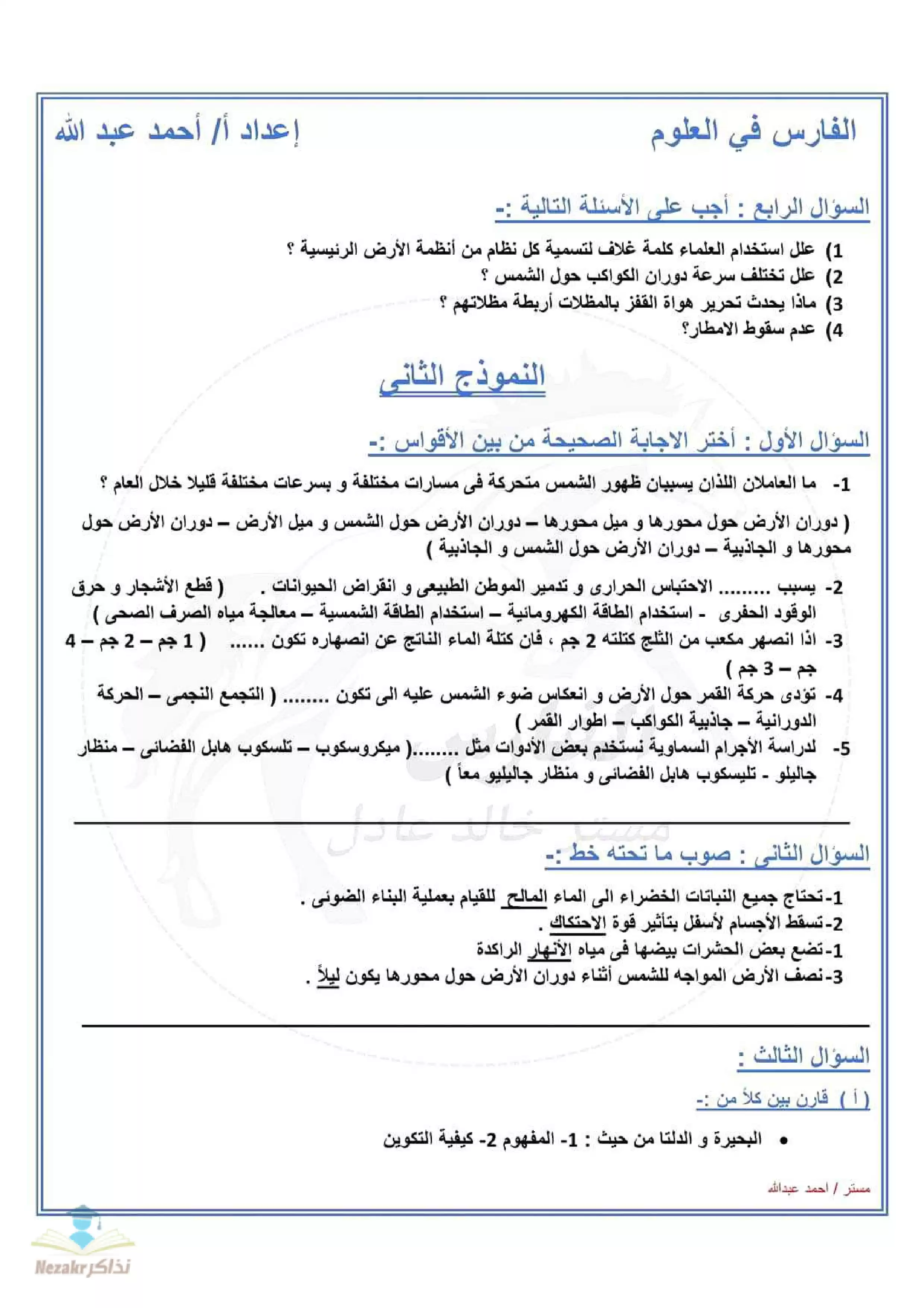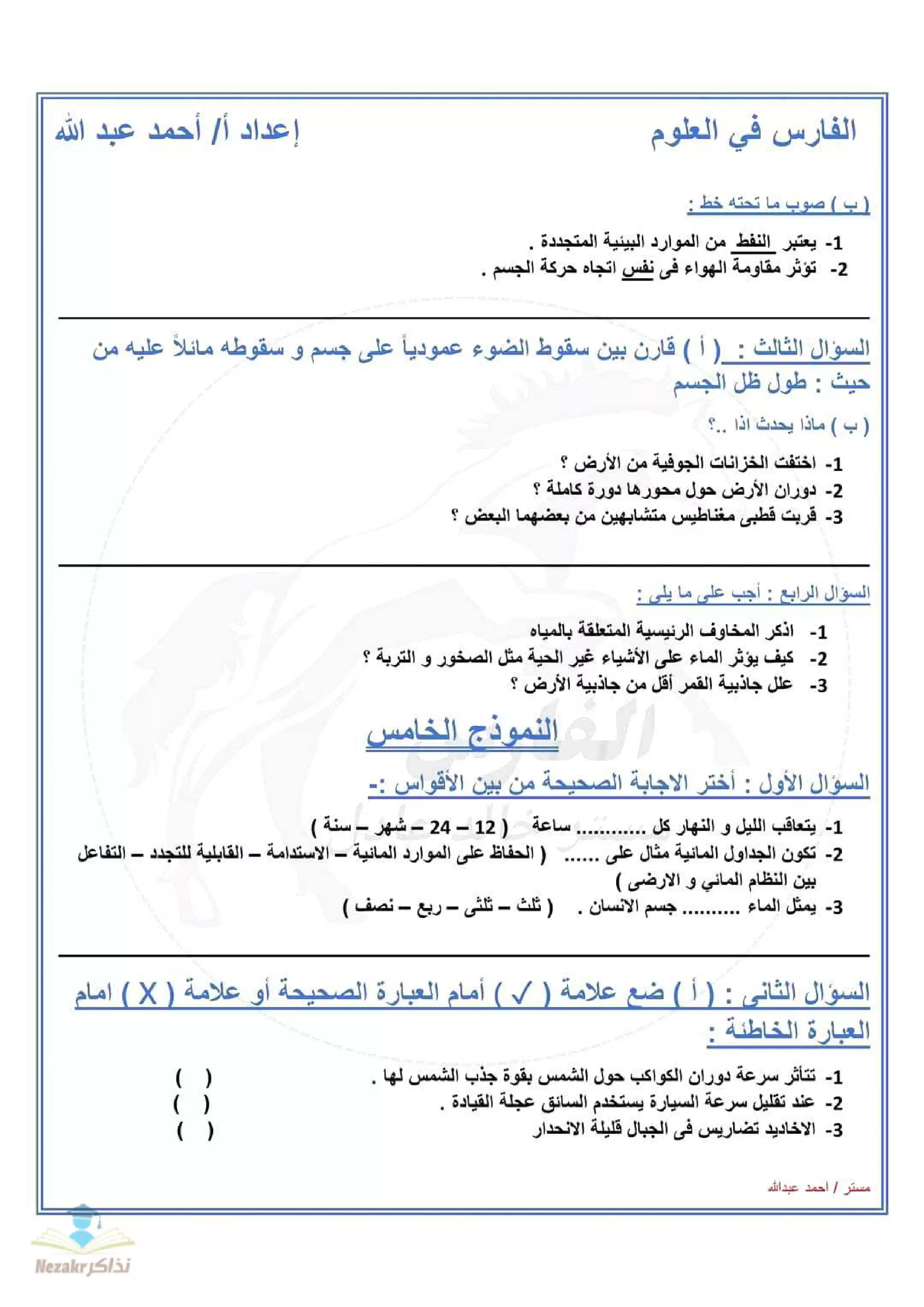 سكرين شوت من الملف: بنك أسئلة الفارس في العلوم الصف الخامس الابتدائي الترم الثاني - Nezakr