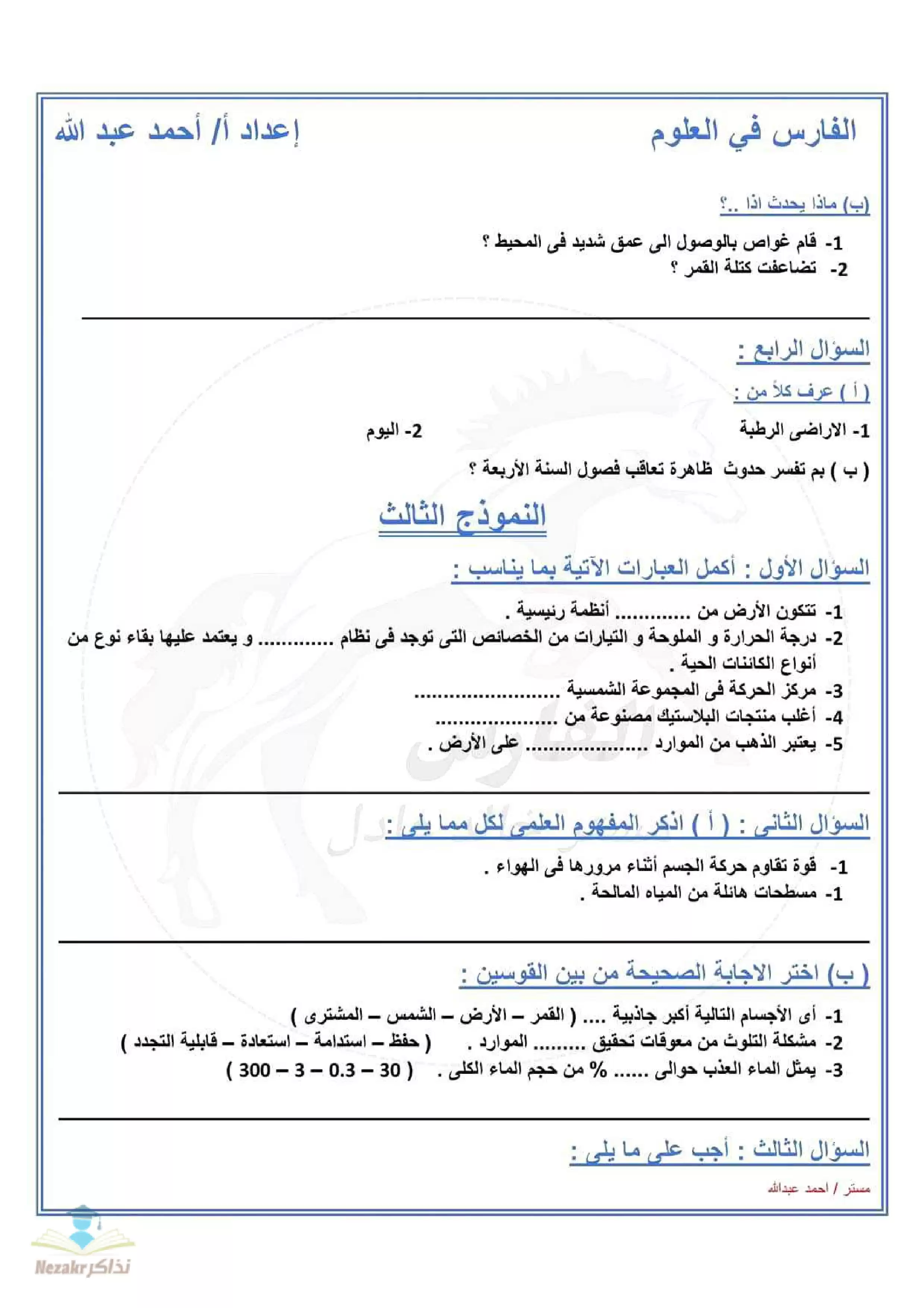 ملف المراجعة النهائية وبنك الأسئلة لمادة العلوم للصف الخامس الابتدائي من الفارس من إعداد: أ. أحمد عبدالله