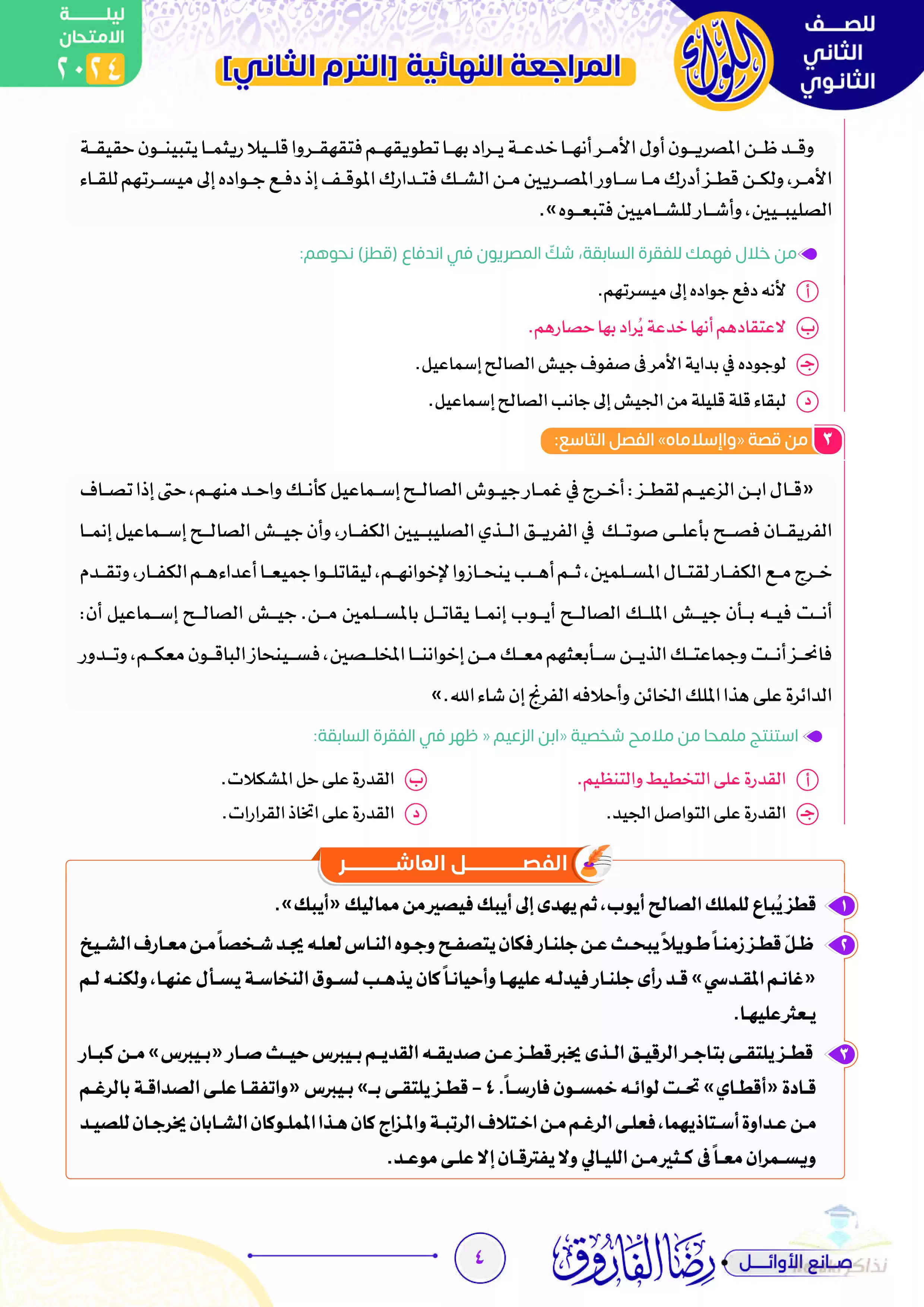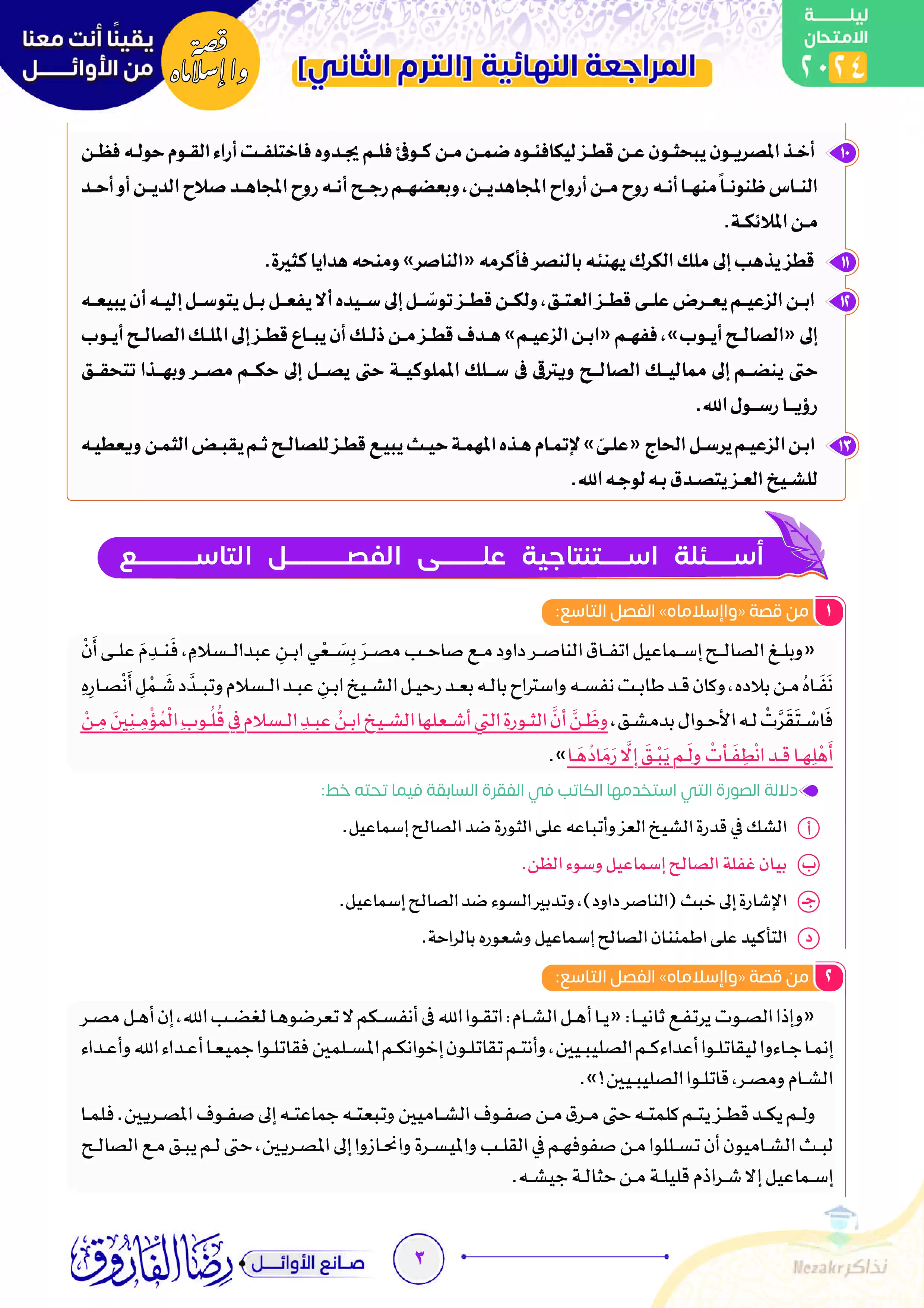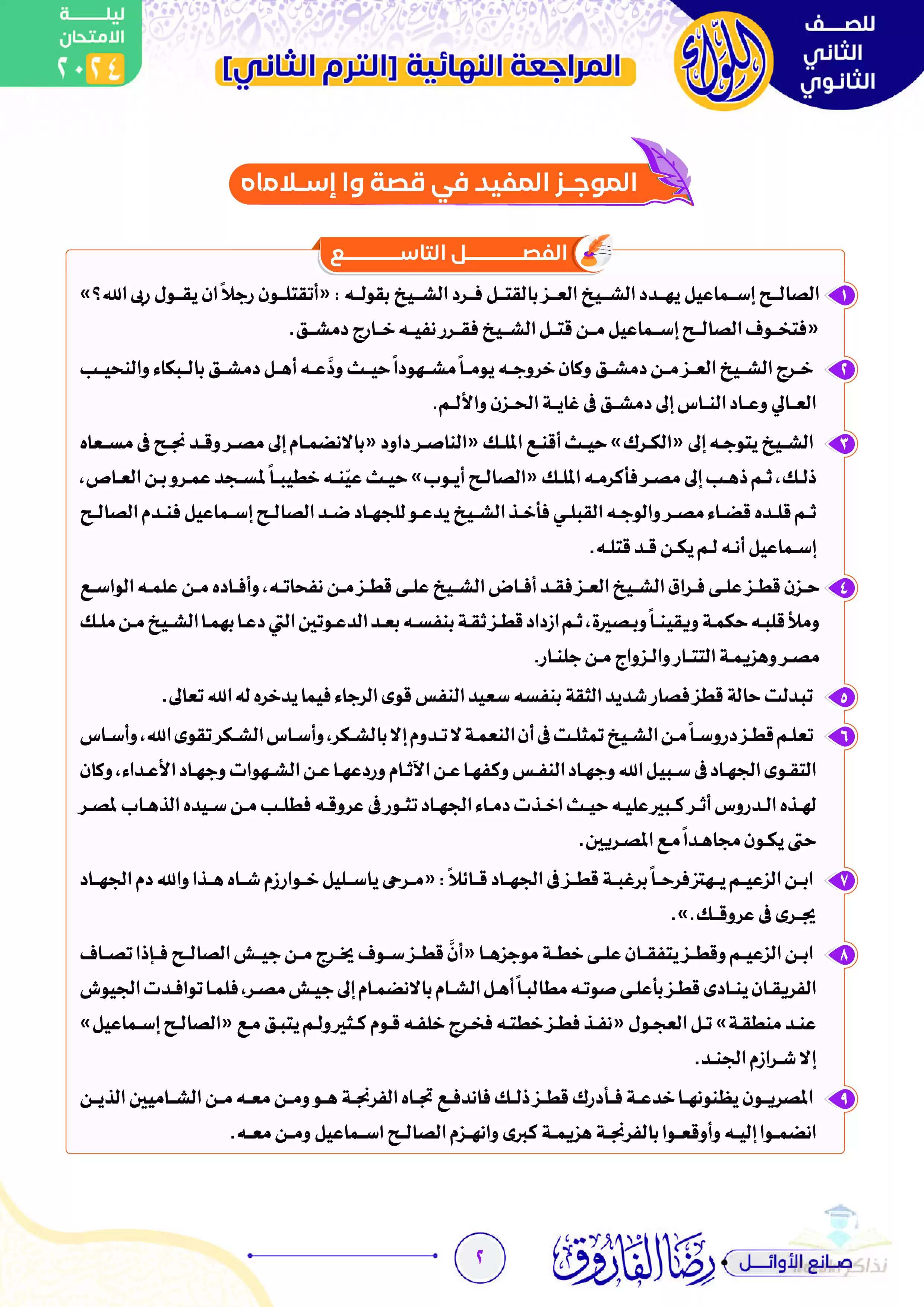 أسئلة مهمة جداً ليلة الامتحان في قصة واإسلاماه تانية ثانوي الفصل الدراسي الثاني من إعداد رضا الفاروق
