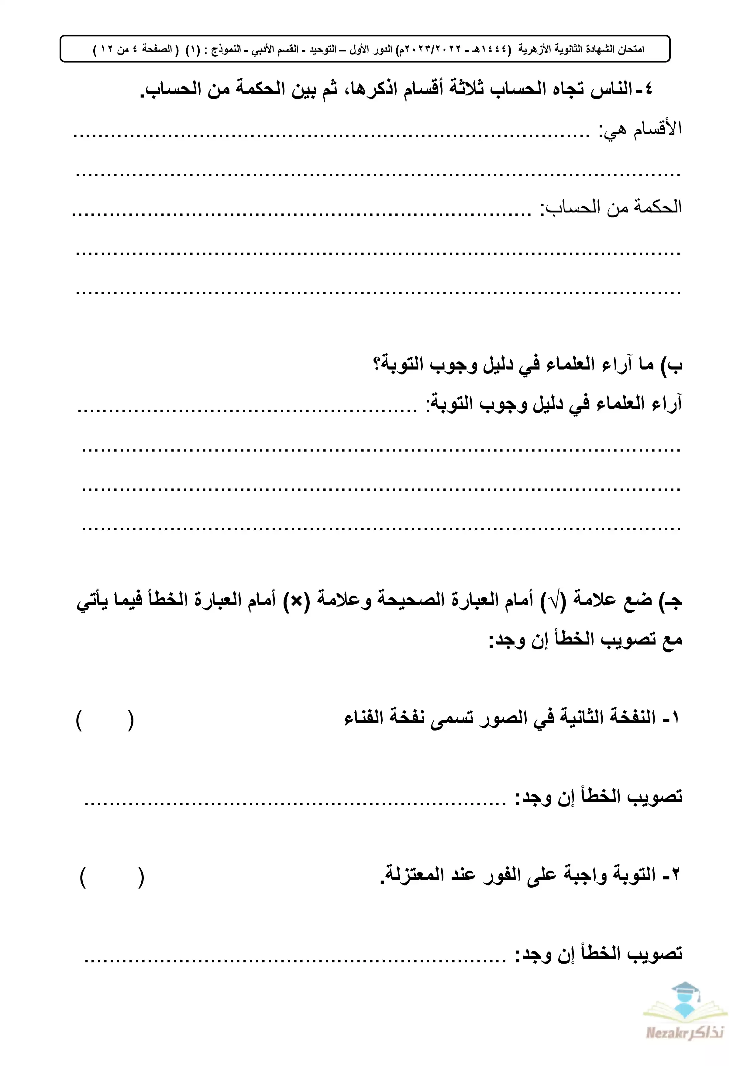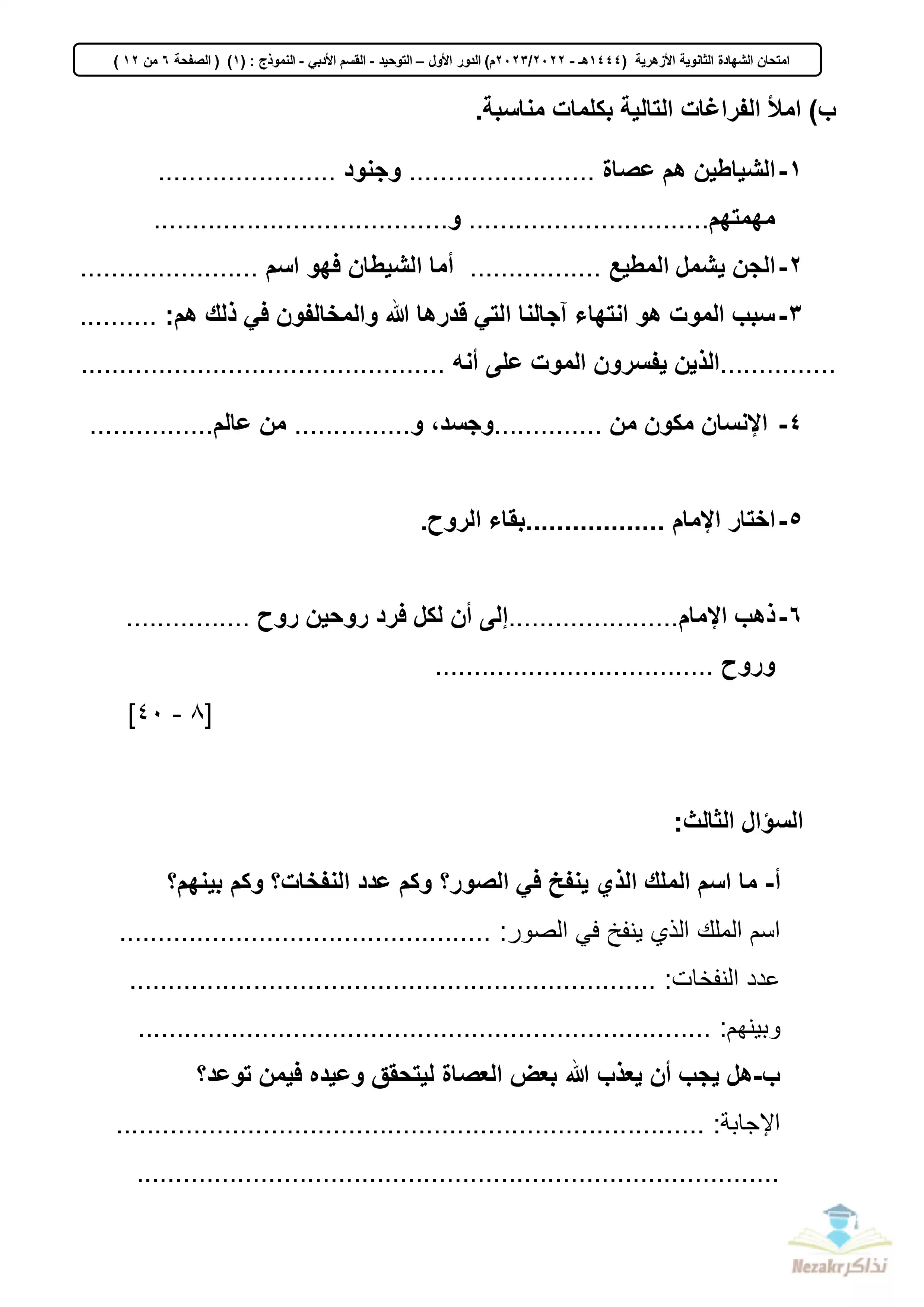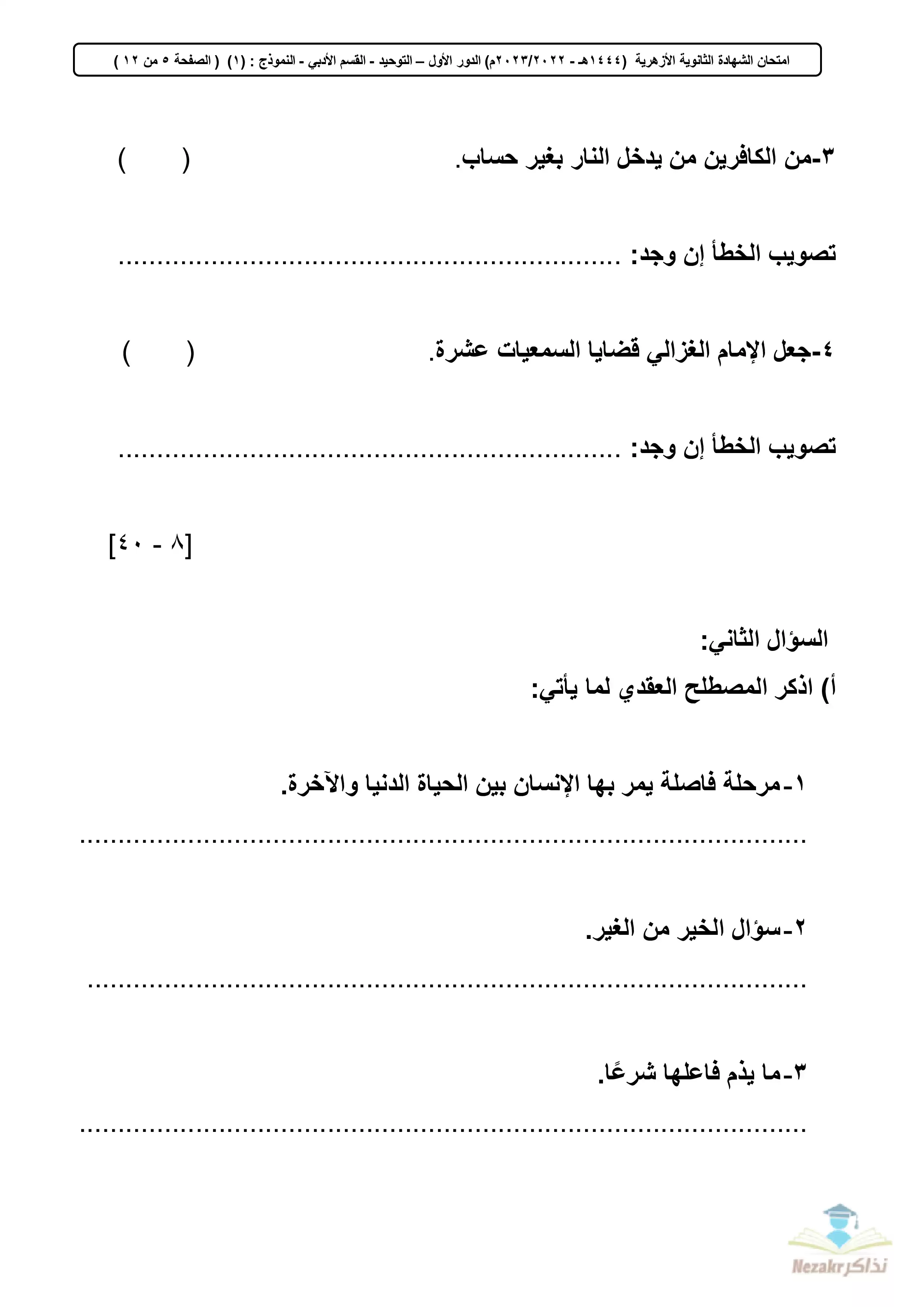 تجميع الامتحان التجريبي في المواد الشرعية للثانوية الأزهرية القسم الأدبي 2023 - Nezakr