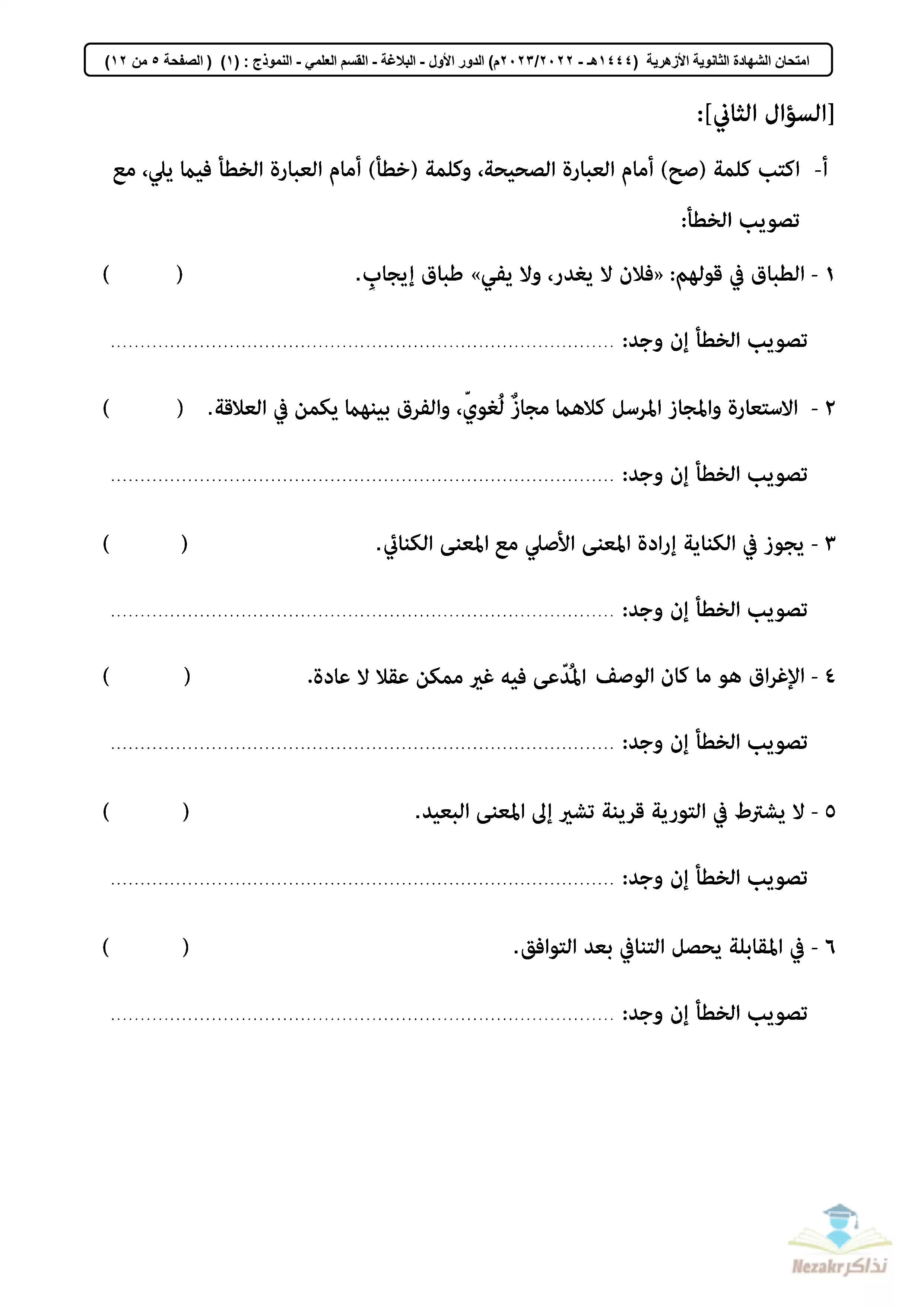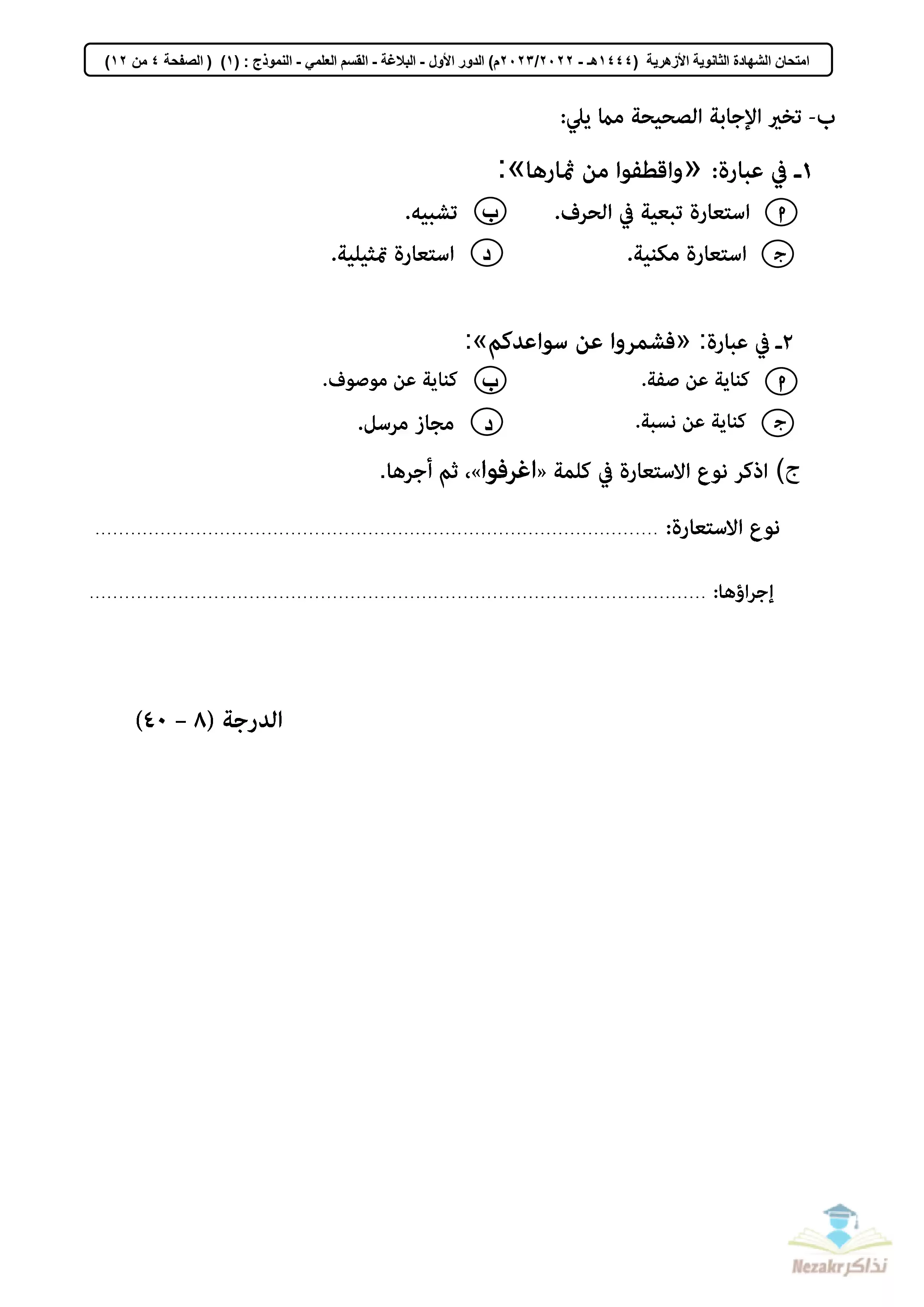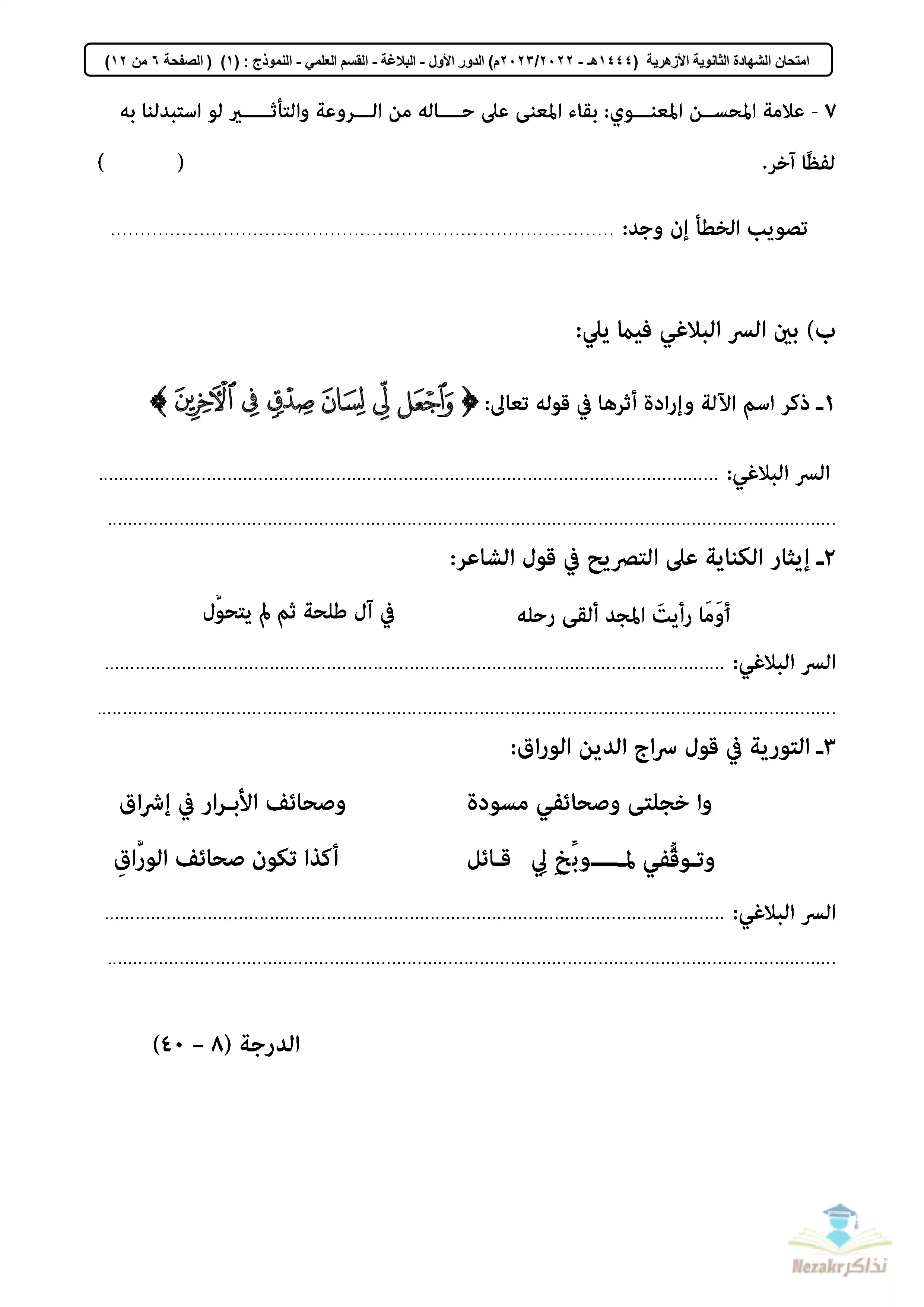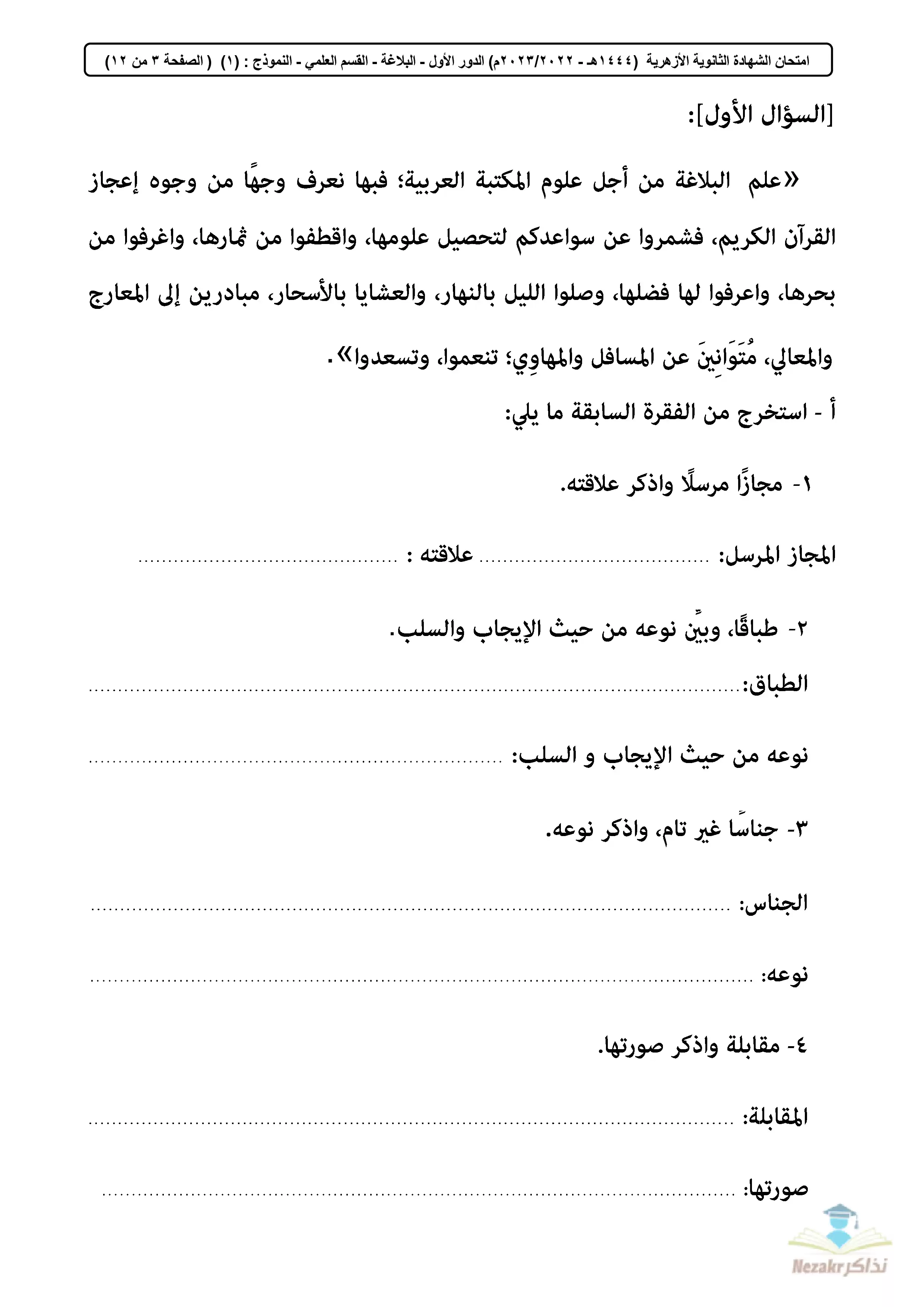 1. امتحان بوكليت البلاغة الاسترشادي للصف الثالث الثانوي الأزهري شعبة العلمي 2023