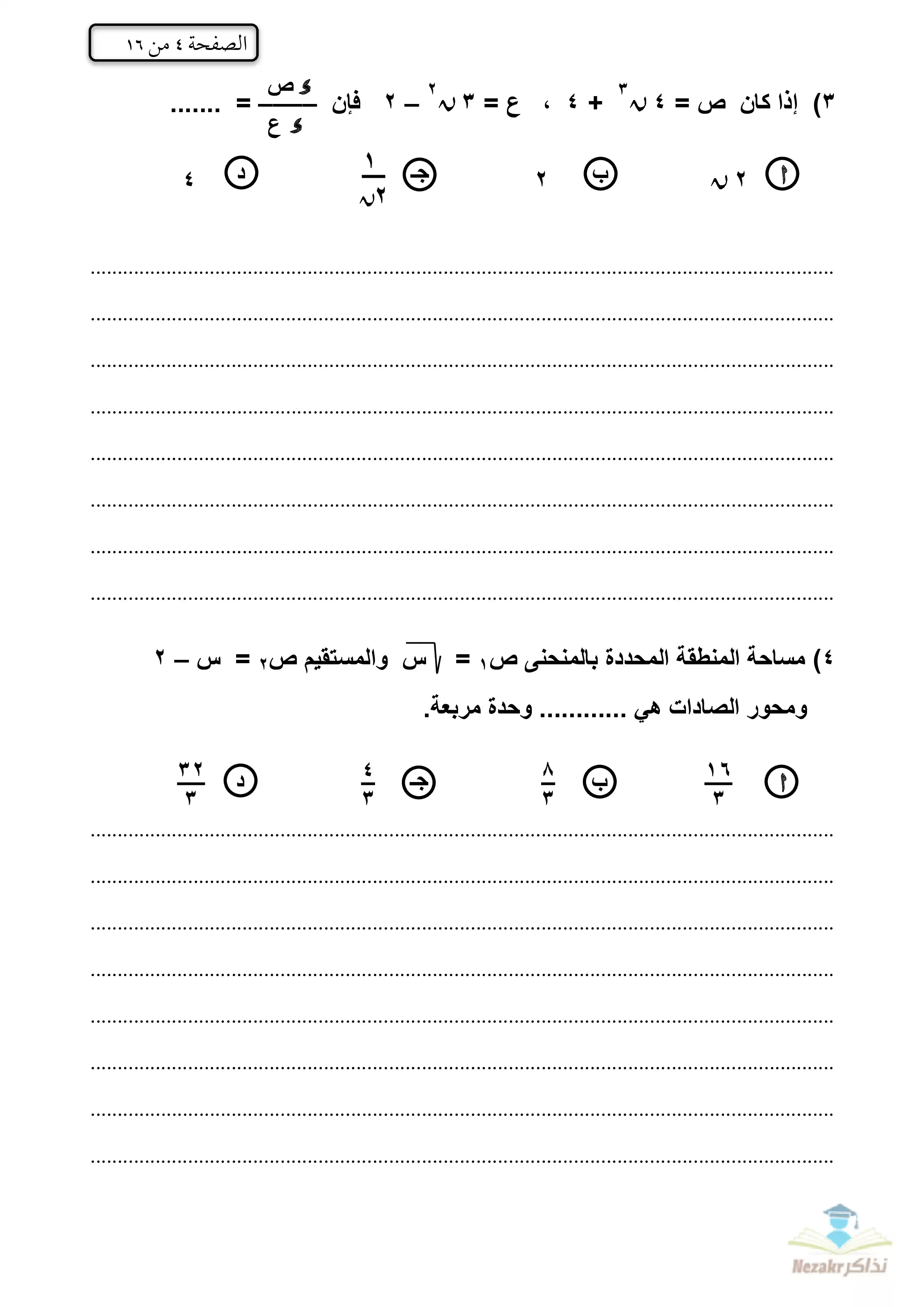 صفحة 4 من 16 صفحة من ملف: الامتحان التجريبي في التفاضل والتكامل للشهادة الثانوية الأزهرية 2023 - Nezakr